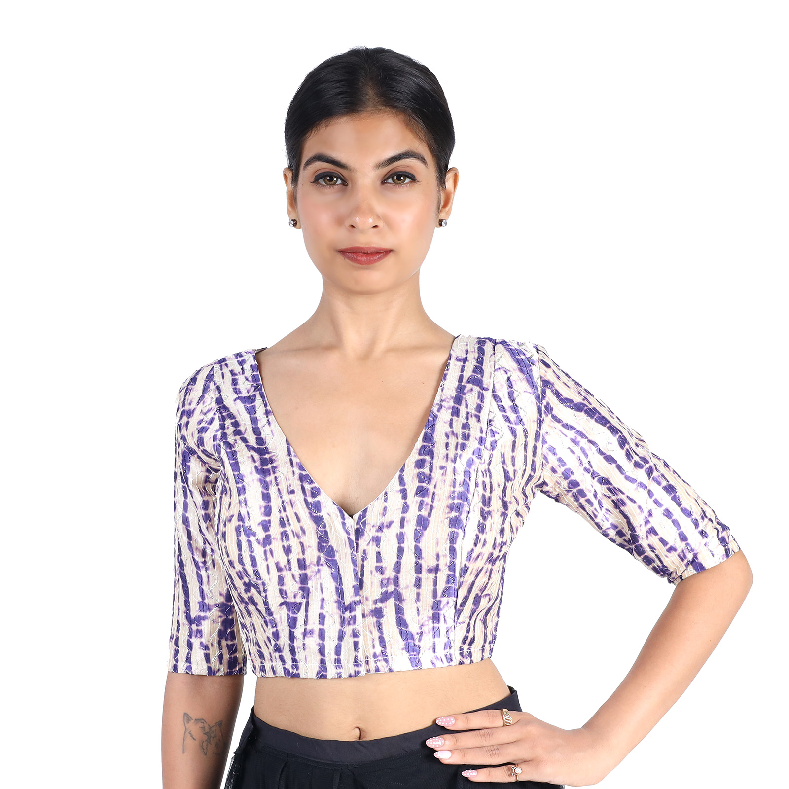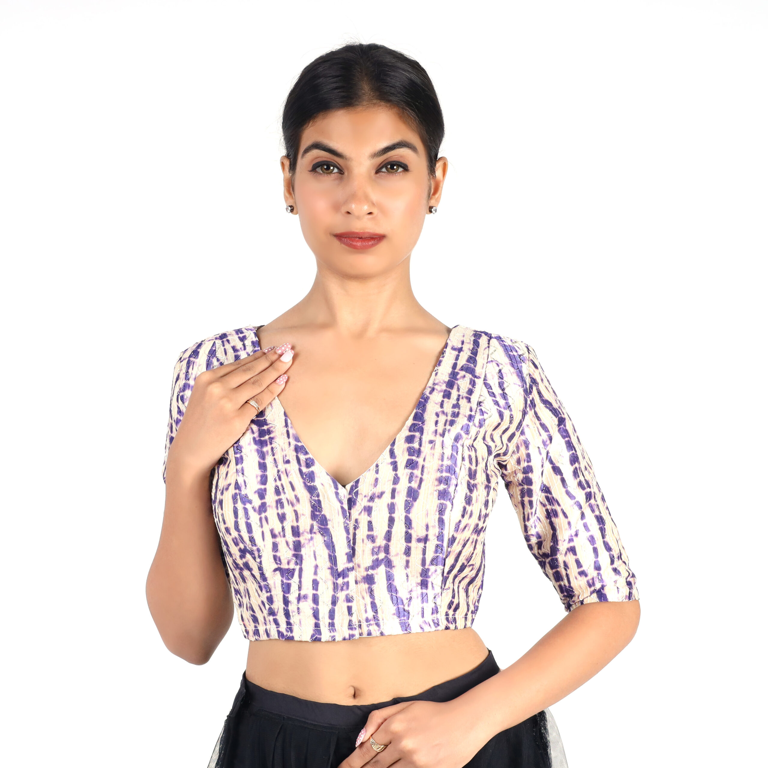 Add a splash of color and charm to your ethnic wardrobe with the Art Silk Purple Tie-Dye Printed V-Neck Blouse for Women by India Blouse. Made from premium art silk with soft cotton lining, this blouse ensures breathability and comfort while keeping you stylish. The trendy Art Silk Purple Tie-Dye Printed V-Neck Blouse for Women gives it a festive yet contemporary appeal. Its non-padded design offers a natural fit, while the short sleeves and front hook-and-eye opening make it both functional and fashionable. Perfect for weddings, festivals, parties, and casual gatherings, this versatile blouse pairs beautifully with plain, printed, or embroidered sarees, making it a must-have in every womanās collection.