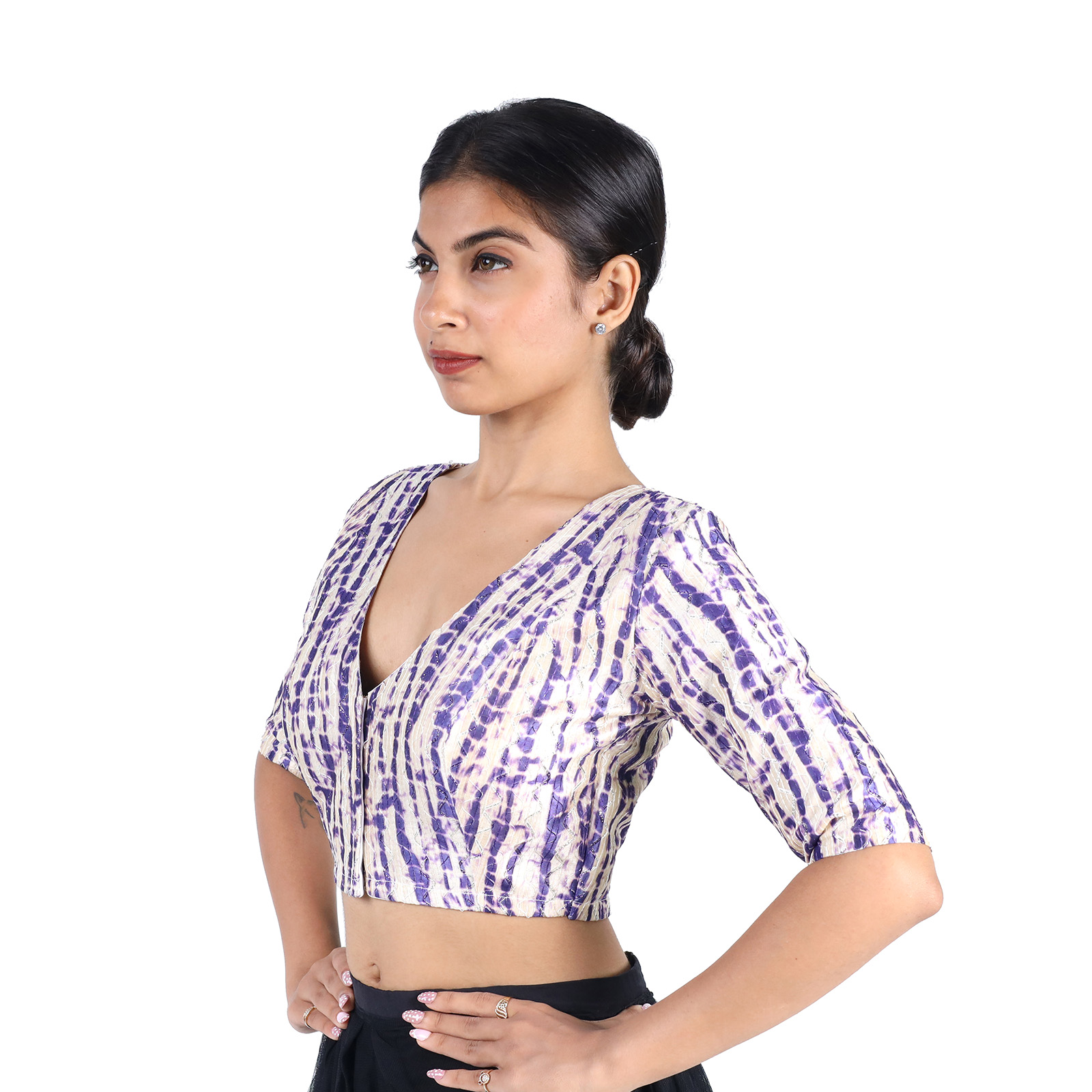 Step into style with this Art Silk Purple Tie-Dye Printed V-Neck Blouse for Women, crafted in art silk with cotton lining for a blend of elegance and comfort. Featuring short sleeves, a classic V neckline, and a front hook closure, this blouse by India Blouse is perfect for sarees, lehengas, and festive wear.