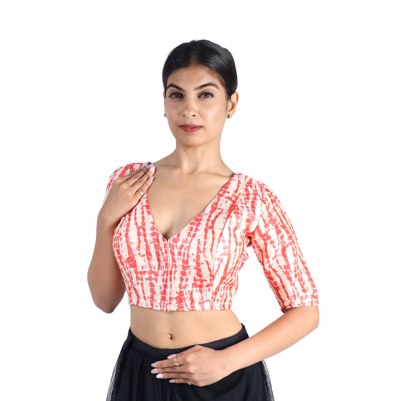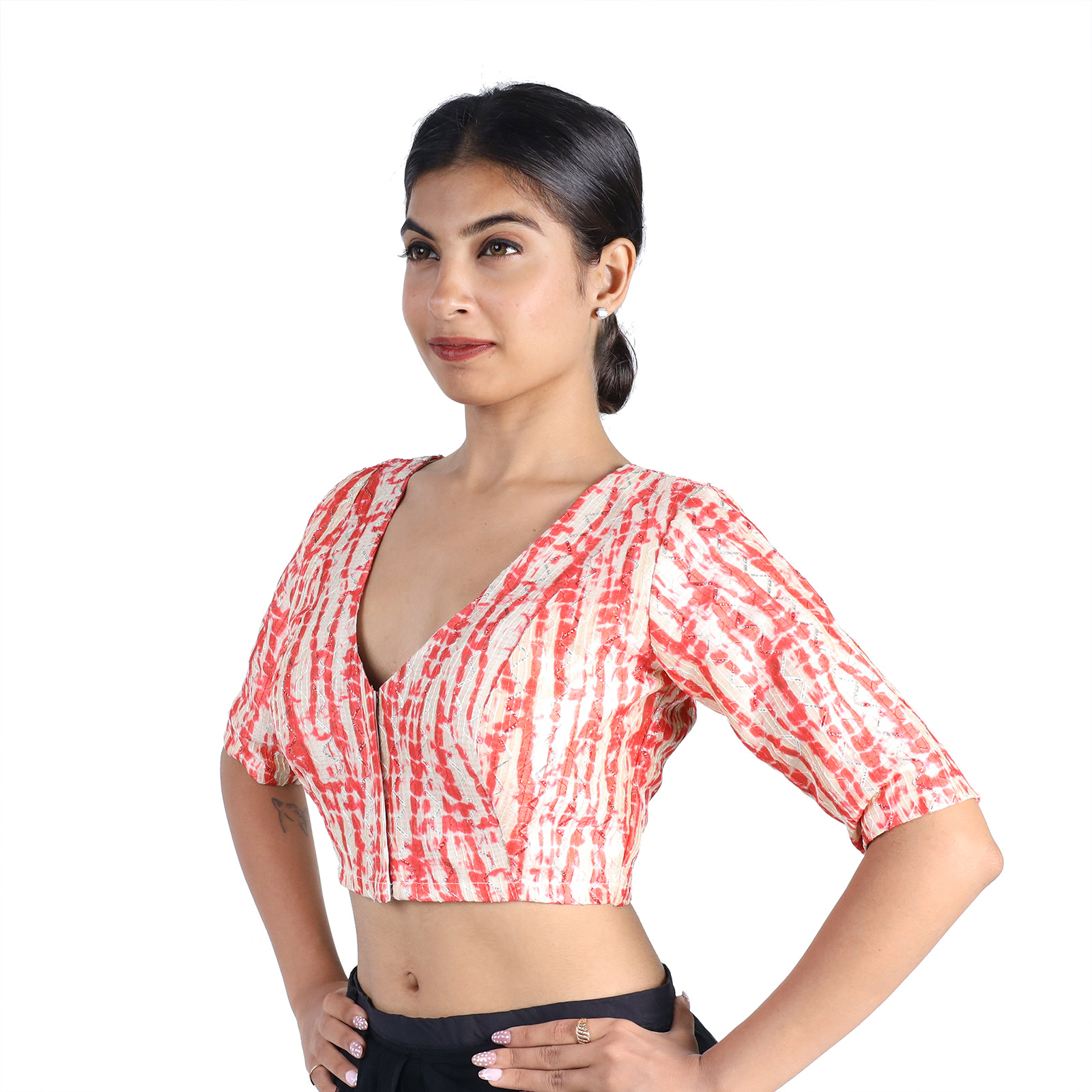 Step into the spotlight with the Art Silk Red Tie-Dye Printed V-Neck Saree Blouse for Women by IndiaĀ Blouse ā where tradition meets modern elegance. Crafted from premium art silk with soft cotton lining, this blouse provides both comfort and durability. The bold red tie-dye print creates a festive and eye-catching appeal, while the V-neckline flatters all body shapes. Its short sleeves and front hook-and-eye closure make it practical, secure, and easy to wear. This Art Silk Red Tie-Dye Printed V-Neck Saree Blouse Perfect for weddings, festive occasions, haldi, mehendi, sangeet, and parties, this blouse complements plain, designer, or embroidered sarees. Its versatile design ensures youāll always look stylish and confident.