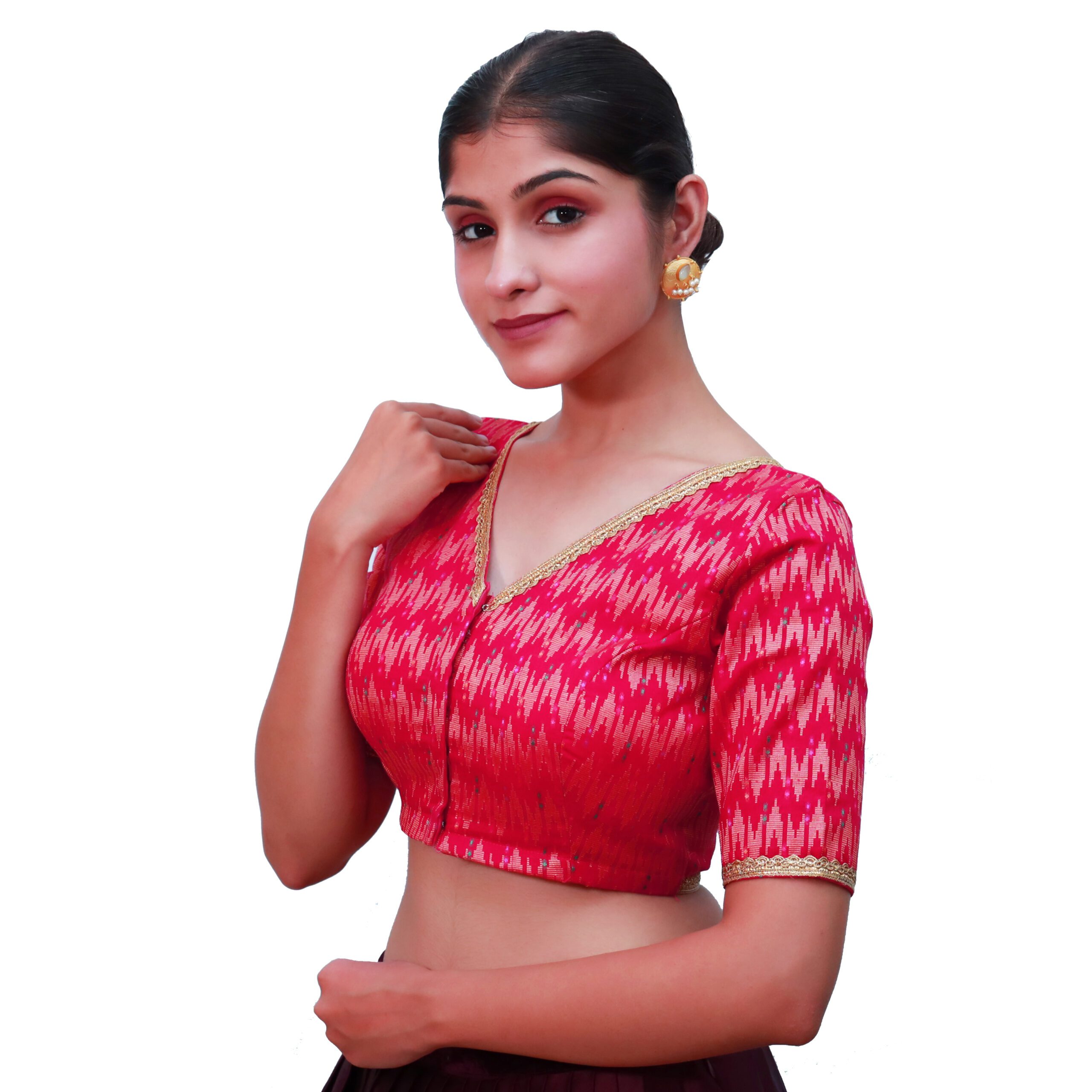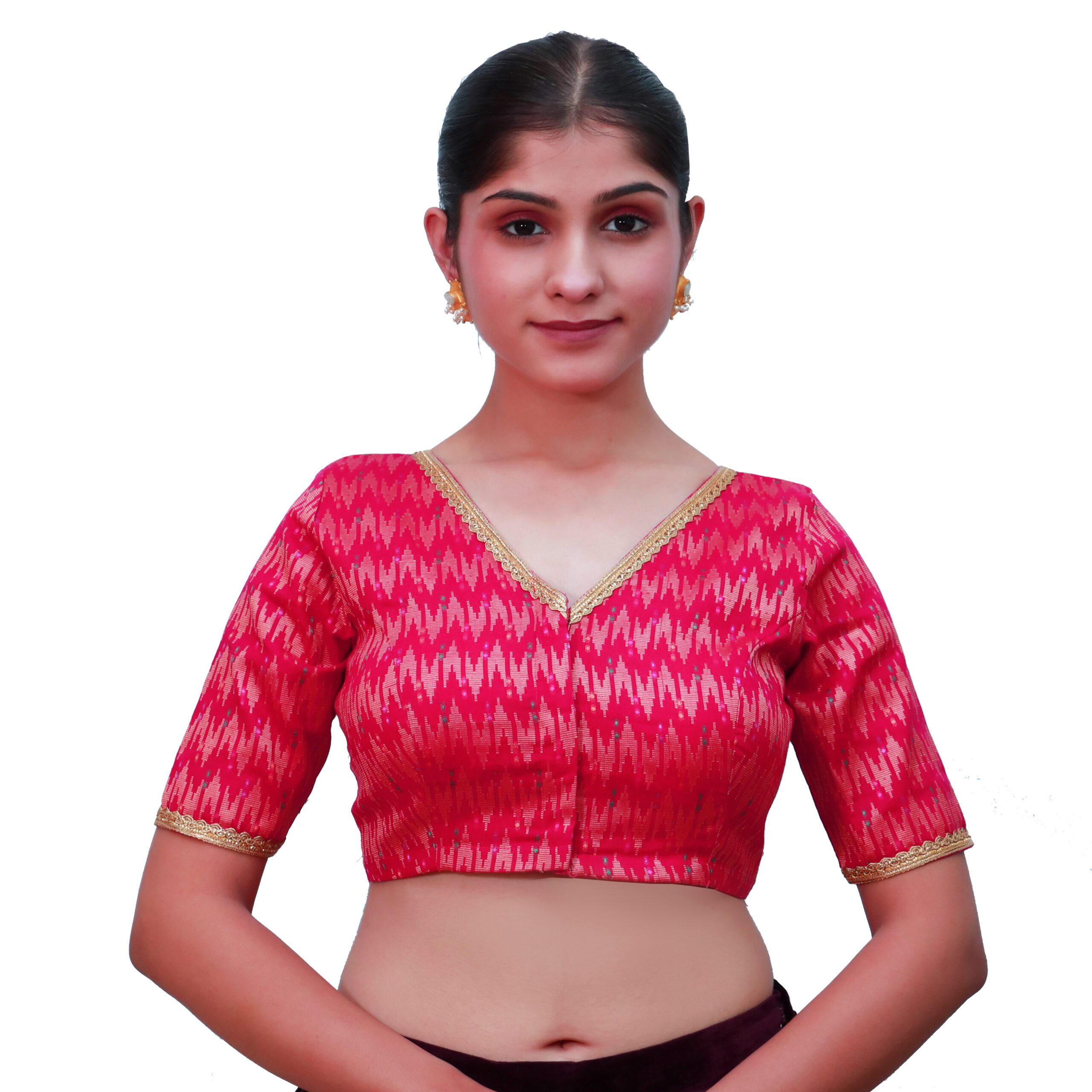 Add a pop of color to your wardrobe with the Rani pink cotton v-neck blouse.Ā Tailored in premium cotton fabric with a woven texture, this saree blouse ensures both comfort and style. The padded design provides a structured fit, while the V neckline and lace-embellished short sleeves bring a feminine touch. The rani pink cotton v-neck blouse front hook-and-eye opening adds ease, making it practical for any occasion. Pair this saree blouse with gold, cream, navy, or contrasting sarees for weddings, festive celebrations, or parties. Its vibrant hue and elegant finish make it a must-have blouse for women who love statement ethnic wear.