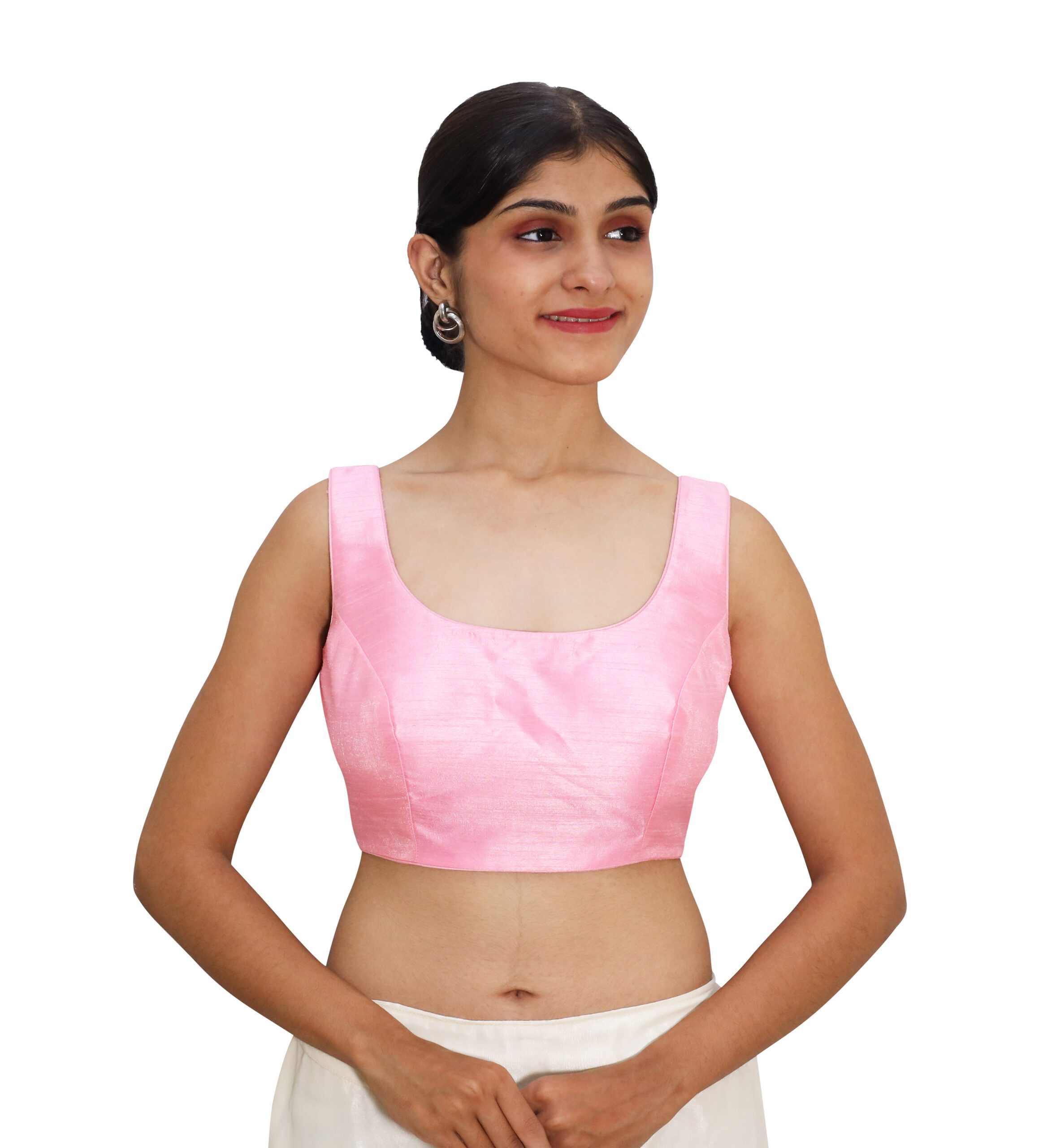 Step into charm and sophistication with the Pink Silk Round Neck Sleeveless Blouse. This Padded Saree Blouse is made by India Blouse. Crafted from premium Bangalori silk, this blouse features a smooth, glossy texture with a modern appeal. The round neckline and sleeveless silhouette make it an effortless style choice, while the padded construction ensures a flattering fit. The back hook-and-eye opening adds convenience and security. Ideal for traditional occasions, festive celebrations, or party looks, this pink silk round neck sleeveless blouse pairs beautifully with contrasting sarees like green, navy, or gold, as well as matching pastel drapes for a graceful finish.