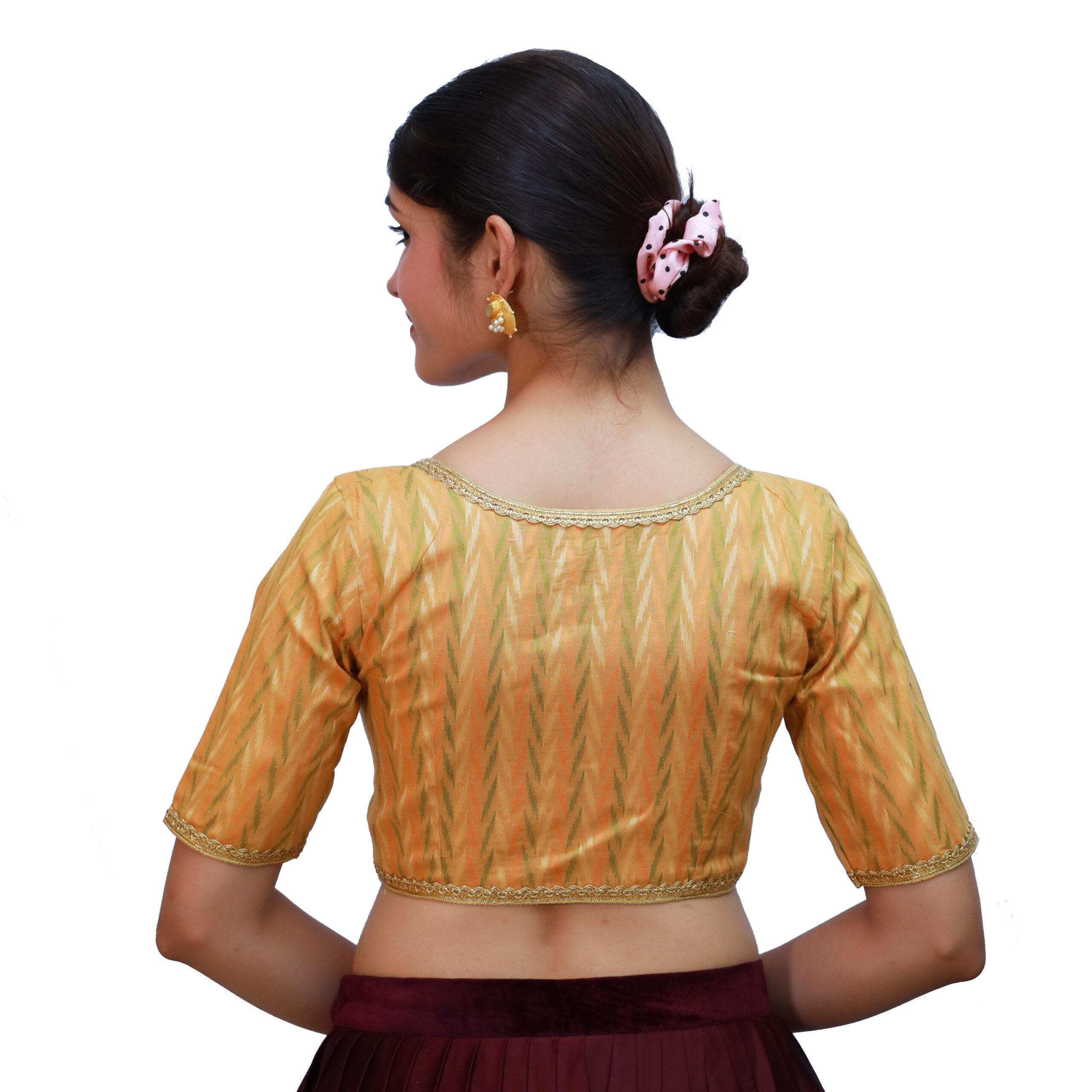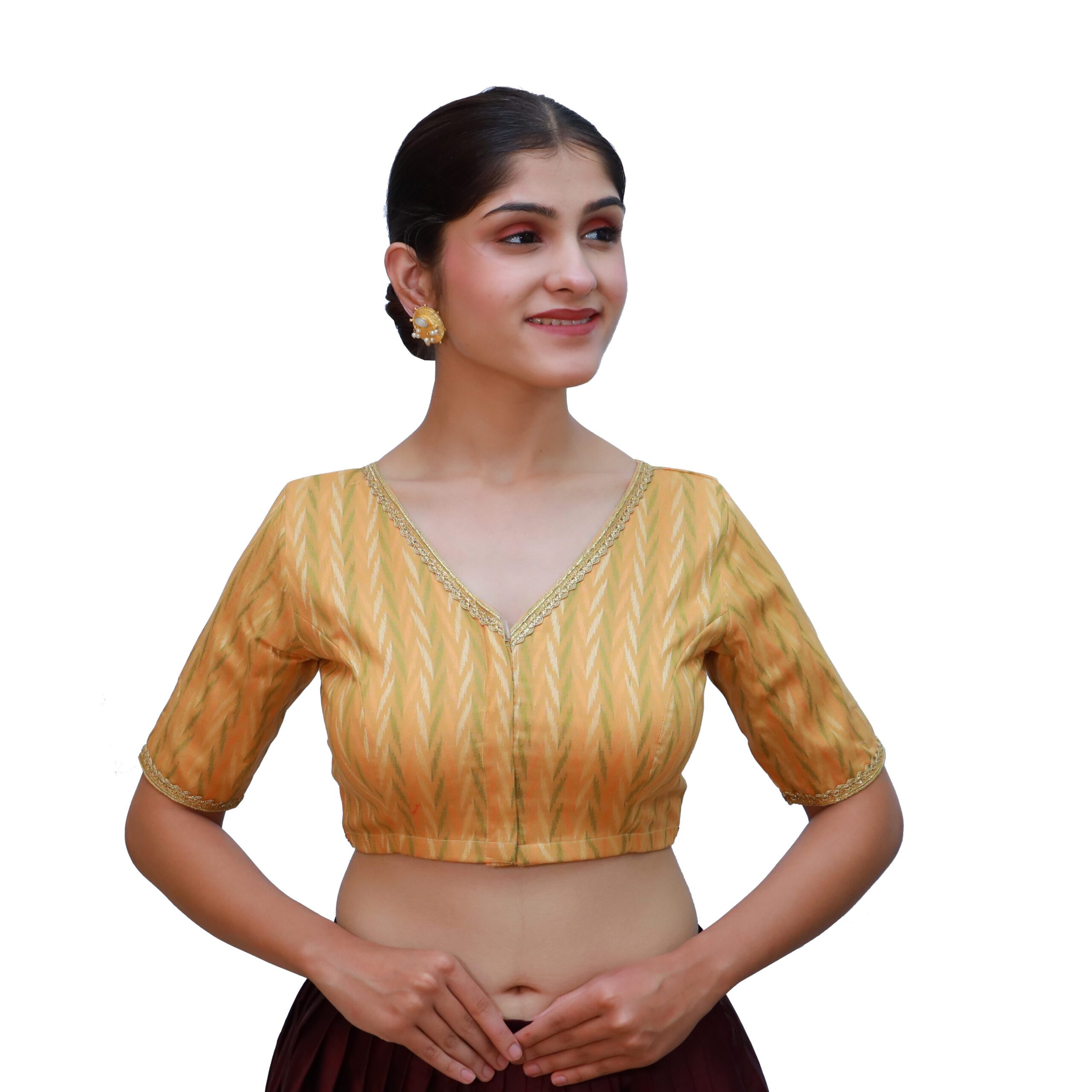 Elevate your saree look with the Mustard Cotton V-Neck Blouse Short Sleeve Saree Blouses by India Blouse. Made fromĀ premium cotton fabric with a woven texture, this blouse offers a perfect blend ofĀ comfort, durability, and style. TheĀ padded fitĀ ensures a flattering silhouette, while theĀ V-necklineĀ adds a chic touch. TheĀ short sleeves feature lace embellishments, enhancing its traditional appeal. With a convenientĀ front hook-and-eye closure, this blouse is easy to wear and secure. Pair it with sarees in contrasting shades like green, maroon, navy, or gold for a stunning appearance. Mustard Cotton V-Neck Blouse. It’s perfect for festivals, weddings, receptions, and parties.