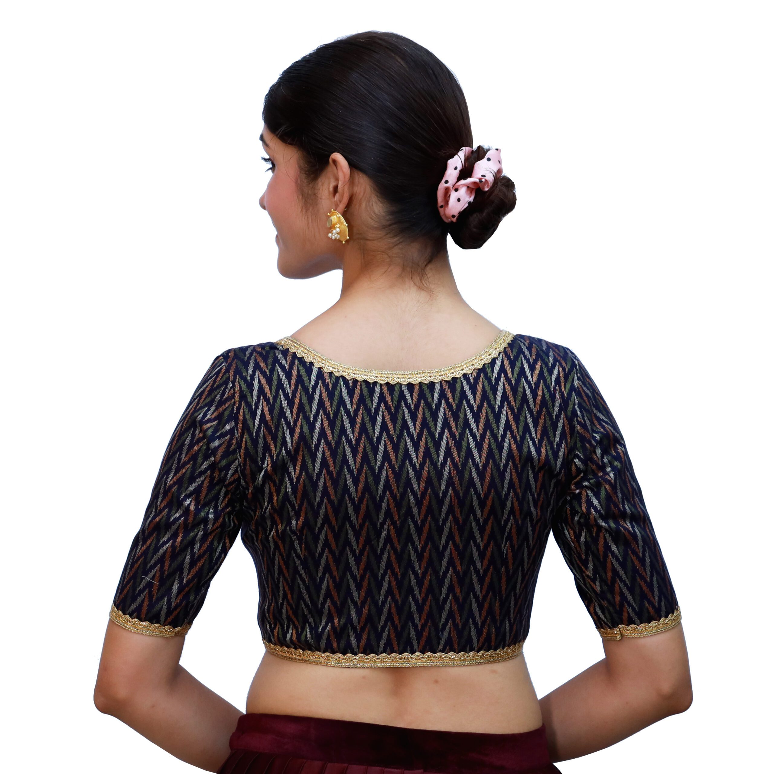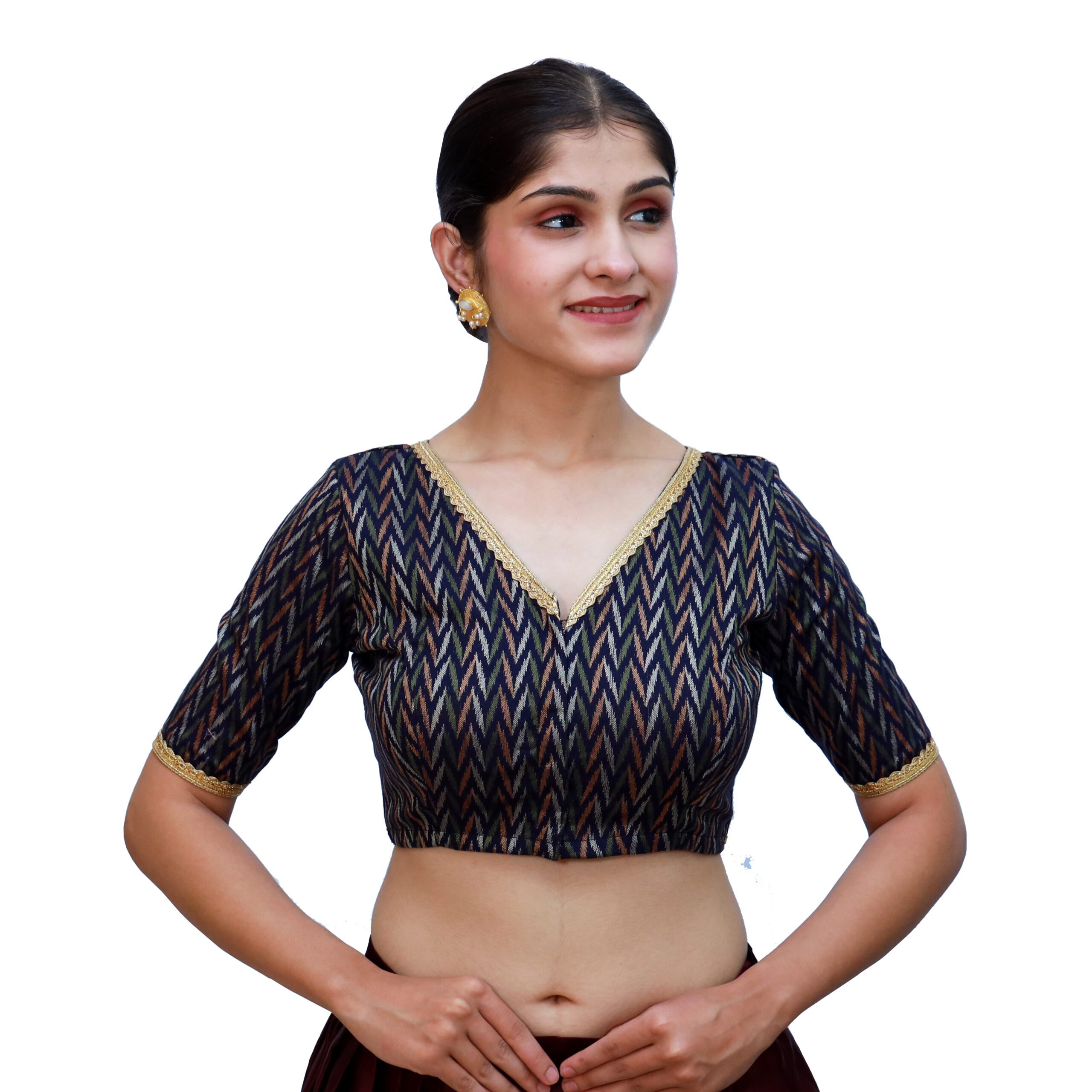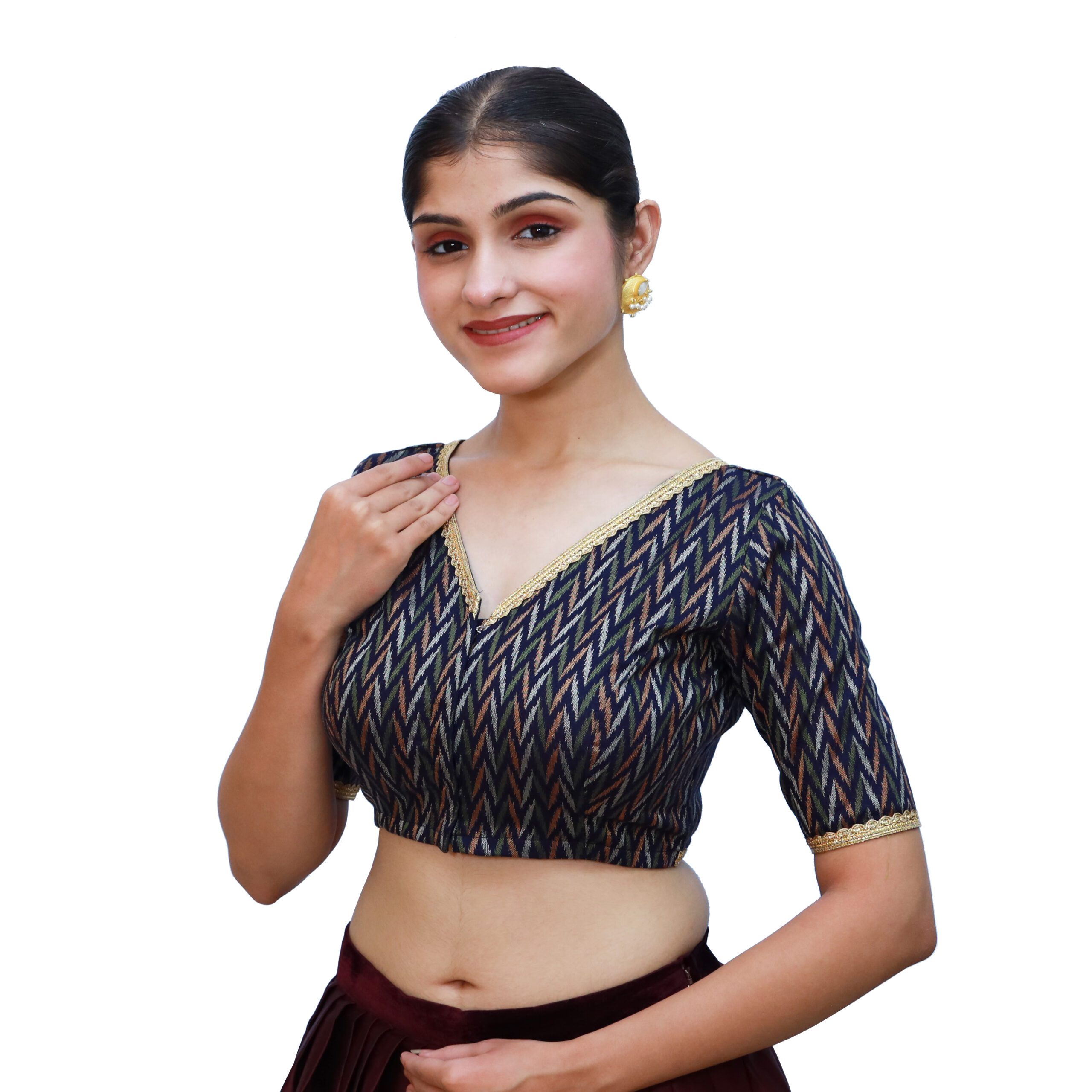 Experience timeless elegance with the Navy Blue Cotton V Neck Blouse. This Sleeve Blouse is from India BlouseĀ Made fromĀ premium cotton fabric with a woven texture, this blouse featuresĀ padded supportĀ for a perfect fit. TheĀ classic V neckline,Ā combined withĀ lace-embellished short sleeves, creates a sophisticated yet festive look. This navy blue cotton v neck blouse is designed with a front hook-and-eye closure, which offers convenience and ease of wear. Effortlessly pair it with sarees in gold, red, cream, or contrasting shades for weddings, festivals, and traditional gatherings. This blouse is an essential addition to your ethnic wardrobe.