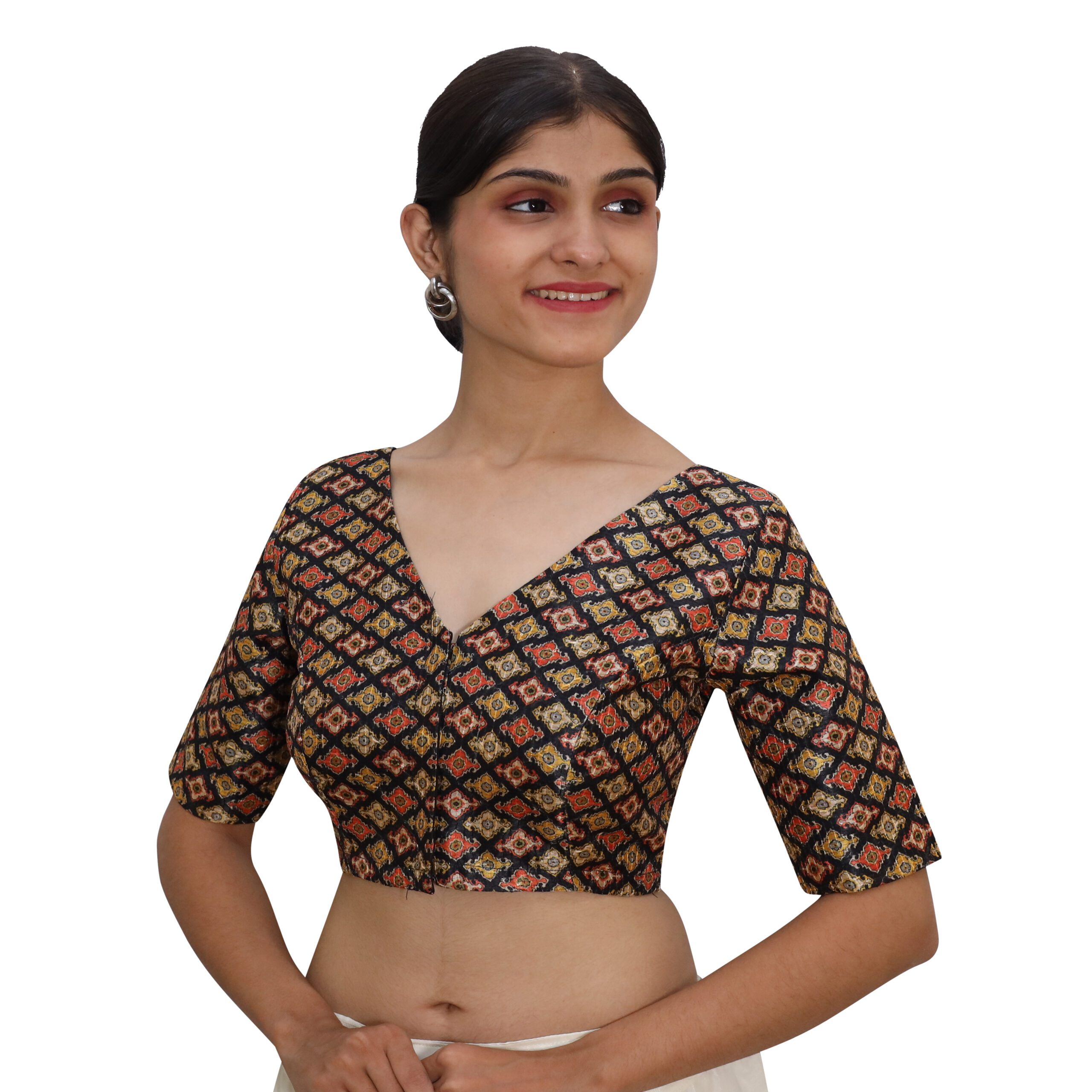 This black print v neck blouse for women is designed in a non-padded style. This saree blouse is lightweight and perfect for extended wear, keeping you comfortable through every celebration. The front hook and eye opening ensures easy wearability and a secure fit. Pair this elegant black print blouse with silk, chiffon, cotton, or georgette sarees for festive events, parties, or even daily ethnic styling.