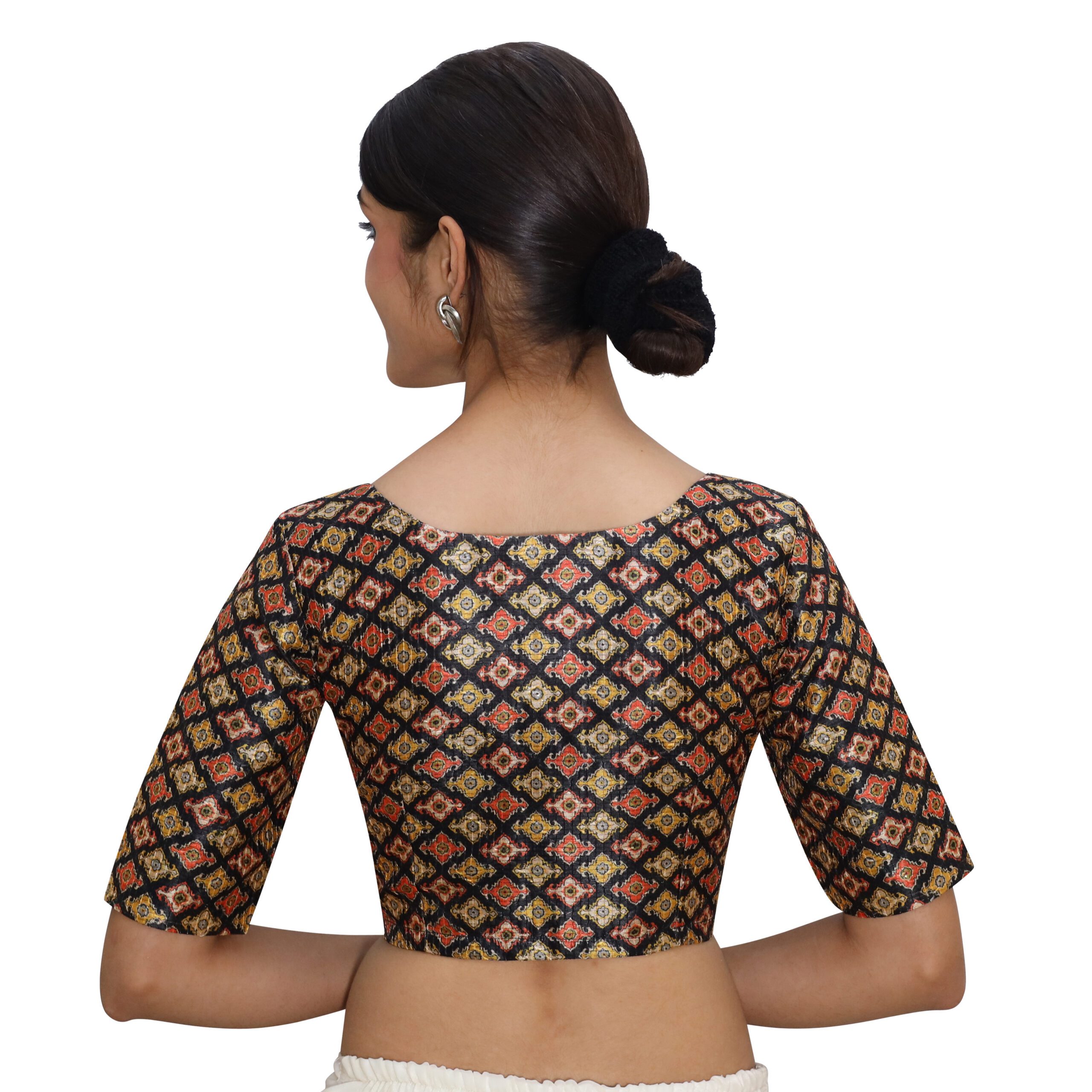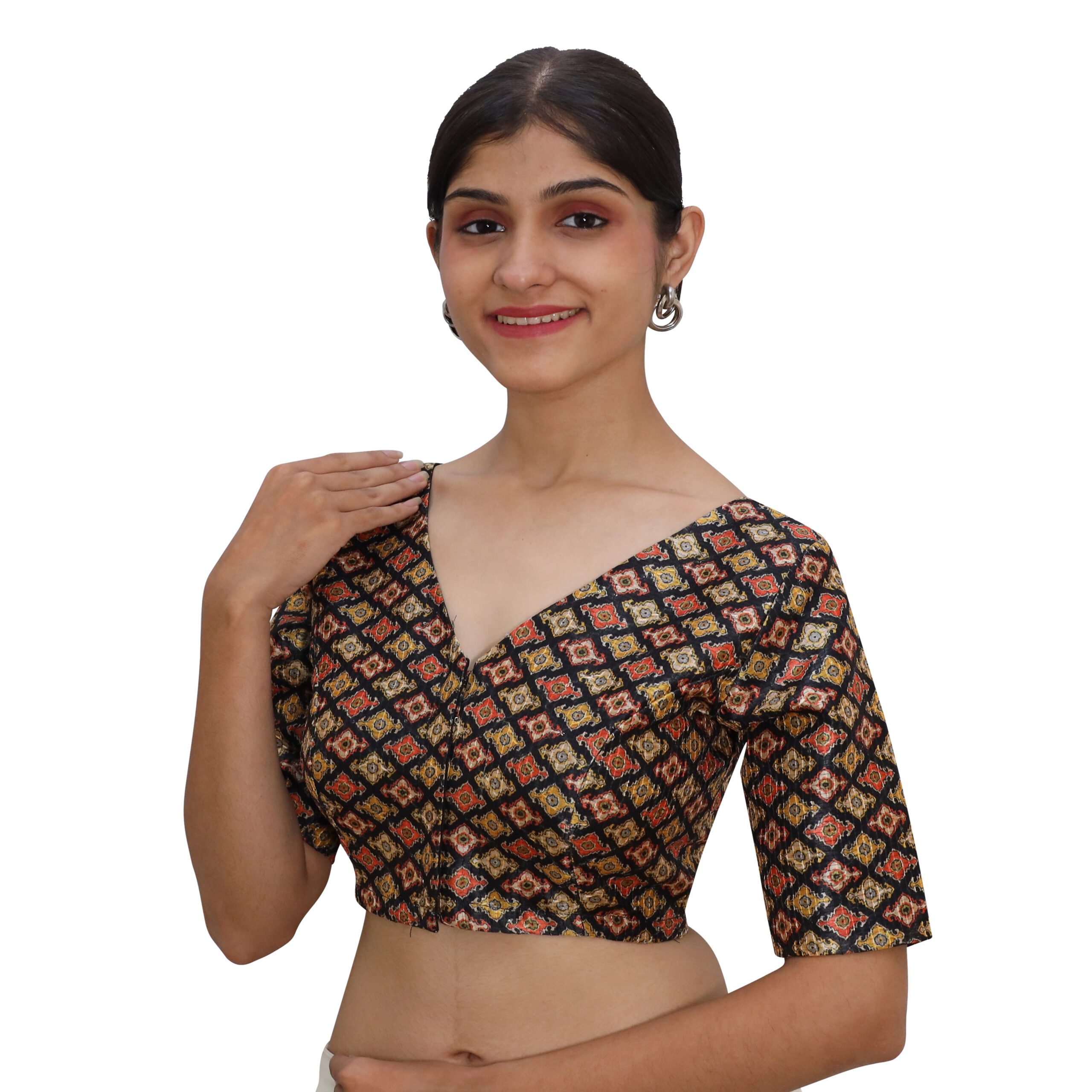 Product Name: Elegant Black Print V Neck Blouse | Embroidered Saree Blouse