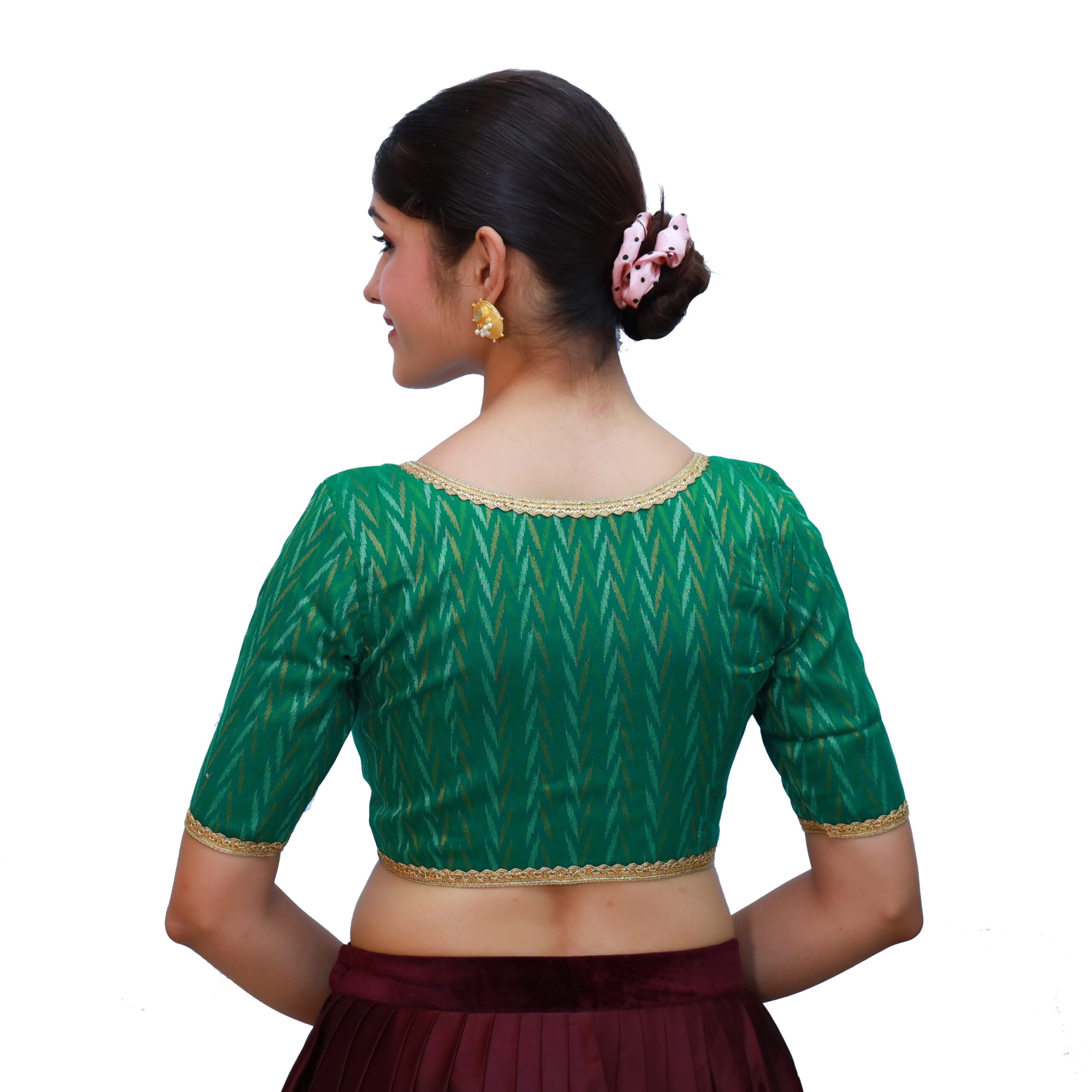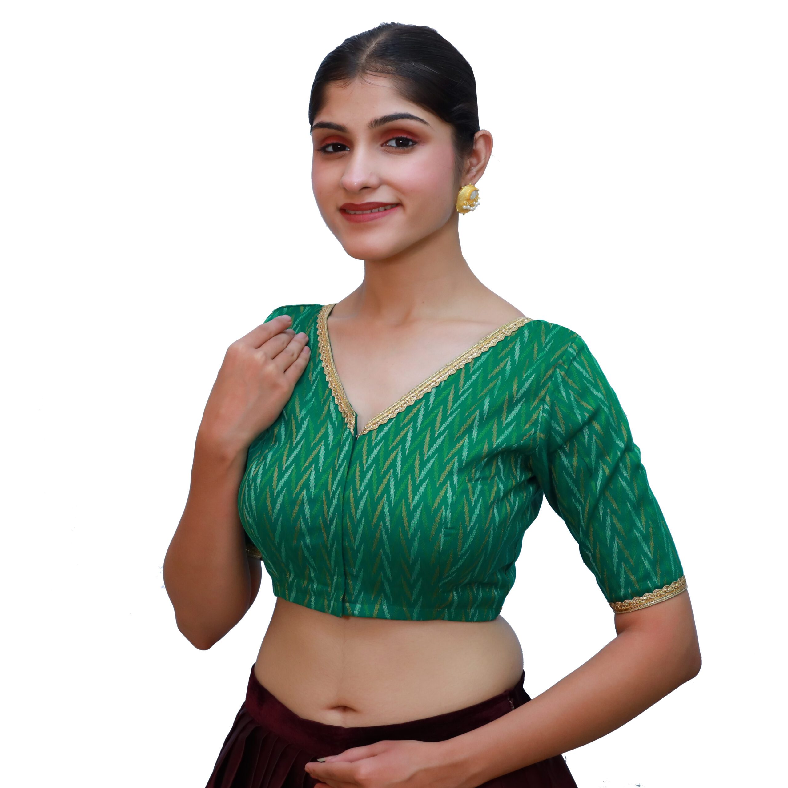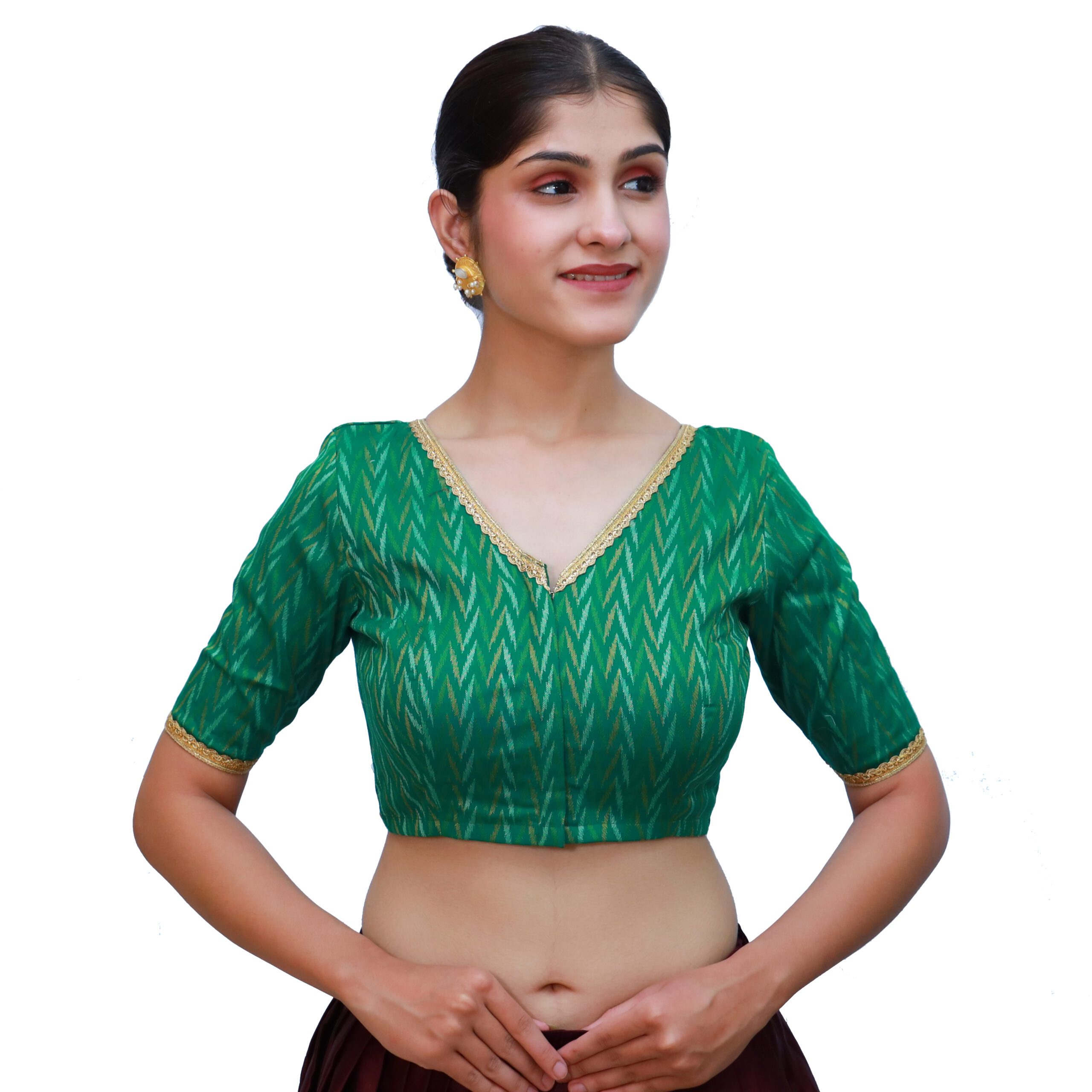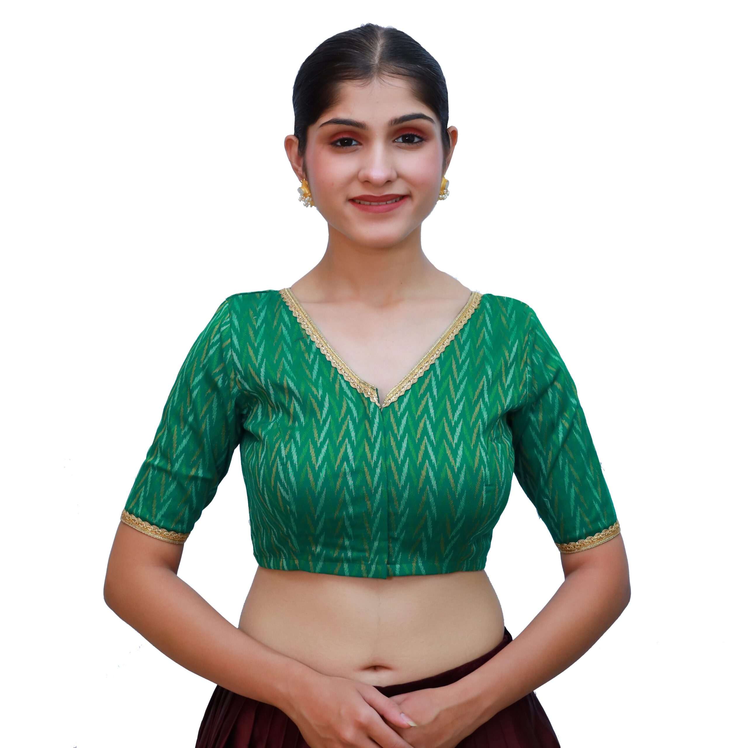 Elevate your ethnic style with the Cotton Green V-Neck Blouse, Short Sleeve Saree Blouses from India Blouse. Made from premium cotton fabric with a woven texture, this blouse is designed with padded support for comfort and a graceful fit. The classic V neckline and lace-detailed short sleeves add a chic and festive charm, while the front hook-and-eye opening makes it convenient to wear. Cotton Green V-Neck Blouse is perfect for pairing with sarees in yellow, maroon, beige, gold, or contrasting tones. This versatile Cotton Green V-Neck BlouseĀ versatile blouse is an ideal pick for weddings, festivals, and traditional gatherings.