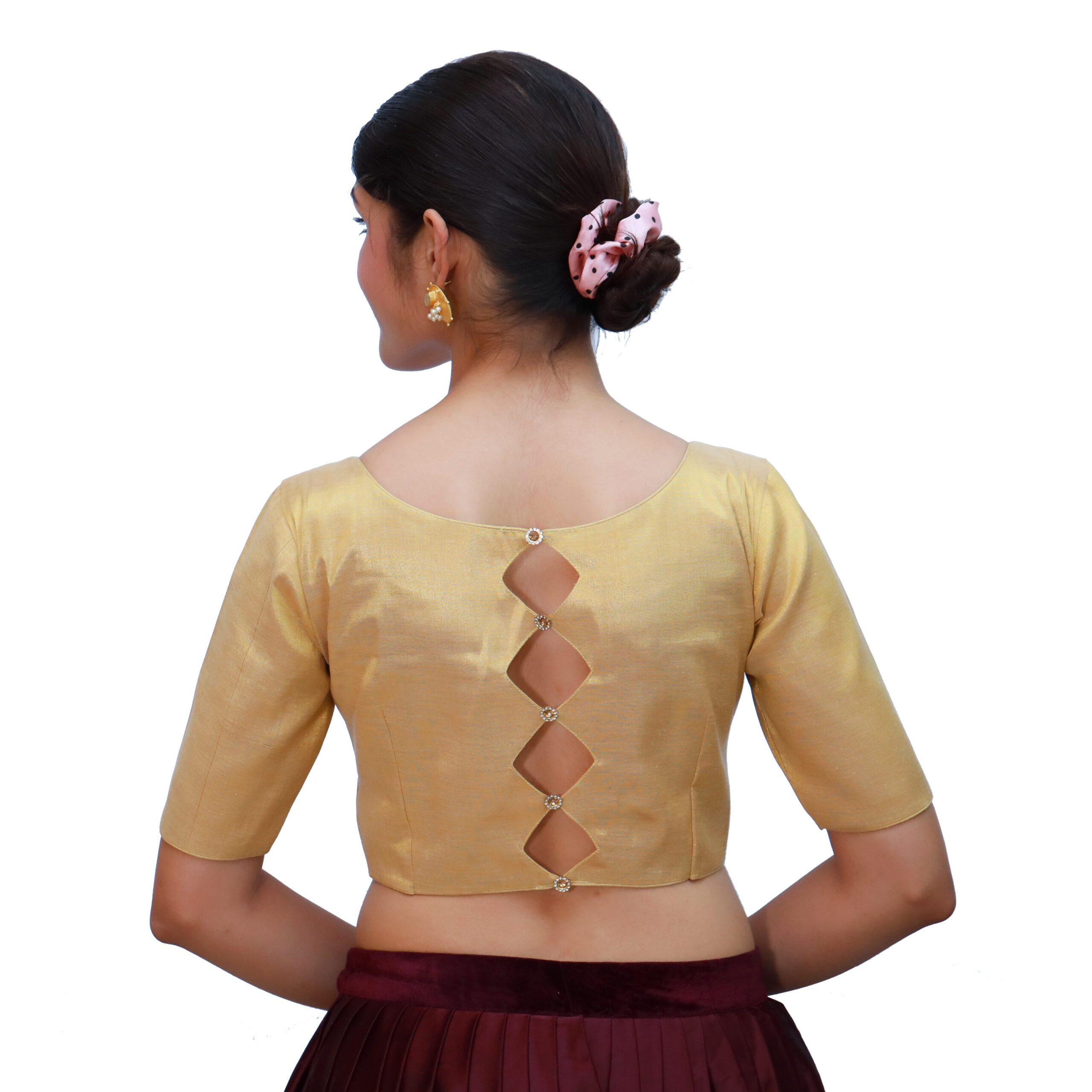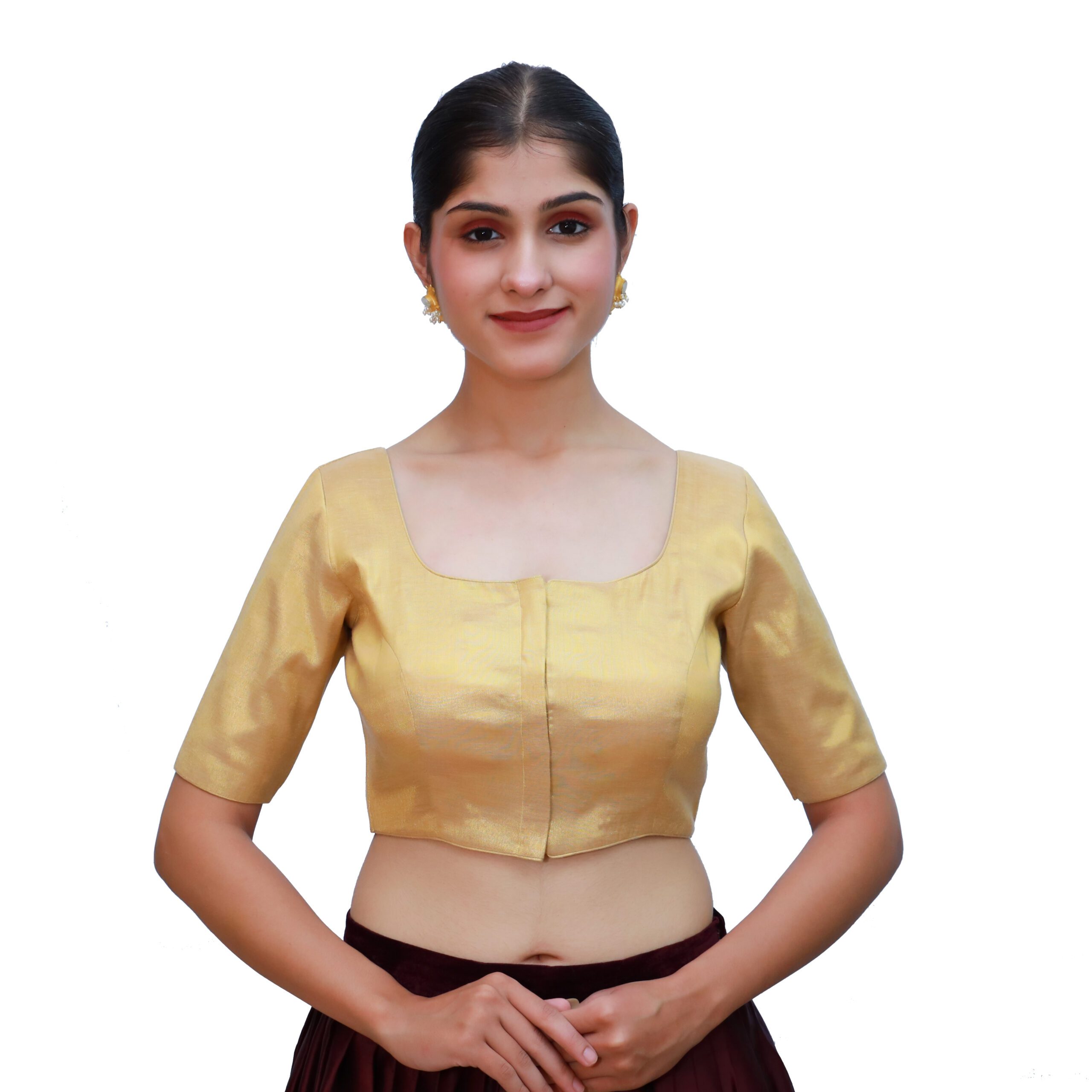 Enhance your ethnic wardrobe with the gold round neck blouse from India Blouse. Crafted fromĀ premium tissue fabric, this gold round neck blouse features a padded fitĀ for added comfort and structure. TheĀ round necklineĀ andĀ short sleevesĀ provide a timeless appeal, while theĀ front hook-and-eye closureĀ ensures both style and ease of wear. ItsĀ rich gold hueĀ makes it a perfect match for almost any saree, whether it be vibrant silks, embroidered drapes, or subtle pastels. Whether for aĀ wedding, reception, festive celebration, or party, this gold round neck blouse adds a touch of sophistication to every saree ensemble.