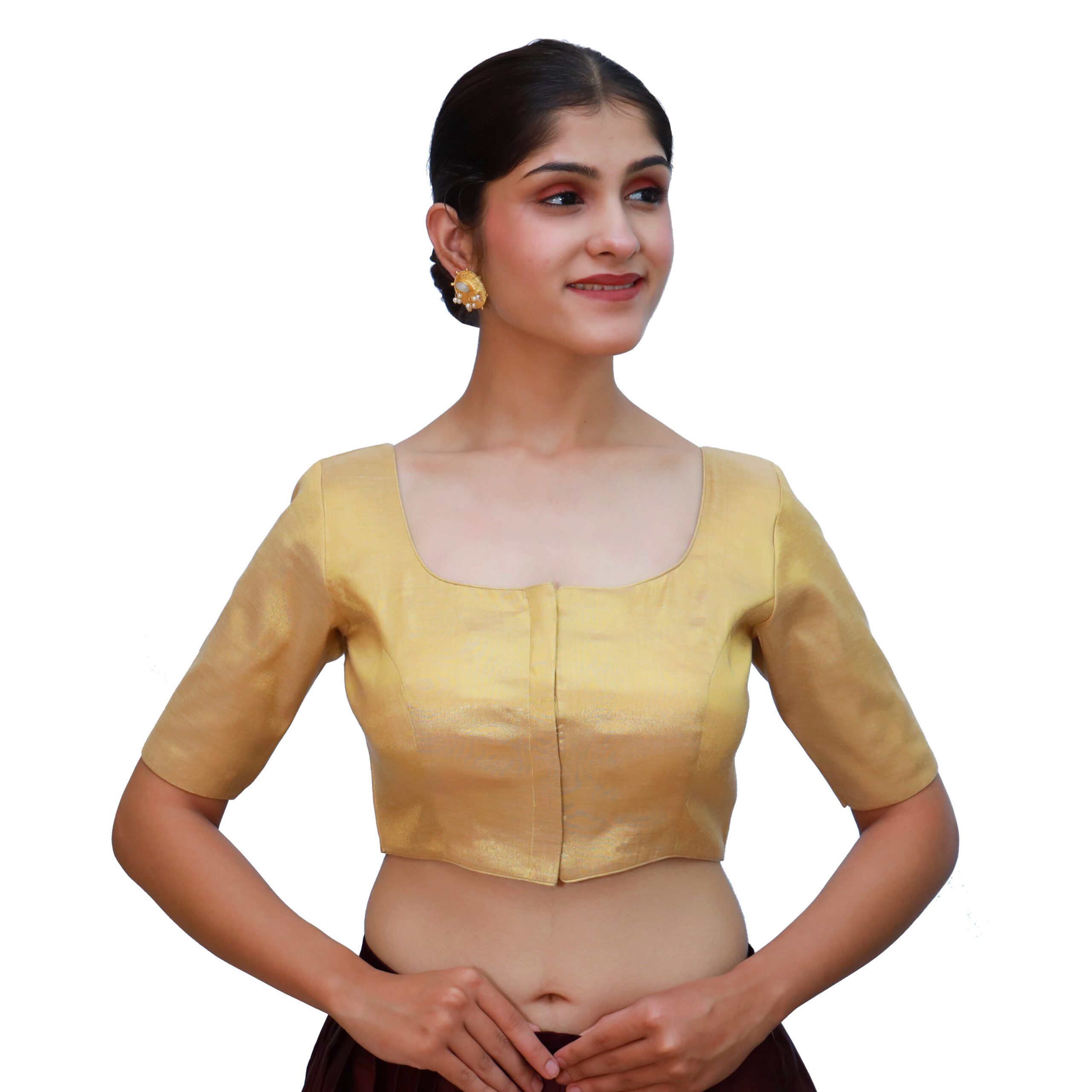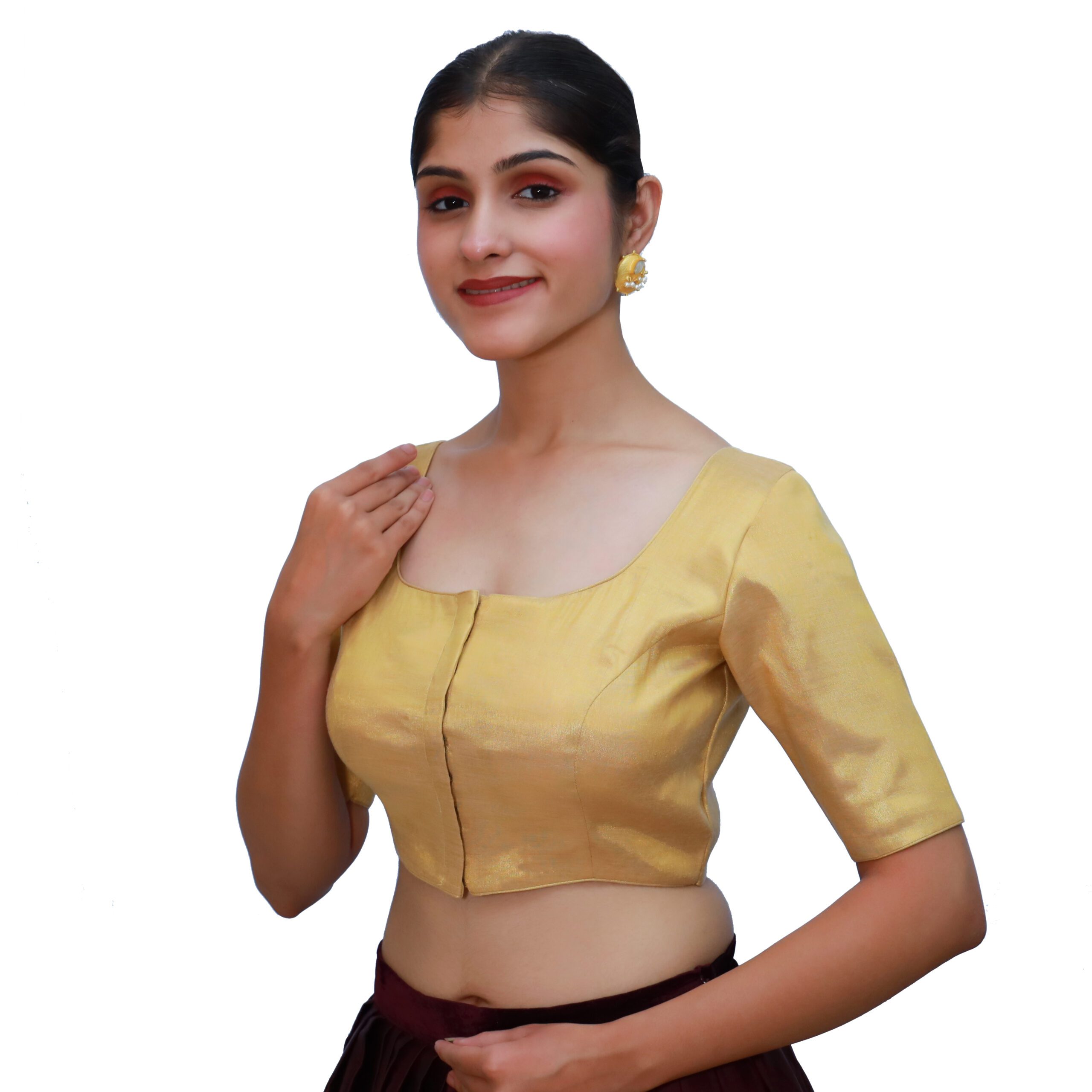 Enhance your saree ensemble with this elegant Gold Round Neck Blouse. Crafted from luxurious tissue fabric with a comfortable cotton lining, it features short sleeves and a classic round neckline, along with a front hook-and-eye closure. The blouse is padded for added support and shape. This piece is perfect for weddings, parties, and festive occasions.