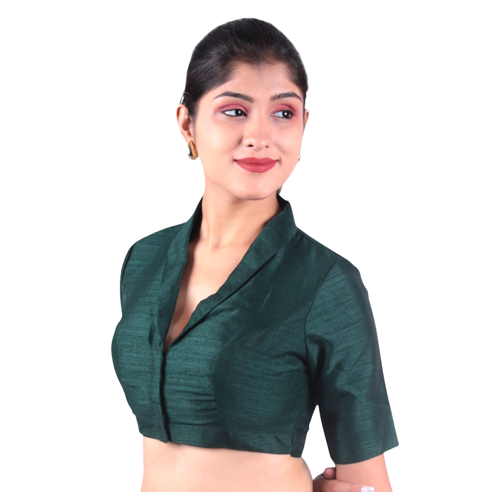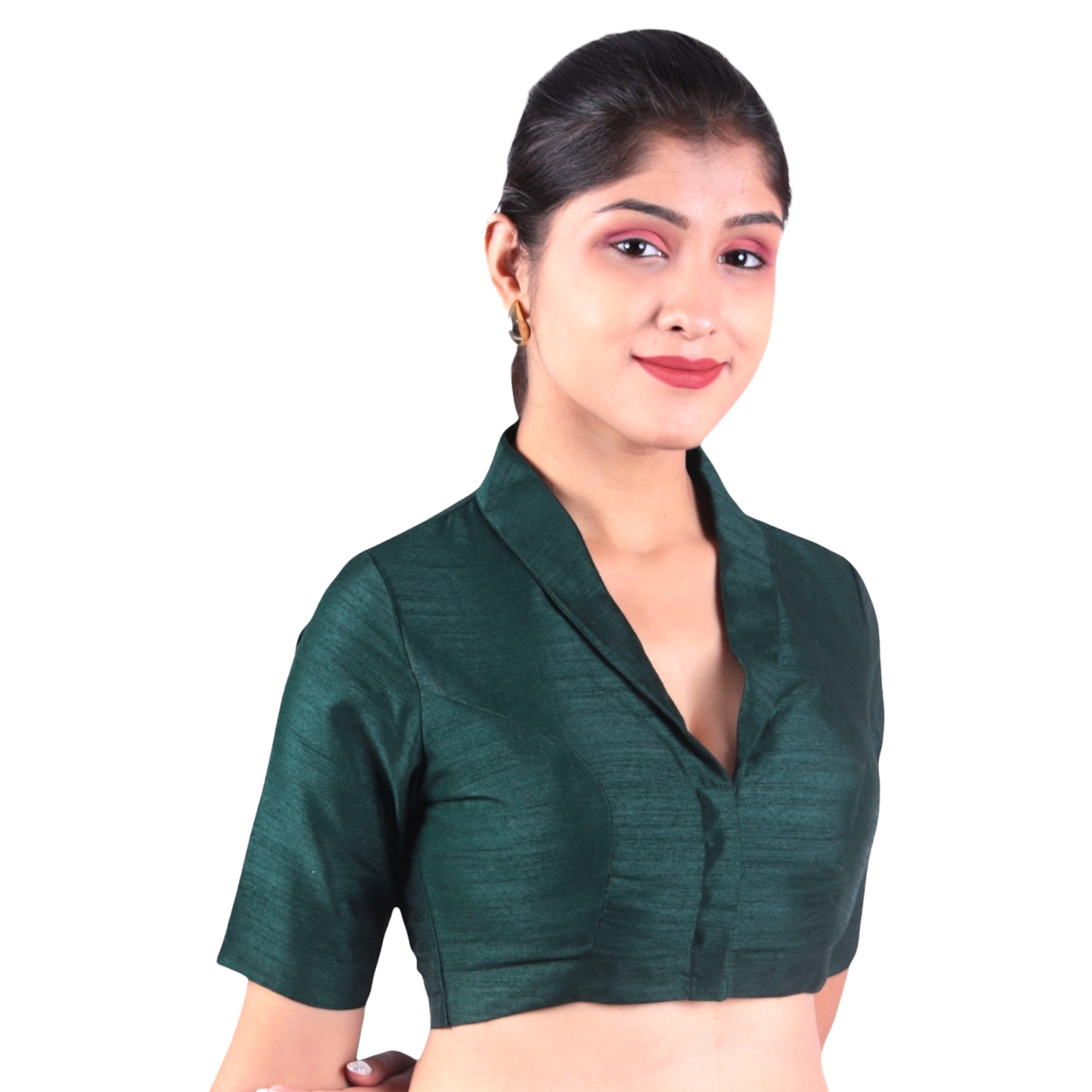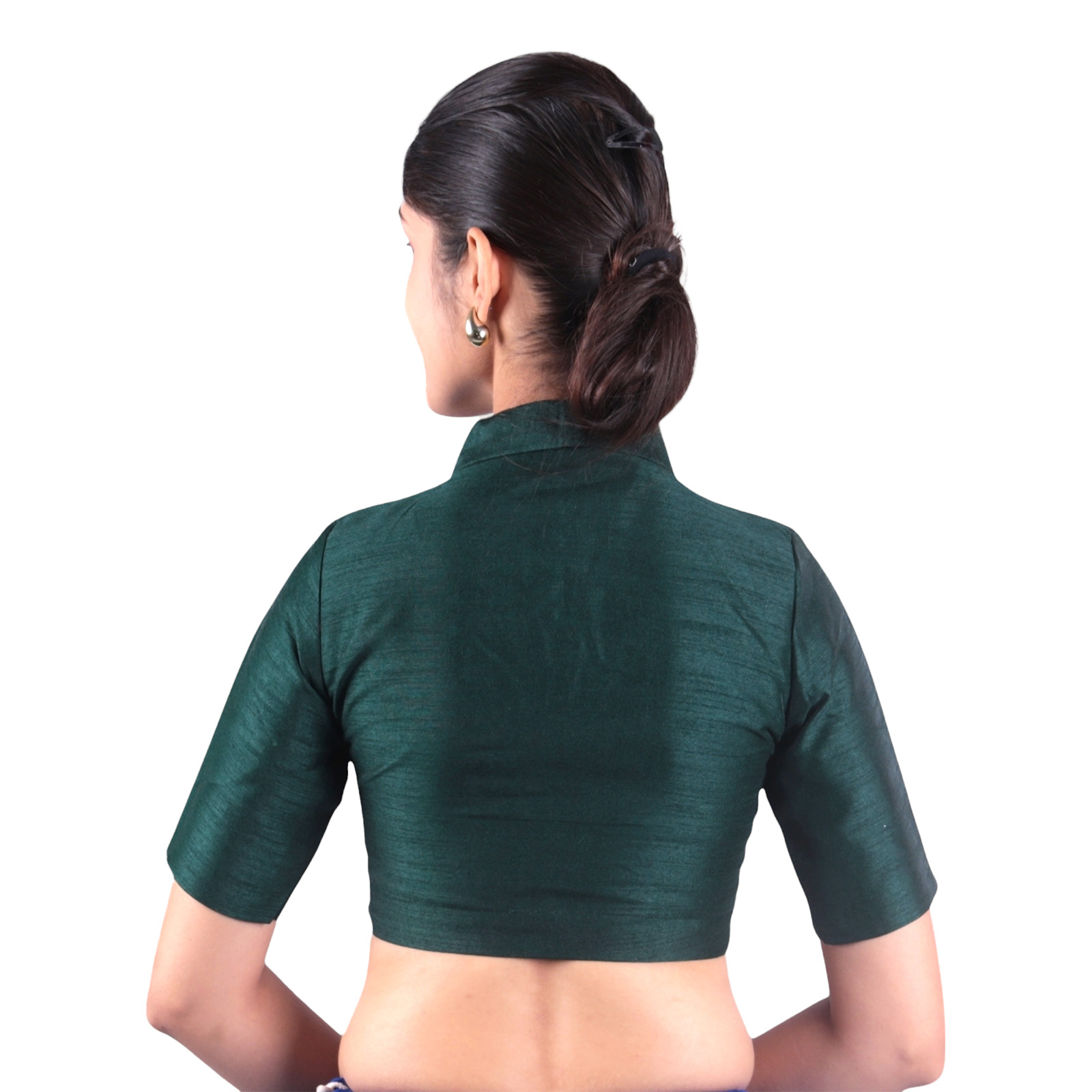 Add a touch of sophistication to your saree look with this green collar neck blouse from India Blouse. Expertly crafted from premium Bangalori silk and lined with soft crepe fabric, this designer blouse for women blends luxurious style with all-day comfort. The modern collar neck design delivers a structured, contemporary look, while the half sleeves offer a perfect balance of elegance and tradition.