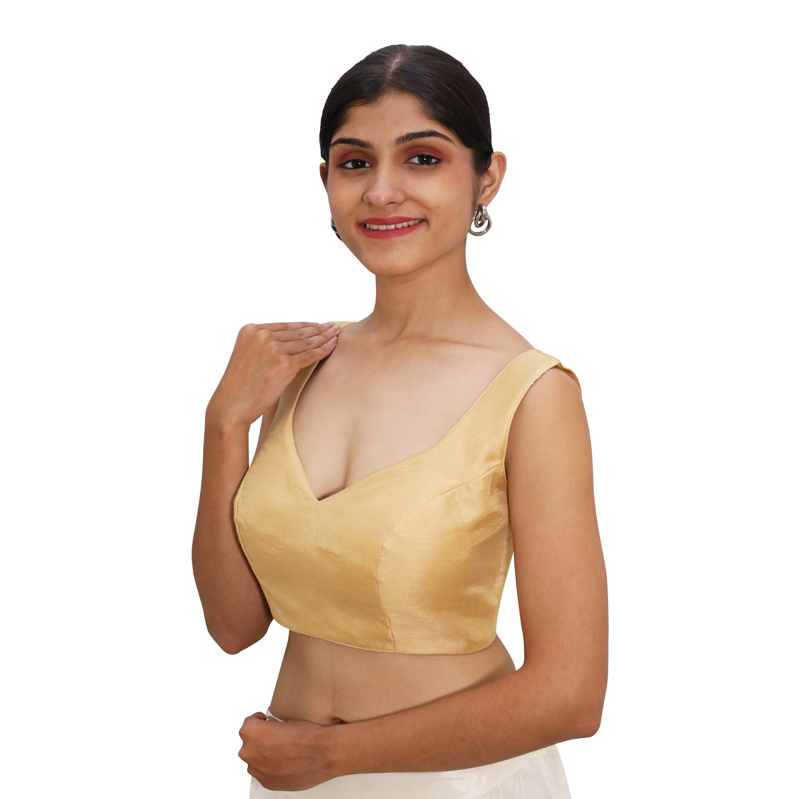 Discover the epitome of elegance with ourĀ gold sleeveless sweetheart blouse for women, designed for women who appreciate sophisticated fashion. This padded saree blouse is expertlyĀ crafted from luxuriousĀ Bangalori silk with soft crepe lining, making it an ideal choice for bridal, festive, and party wear. Elevate your ensemble with this stunning golden saree blouse, perfect for any special occasion. Find your perfect fit among our exquisite collection of gold blouses for women!