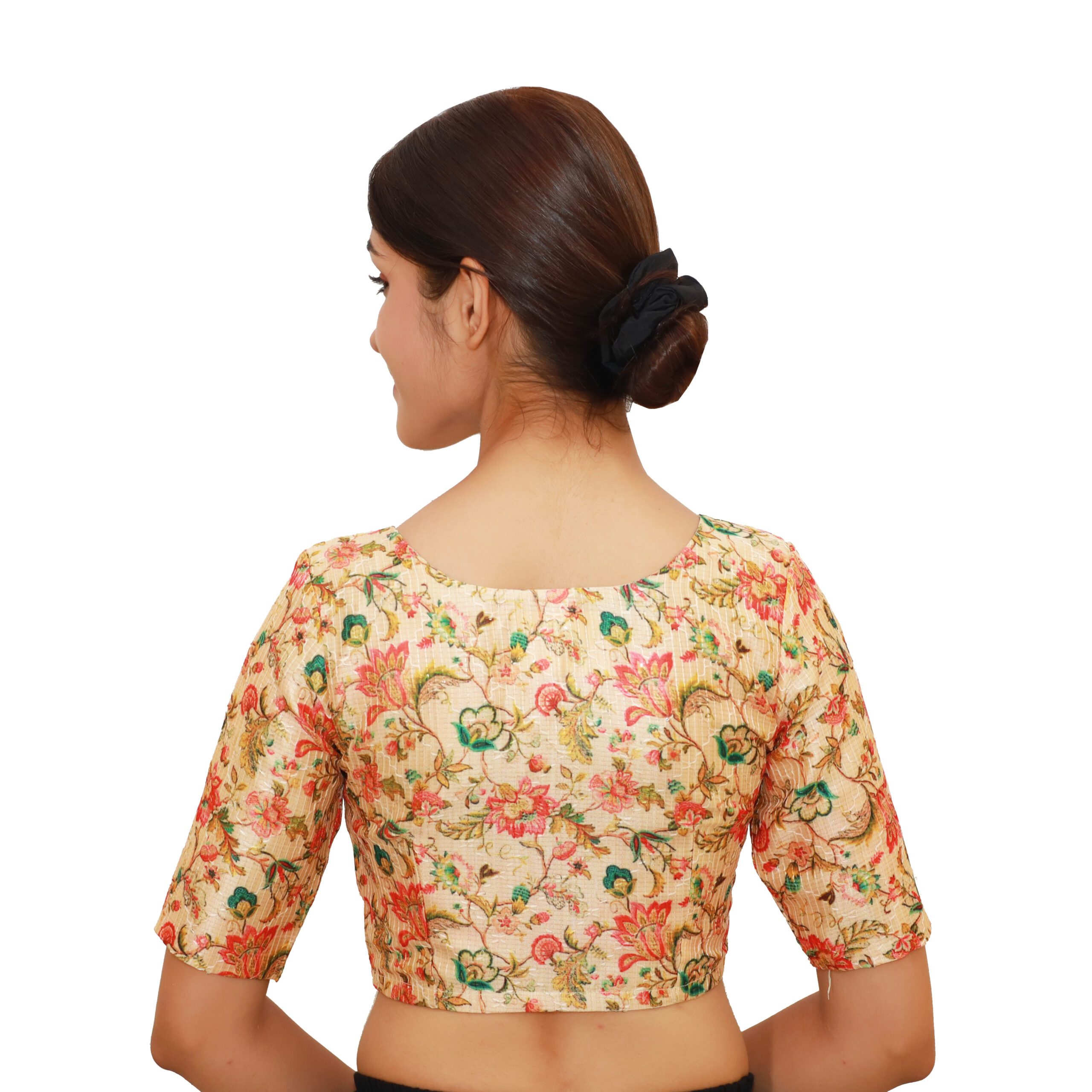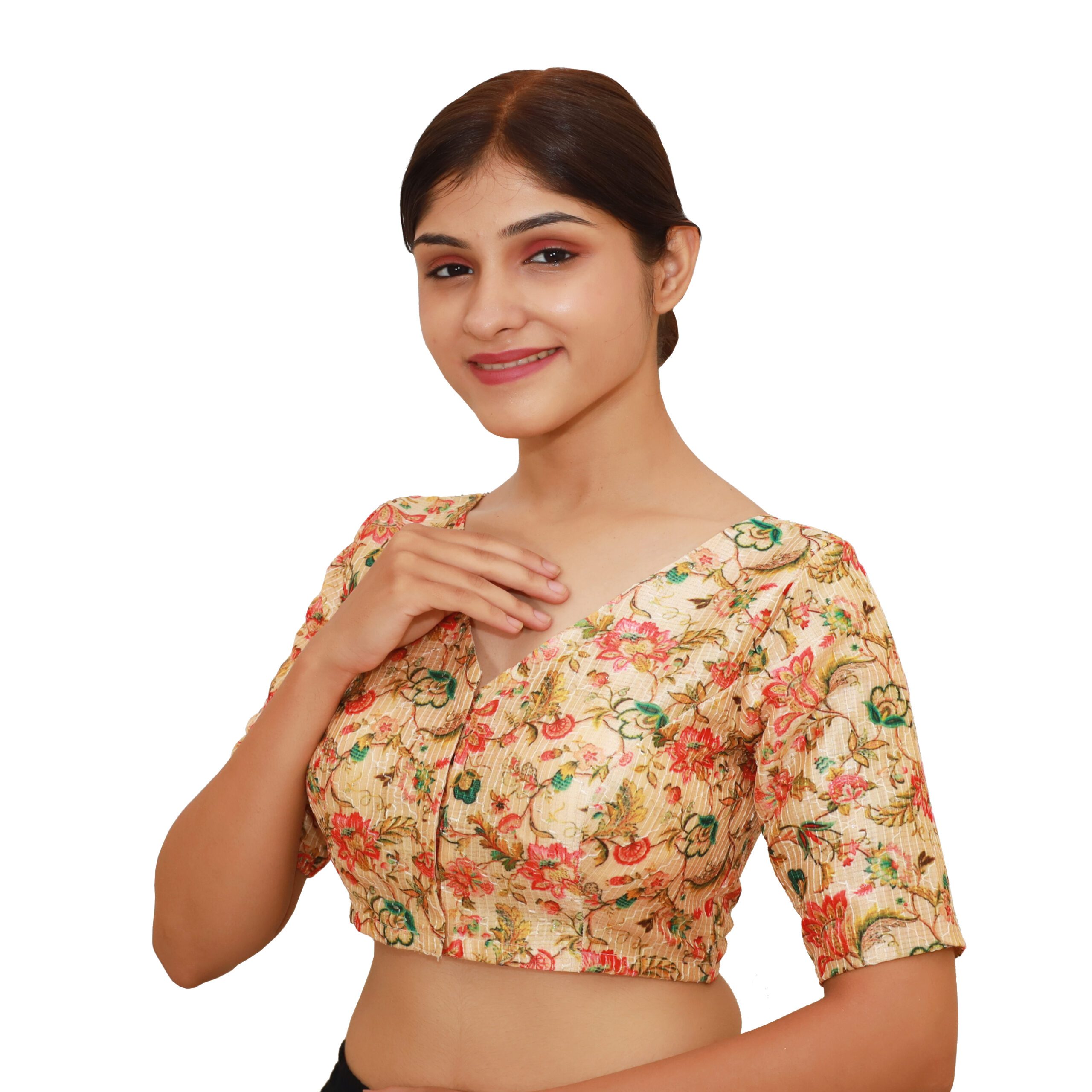 This multi-print V-neck blouse is designed as a non-padded blouse, offering lightweight comfort, making it ideal for all-day wear during festivals, celebrations, or daily ethnic styling. The easy front hook and eye closure adds convenience and ensures a secure fit. This versatile blouse pairs beautifully with plain, printed, or embroidered sareesāwhether silk, georgette, chiffon, or cottonāmaking it a must-have for every occasion.