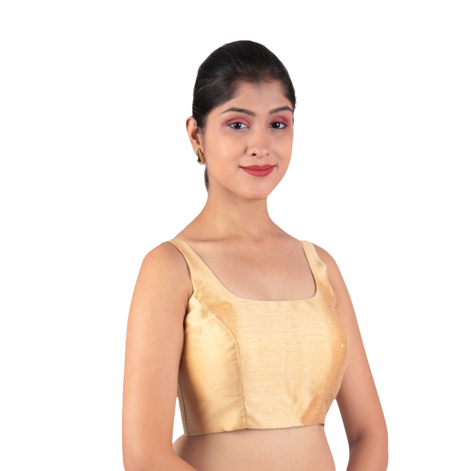 Elevate your ethnic wardrobe with the gold silk padded sleeveless blouse by India Blouse. Tailored in rich Bangalori silk with a soft cotton lining, this blouse offers the perfect balance of comfort and luxury. The padded construction ensures a smooth, body-flattering fit, while the U-neckline and sleeveless style add a chic, contemporary touch. The timeless gold hue makes this gold silk padded sleeveless blouse a wardrobe essential, as it complements everything from traditional silk sarees to modern designer drapes. Whether itās a grand wedding, reception, or festive celebration, this blouse will add a radiant glow to your look.