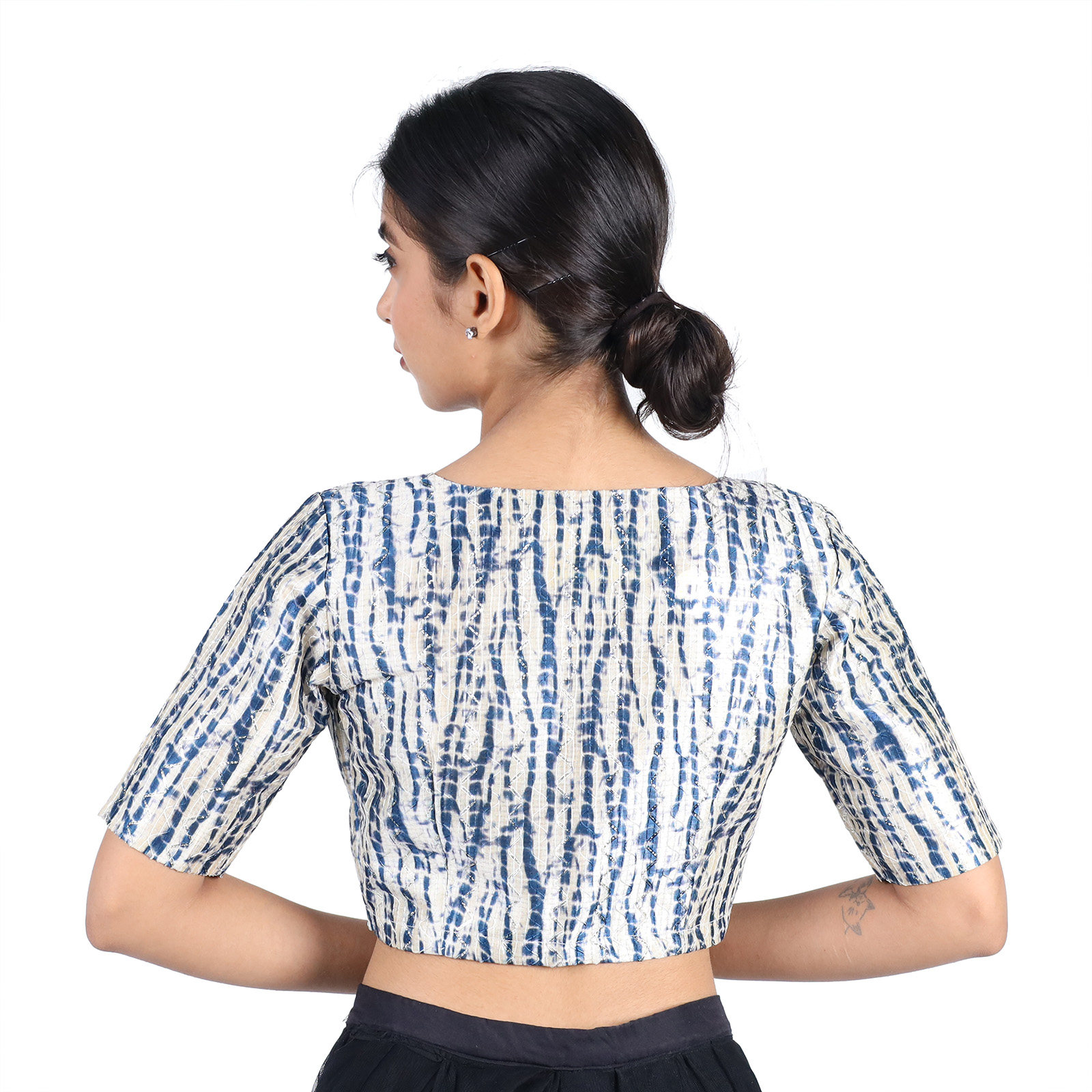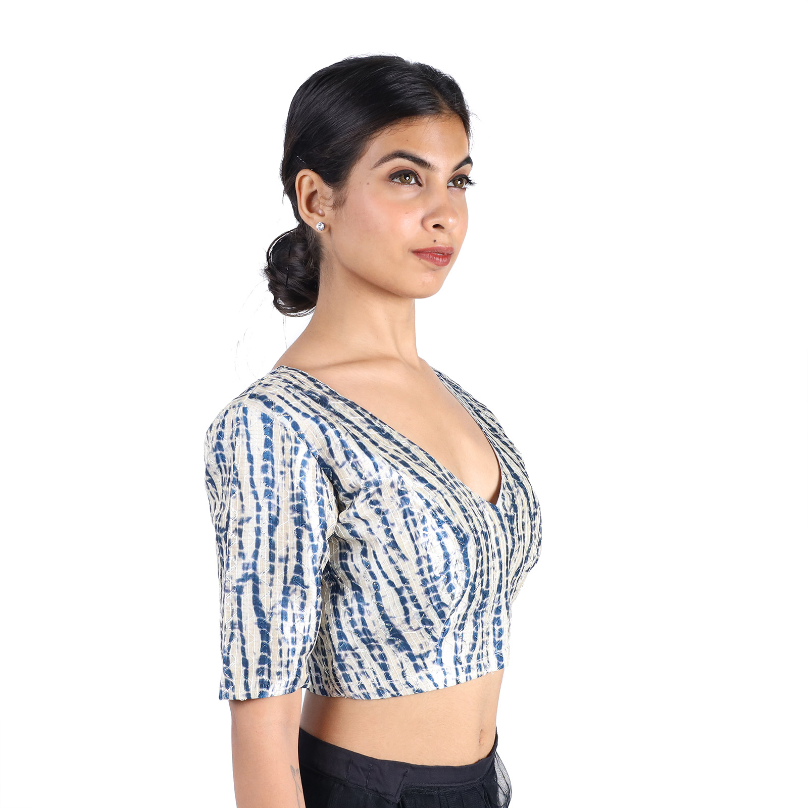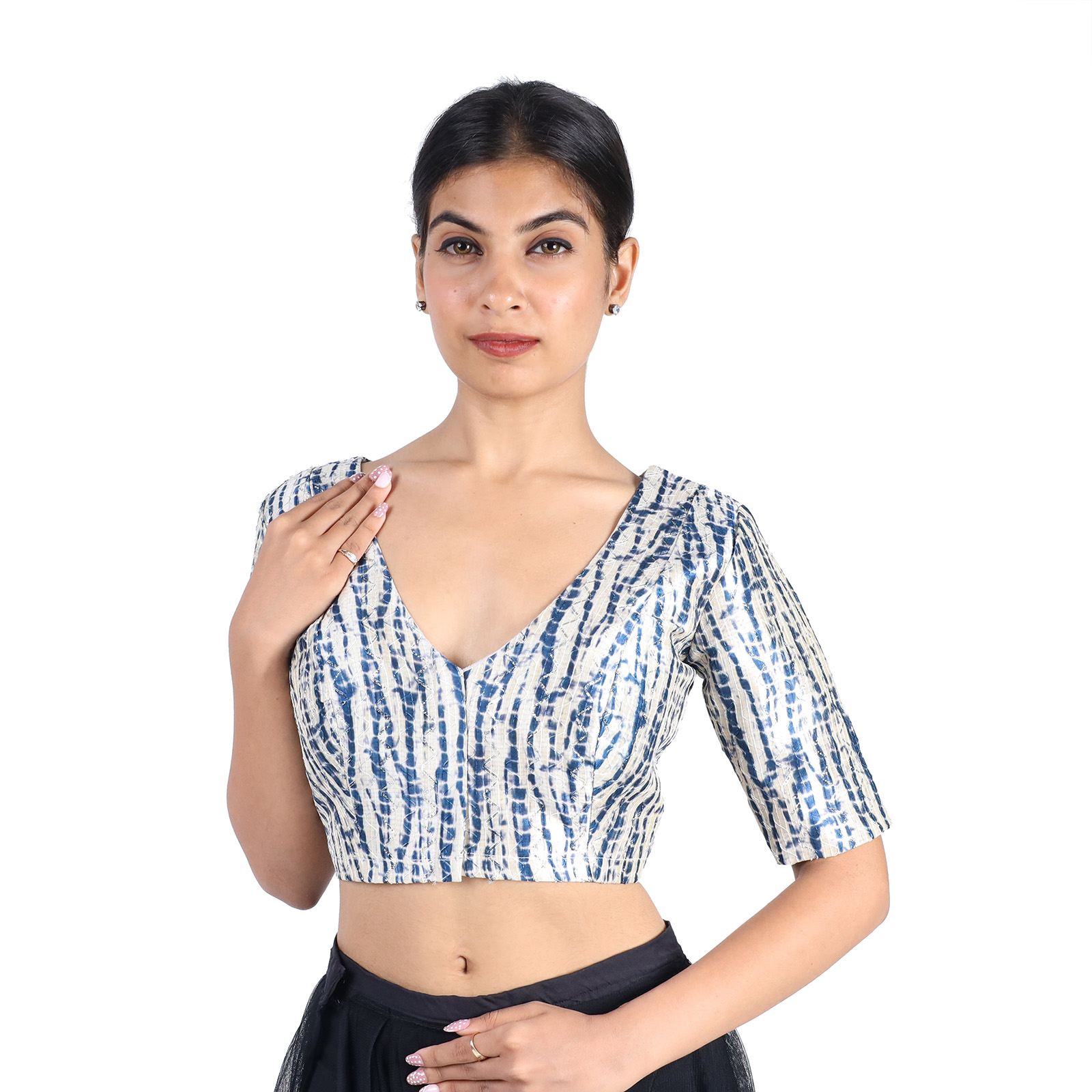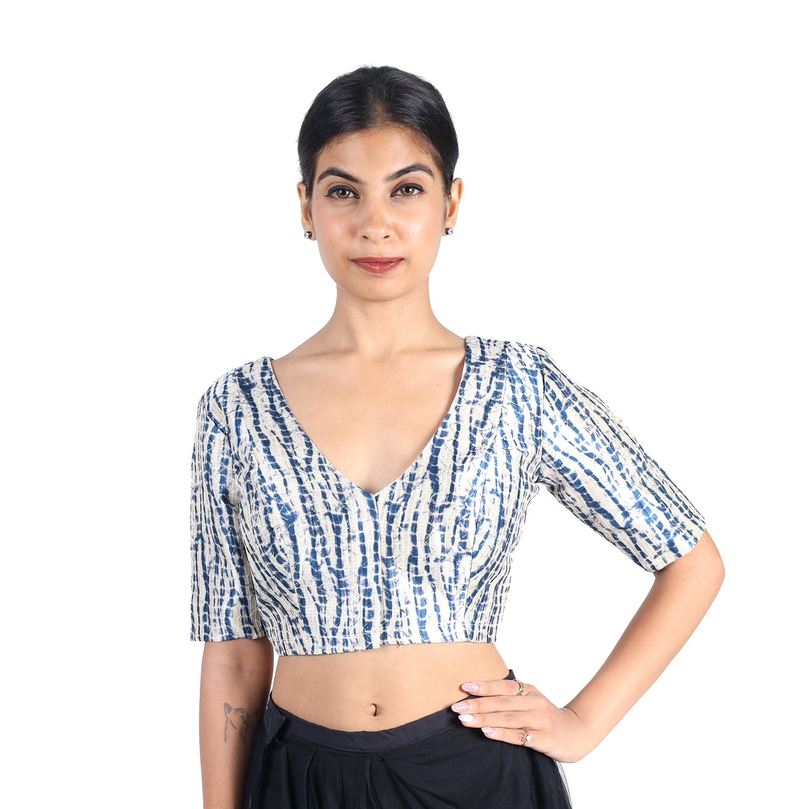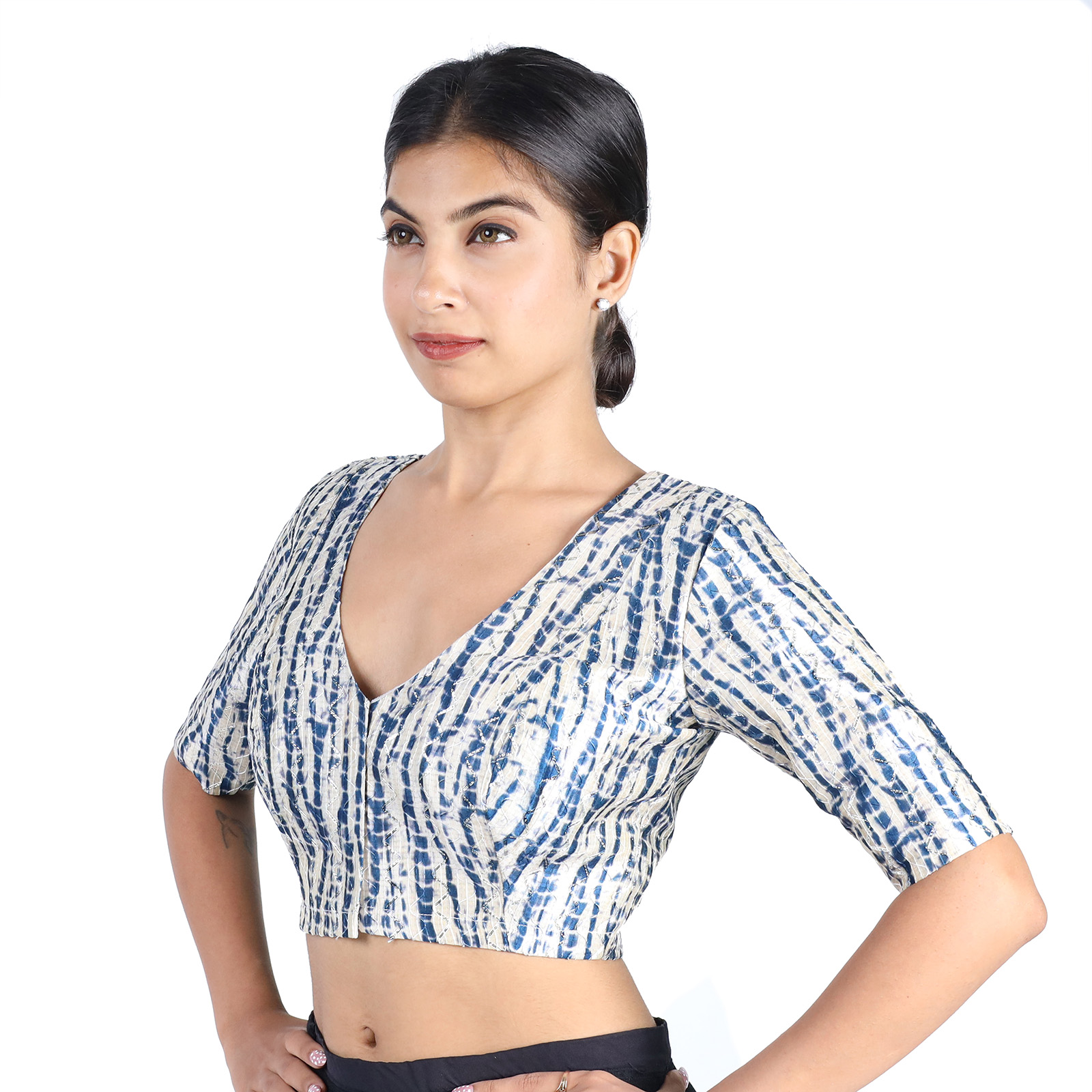 Embrace timeless elegance with this Silk Black Tie-Dye Printed V-Neck Premium Saree Blouse for Women, designed to elevate your ethnic style. Made from luxurious art silk and lined with soft cotton, this Silk Black Tie-Dye Printed V-Neck Premium Saree Blouse for Women non-padded blouse features a flattering V neckline, short sleeves, and a secure front hook-and-eye closure. The bold black hue with subtle tie-dye patterns makes it a versatile choice for pairing with sarees, skirts, or lehengas. Whether it’s for a festive occasion or an evening event, this blouse delivers sophistication and comfort in one chic piece.