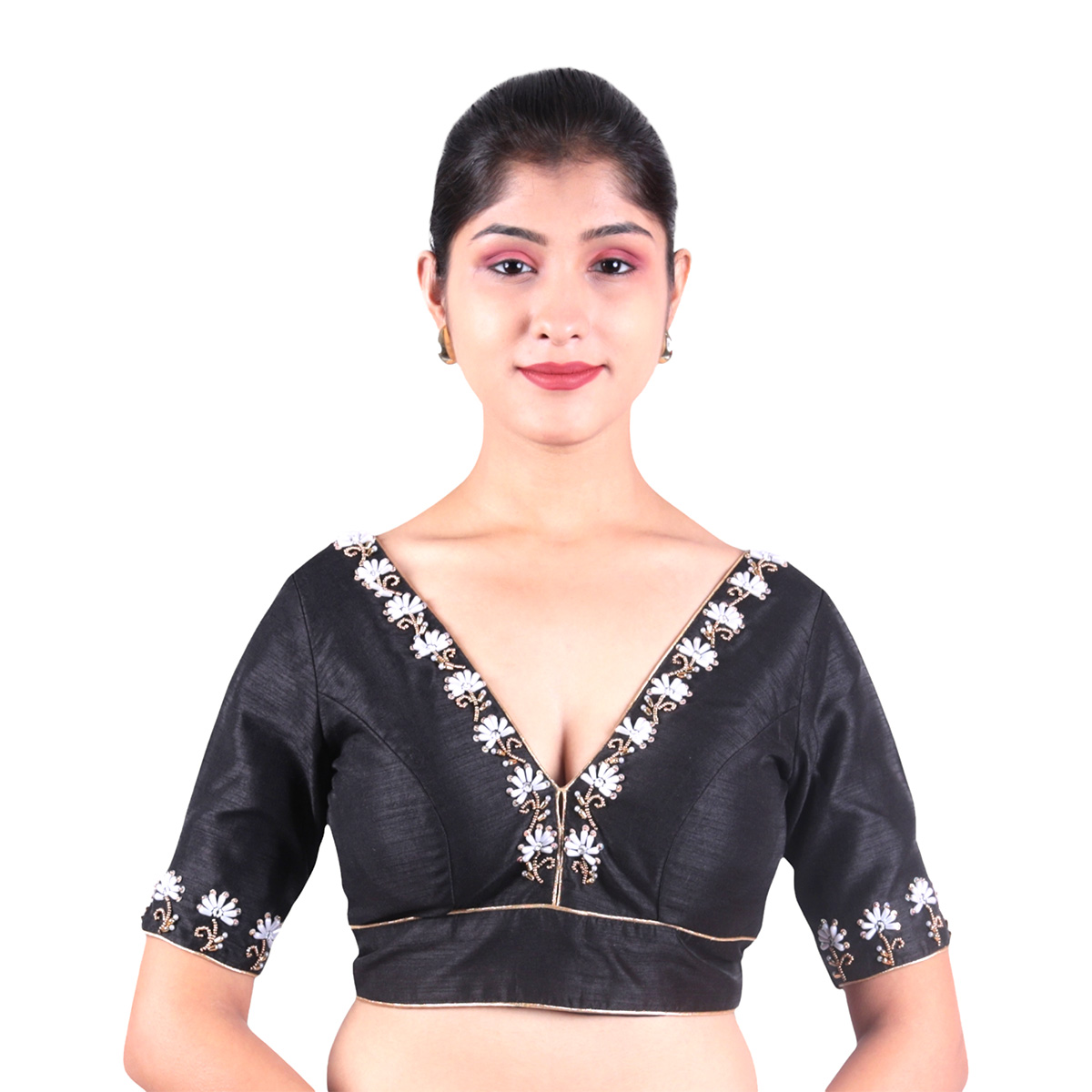 Elevate your ethnic wardrobe with this Silk Black V-Neck Hand Embroidered Blouse, crafted in luxurious artificial silk with a soft cotton lining for comfort. Featuring delicate hand embroidery, a flattering V-neckline, and classic short sleeves, this blouse is designed for elegance and ease. The Silk Black V-Neck Hand Embroidered Blouse padded design provides shape and support, while the back hook-and-eye closure ensures a secure and graceful fit. Perfect for weddings, festivals, and celebrations ā this blouse pairs beautifully with sarees and lehengas alike.