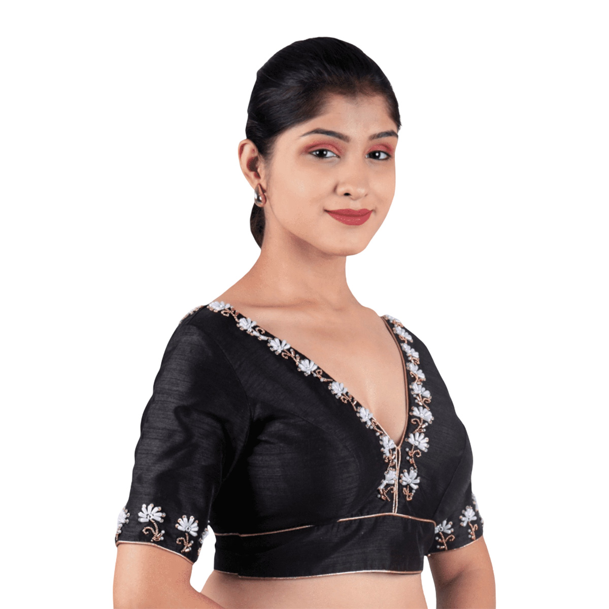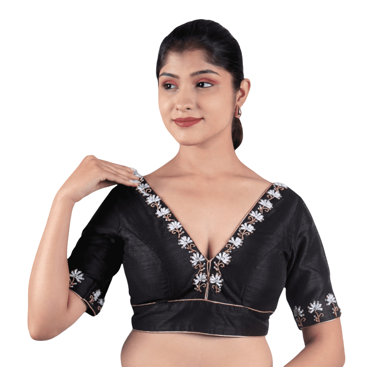 Add timeless elegance to your saree look with this Silk Black V-Neck Hand Embroidered Blouse, crafted in luxurious silk with cotton lining. Featuring delicate hand embroidery, a flattering V-neckline, and a comfortable fit, this readymade blouse by India Blouse is perfect for weddings, parties, and festive occasions.