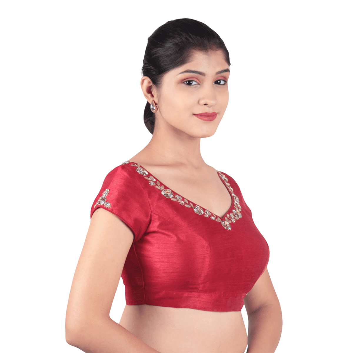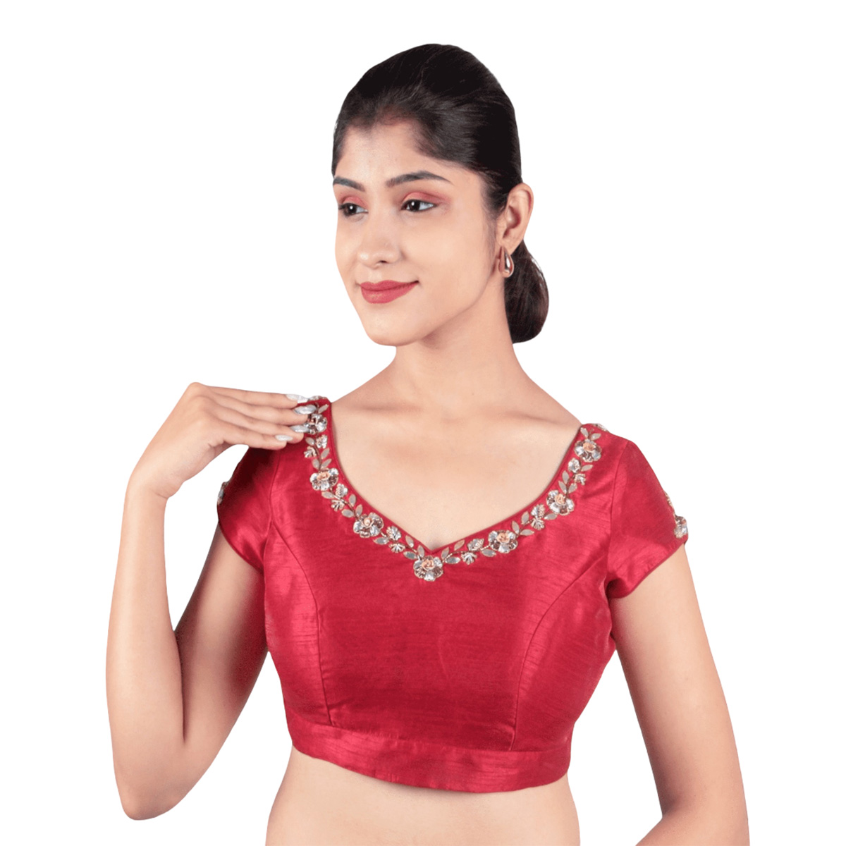 Add royal charm to your ethnic wardrobe with the Silk Maroon Sweetheart Neck Embroidered BlouseĀ for Women by India Blouse. Made from art silk with soft cotton lining, this blouse is both comfortable and durable. The padded style offers a sleek, structured fit, while the sweetheart neckline gives an elegant, feminine touch to your saree drape. The cap sleeves add a stylish edge, and the hand embroidery enhances its traditional beauty.