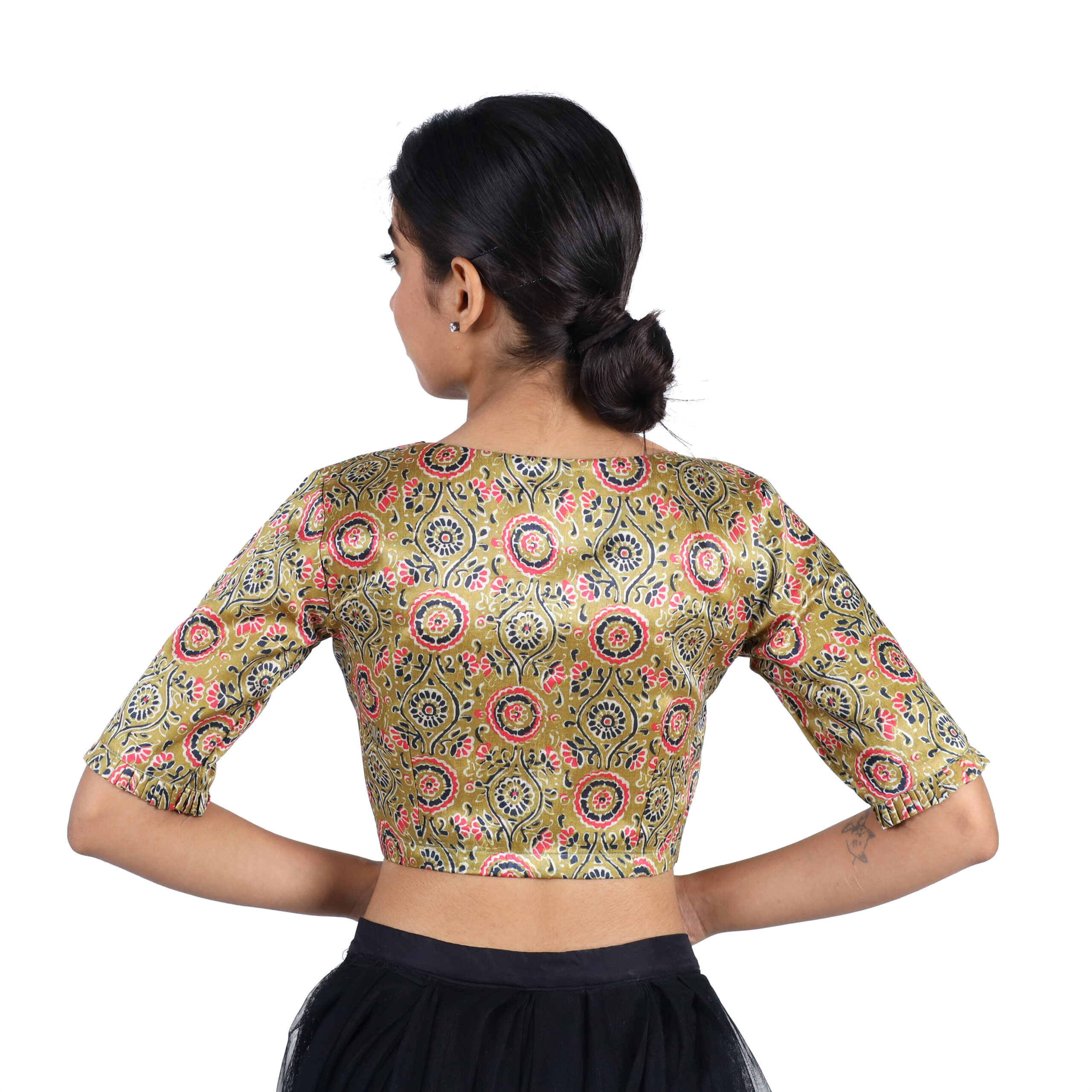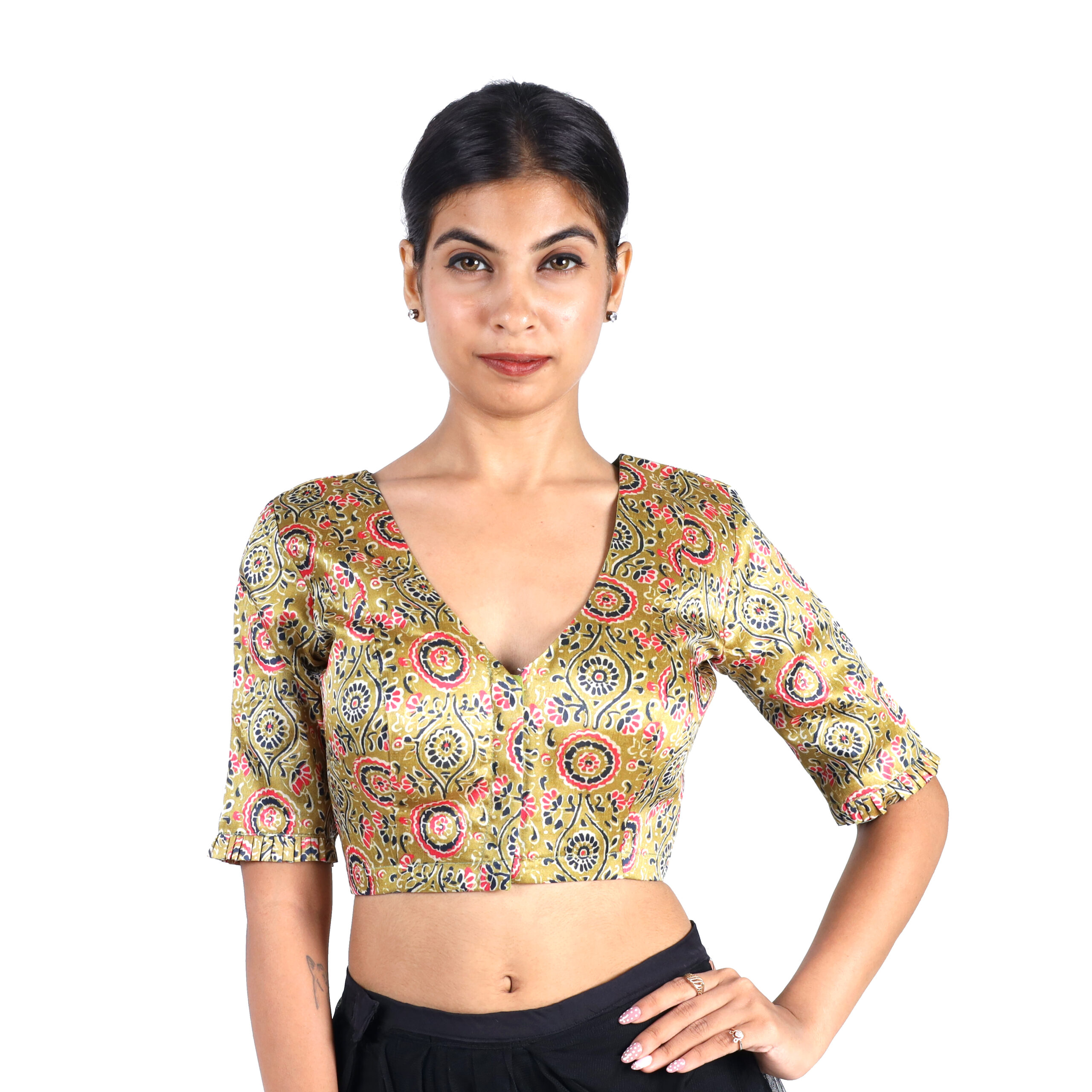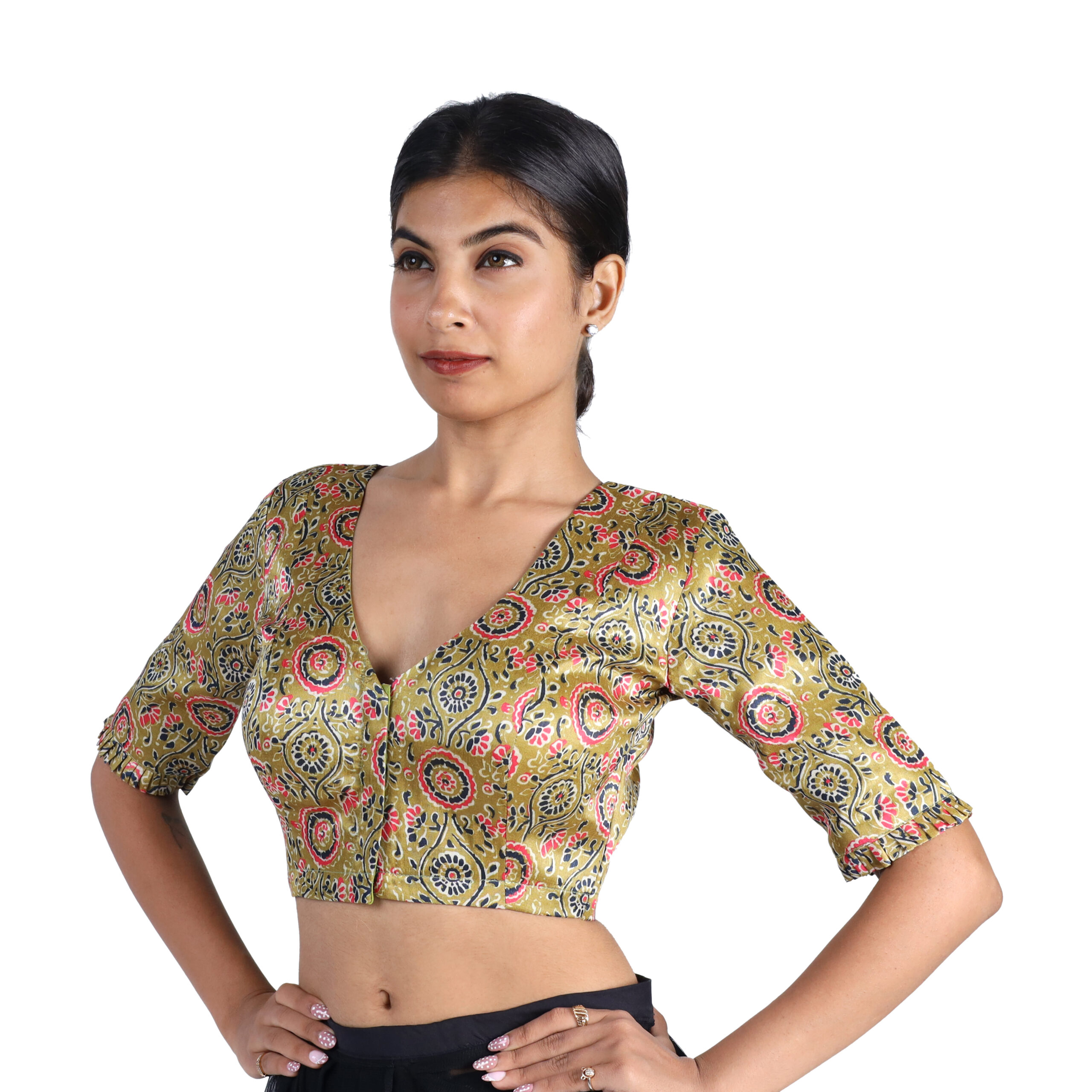 Add a touch of elegance to your ethnic wardrobe with this stunning Silk Olive Green Floral V-Neck Blouse. This Silk Olive Green Floral V-Neck Blouse Crafted from high-quality Art Silk fabric, this blouse features an intricate floral and paisley design in vibrant hues of pink, gold, and navy. The deep V-neckline and elbow-length sleeves add a modern twist to a traditional silhouette, making it perfect for pairing with sarees, lehengas, or skirts for weddings, parties, and festive occasions.