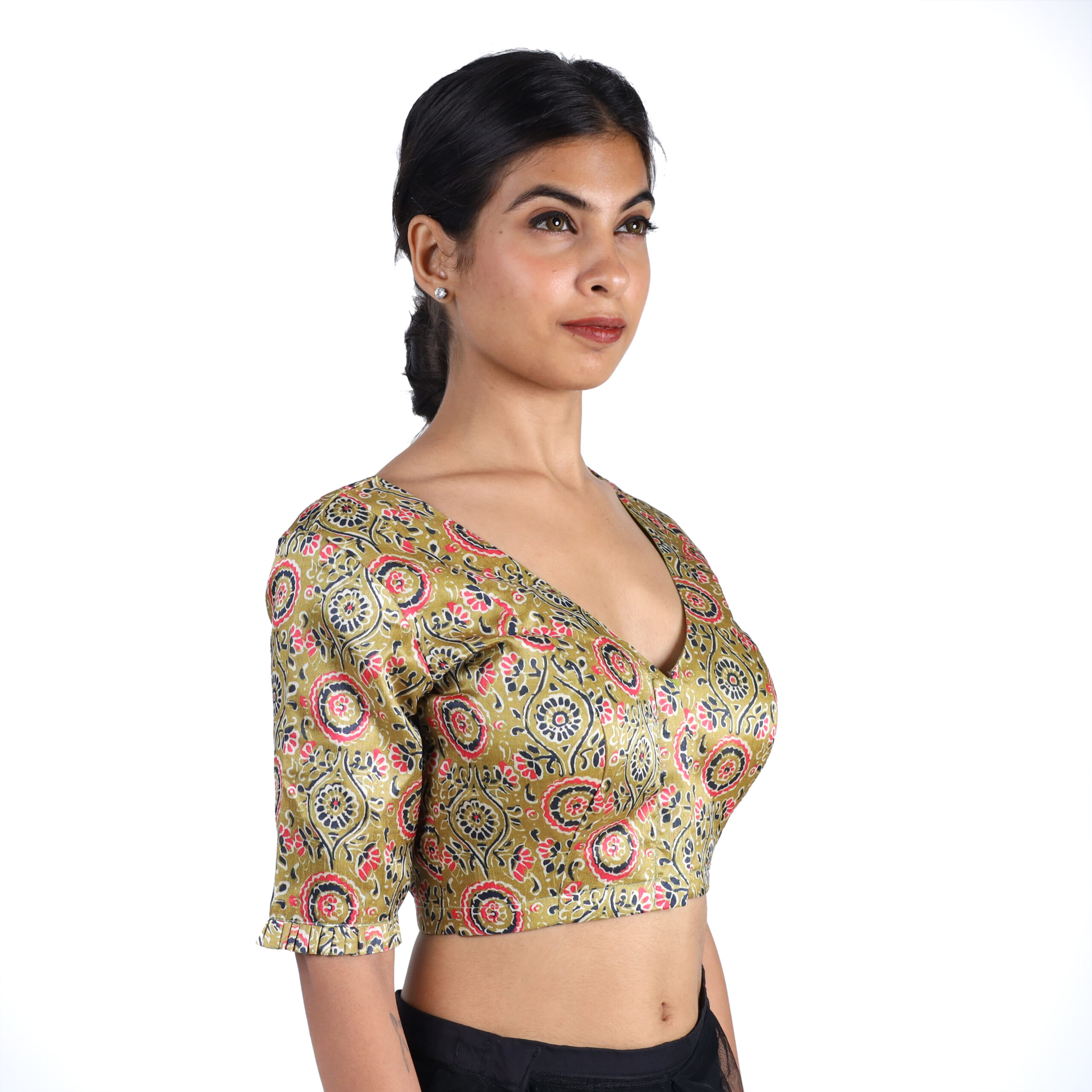 Elegant Silk Olive Green Floral V-Neck Blouse with intricate floral motifs, deep V-neckline, and elbow sleeves. Ideal for weddings, parties, and festive saree looks.