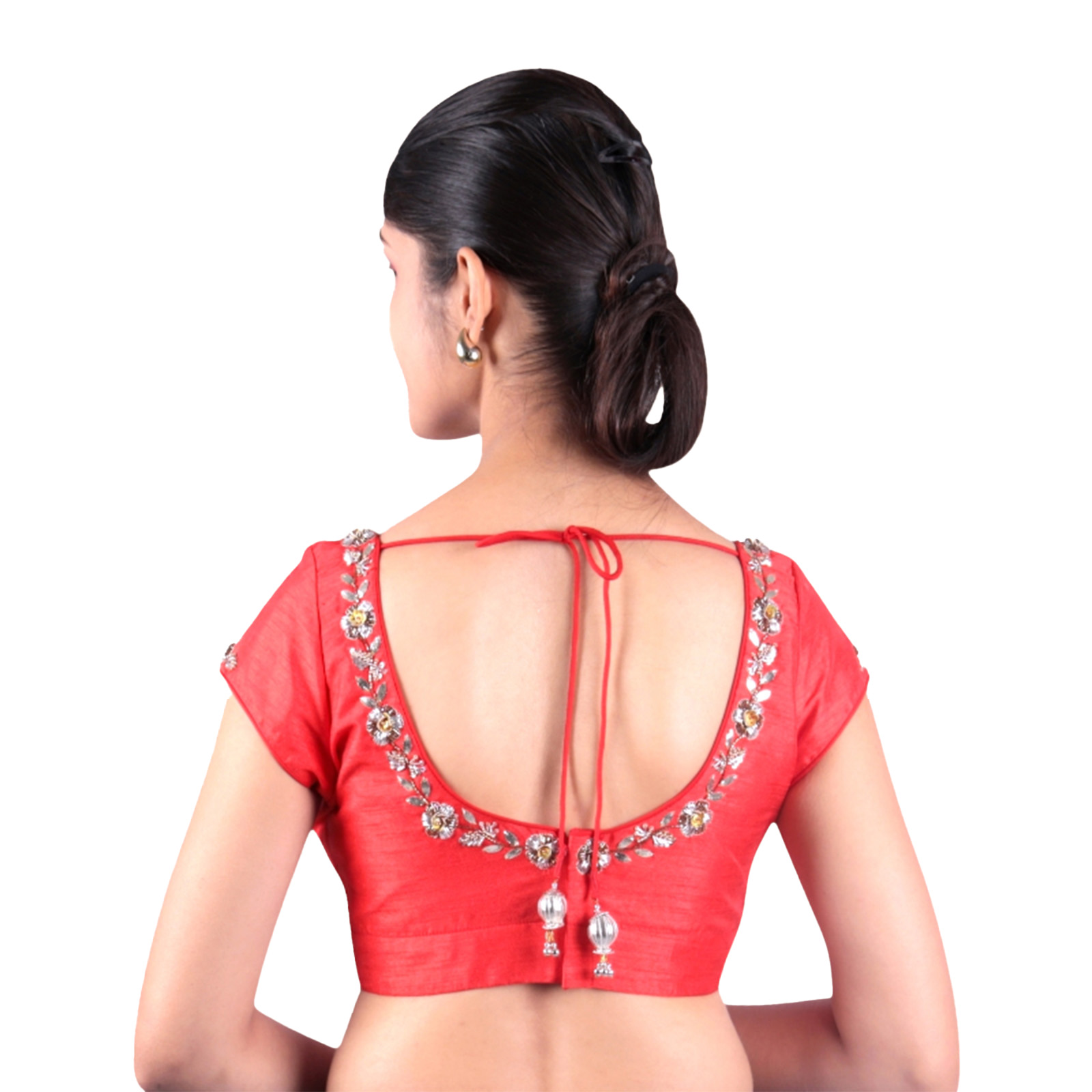 Make a bold statement in this Silk Red Sweetheart Neck Embroidered Blouse, crafted in art silk with cotton lining. Featuring a padded fit, cap sleeves, delicate hand embroidery, and a back hook closure, this readymade blouse by India Blouse is perfect for weddings, festive occasions, and parties.