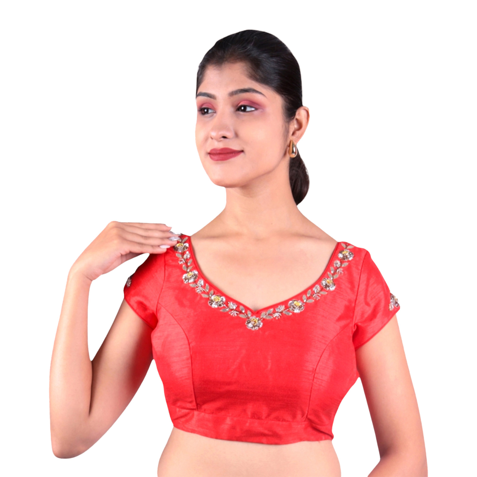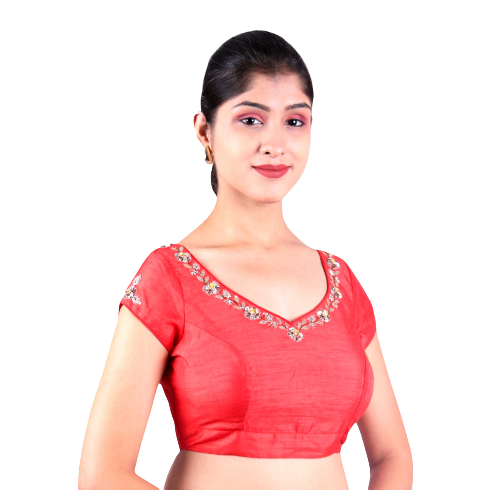 Elevate your ethnic wardrobe with the Silk Red Sweetheart Neck Embroidered BlouseĀ for Women by India Blouse. This blouse is made from art silk with a breathable cotton lining, ensuring both comfort and durability. This Silk Red Sweetheart Neck Embroidered Blouse padded design offers a smooth, structured fit, while the sweetheart neckline adds a touch of feminine charm. The cap sleeves bring a modern twist, and the hand embroidery work enhances its elegance, making it ideal for festive and bridal wear. With a back hook-and-eye closure, this blouse is easy to wear and ensures a secure fit. The rich red color pairs beautifully with silk, georgette, or embellished sarees, making it perfect for weddings, receptions, cultural functions, or evening events.