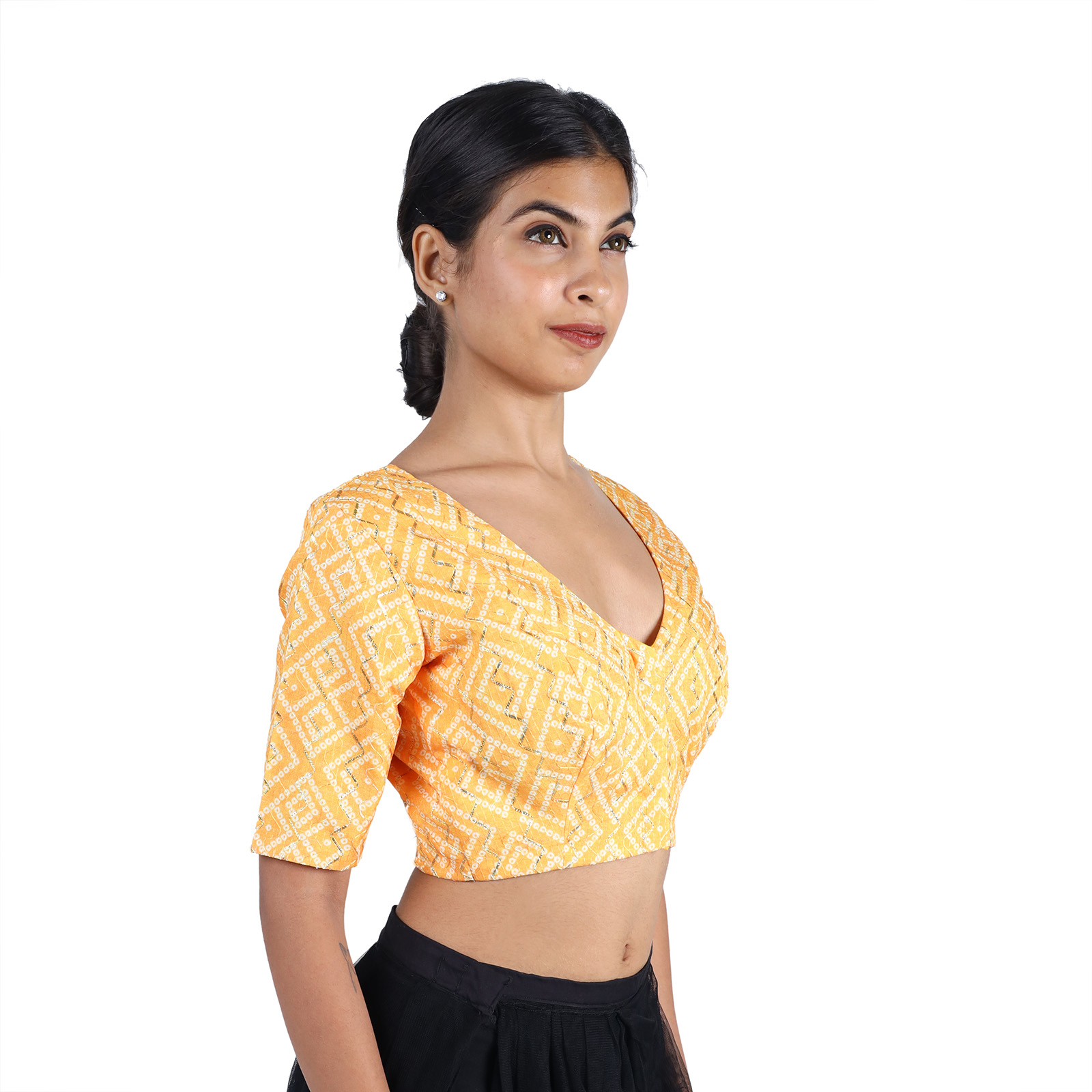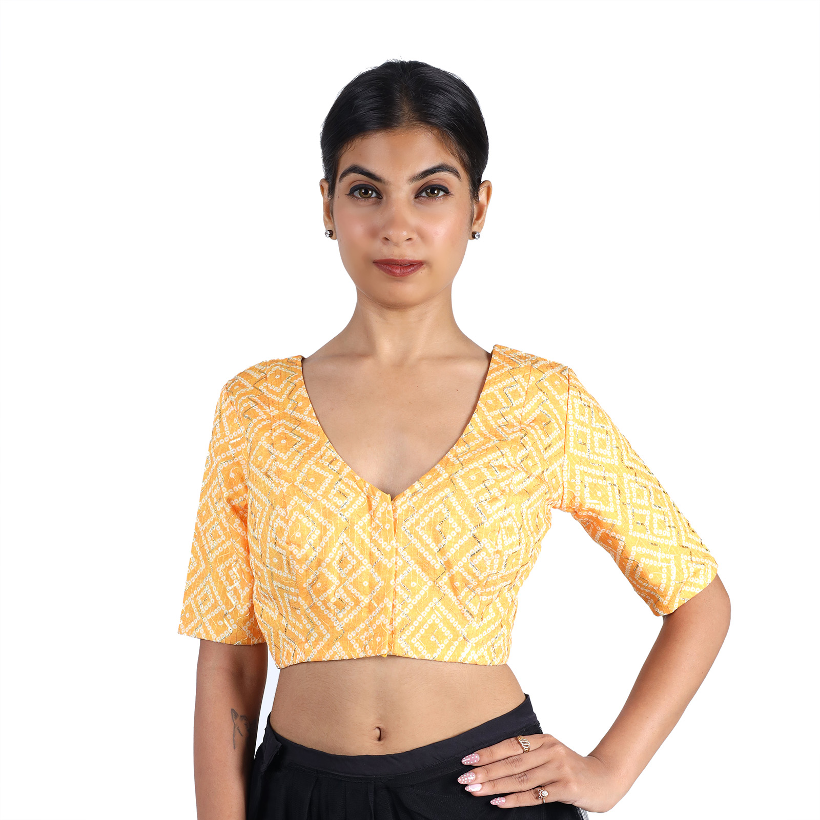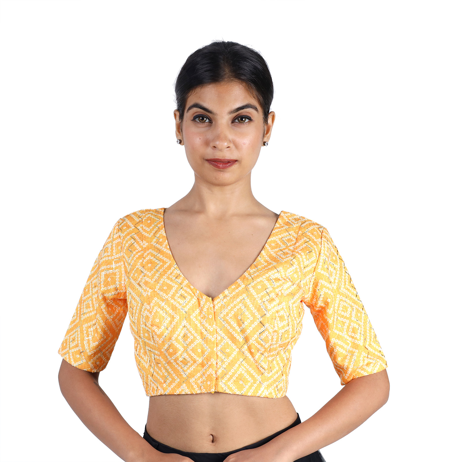 Brighten your ethnic look with the Silk Yellow Bandhani Printed V-Neck Saree Blouse.Ā Crafted in art silk with cotton lining, this festive-ready blouse features a flattering V-neckline, short sleeves, and a secure front hook closure. Designed by India Blouse for haldi, weddings, and traditional occasions.
