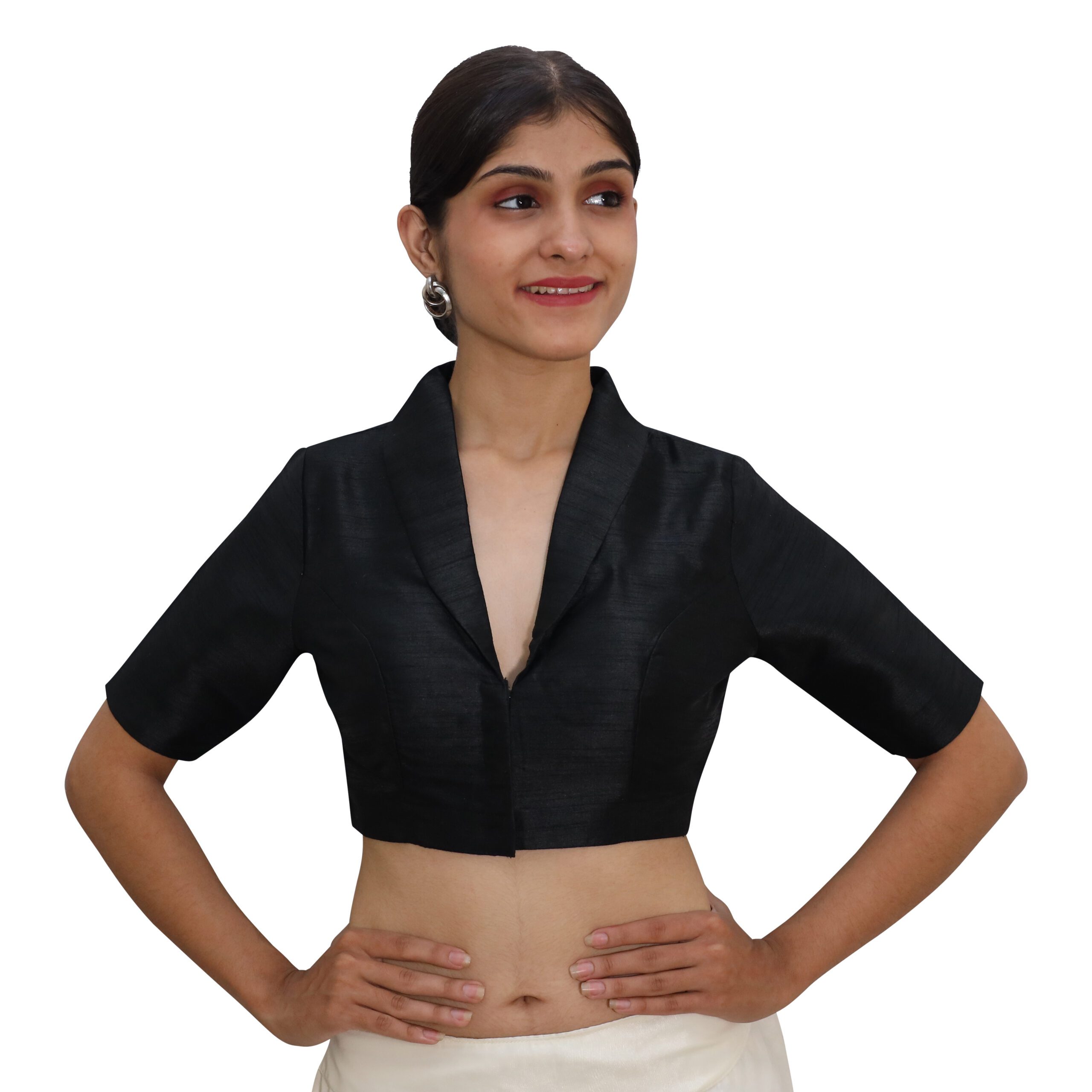 ElegantĀ black padded saree blouse for womenĀ made fromĀ solid Bangalori silk with crepe lining, featuring aĀ collar neck,Ā half sleeves, andĀ a front hook closure. Perfect for weddings, festive occasions, and parties.