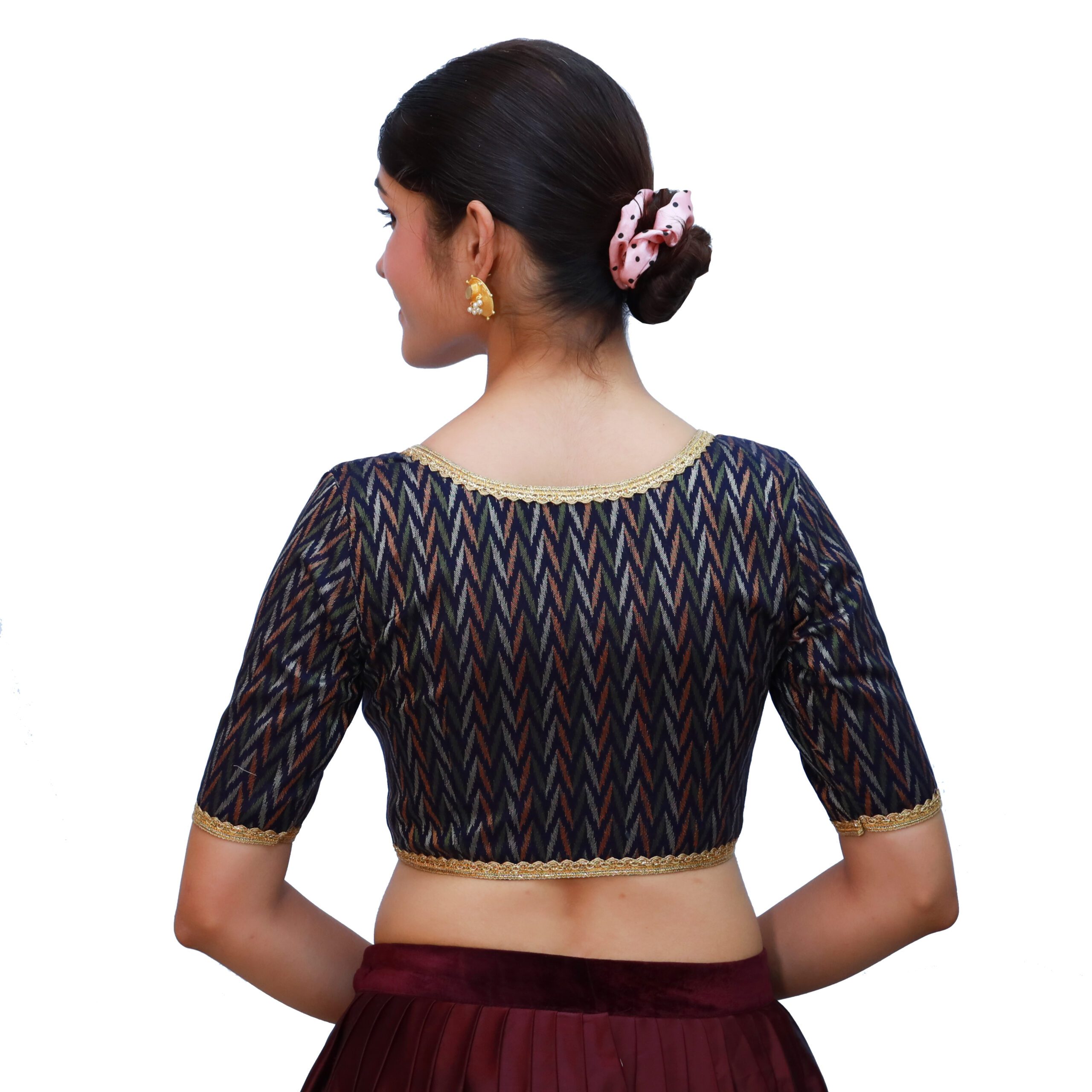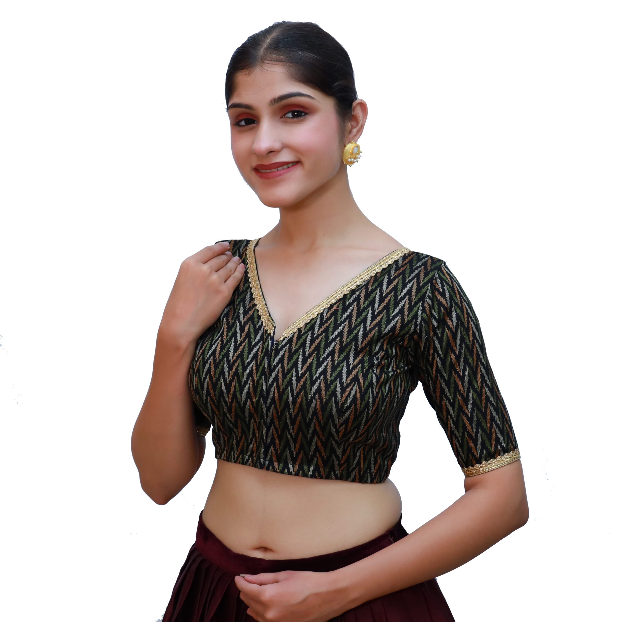 Bring sophistication to your ethnic wardrobe with the black cotton V-Neck blouse, Short Sleeve Saree Blouse from India Blouse. Made with premium cotton fabric in a woven texture, this black cotton V-Neck blouse offers a padded fit for comfort and style. The classic V neckline and lace-embellished short sleeves add elegance, while the front hook-and-eye closure ensures ease of wear. Versatile and chic, this black blouse pairs beautifully with sarees in red, gold, mustard, silver, or contrasting pastels, making it a must-have for weddings, receptions, festivals, and evening events.