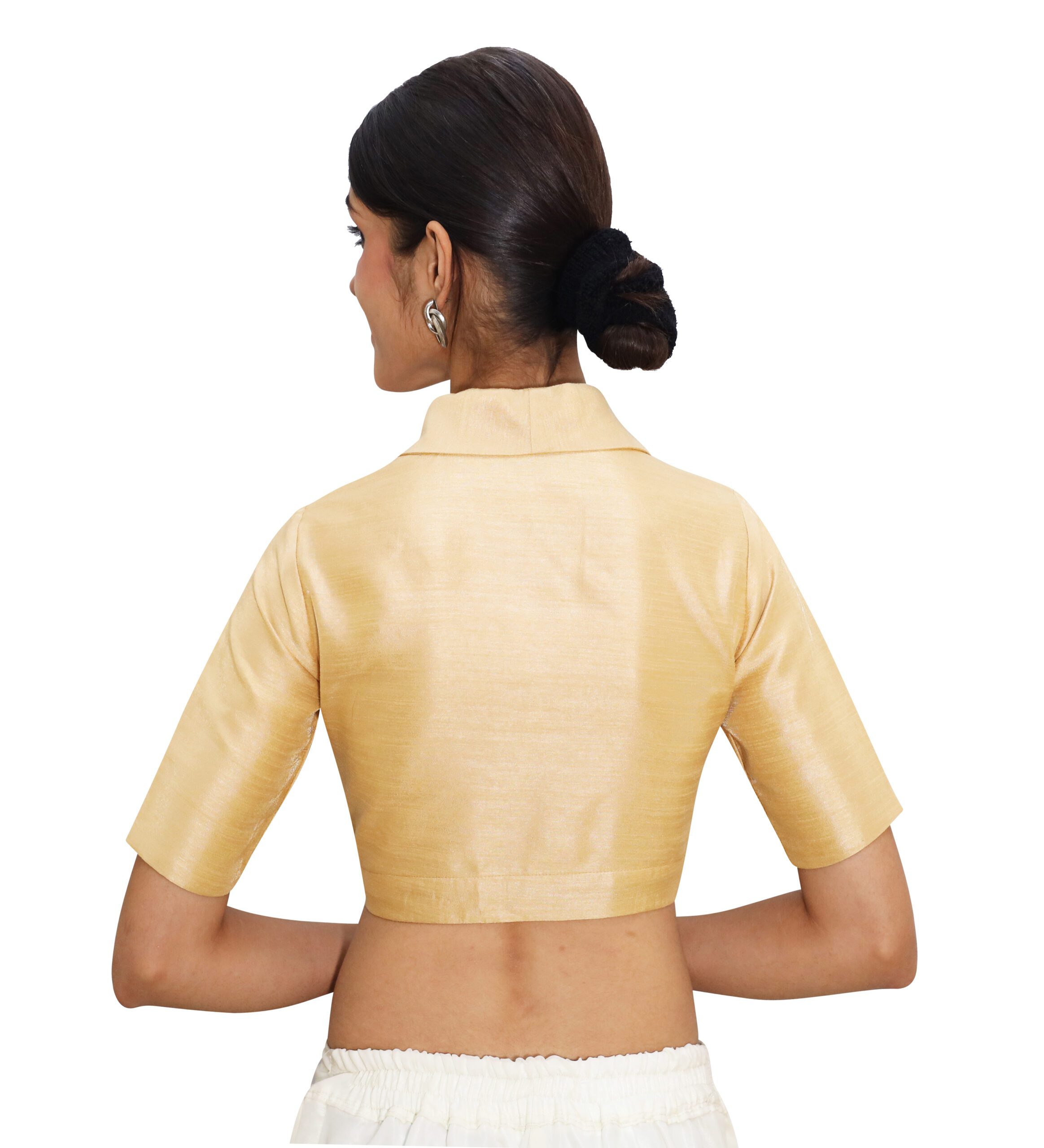 Elegant golden blouse for womenĀ in solid Bangalori silk with crepe lining, featuring a stylish collar neckline, half sleeves, and a front hook closure. Perfect for festive and party looks.