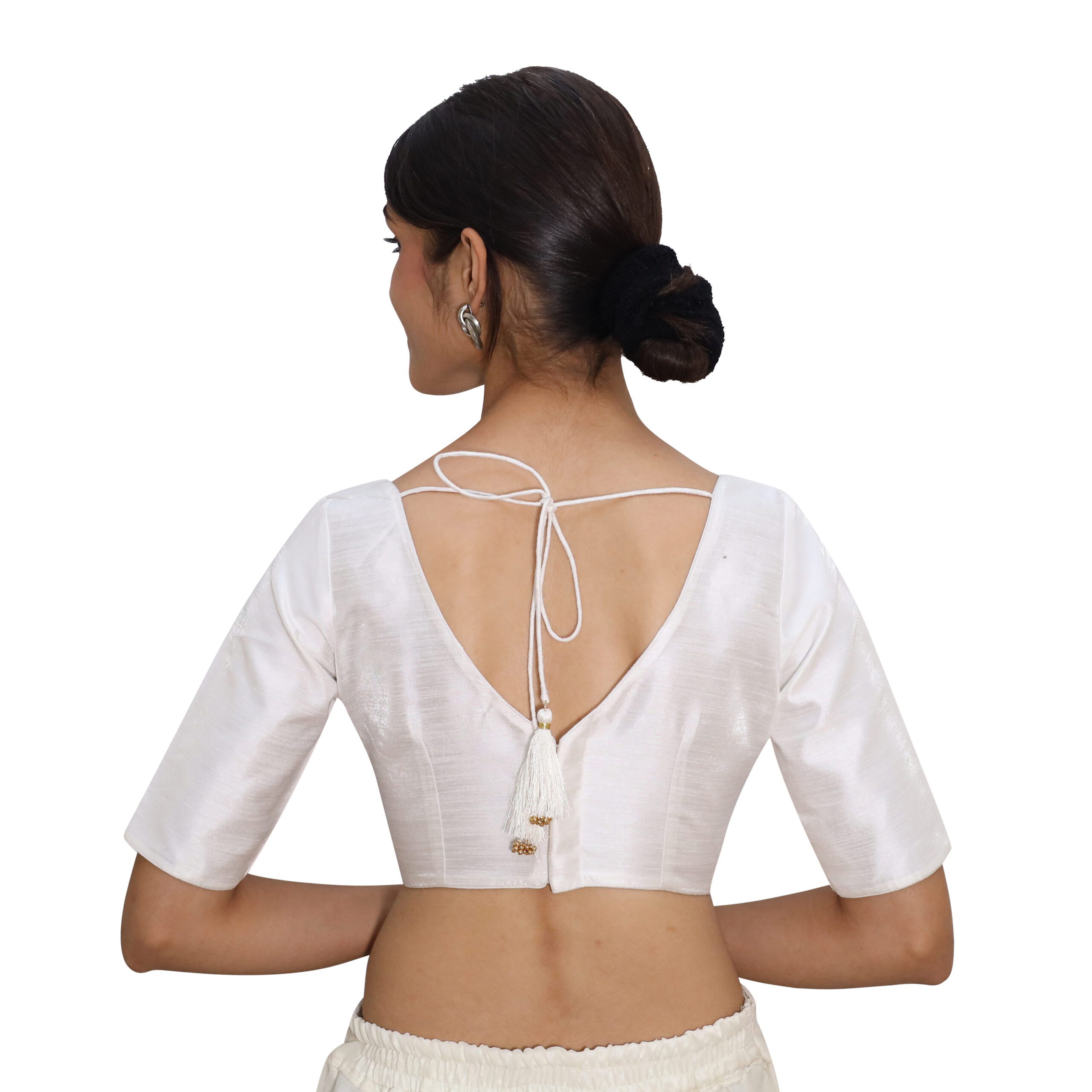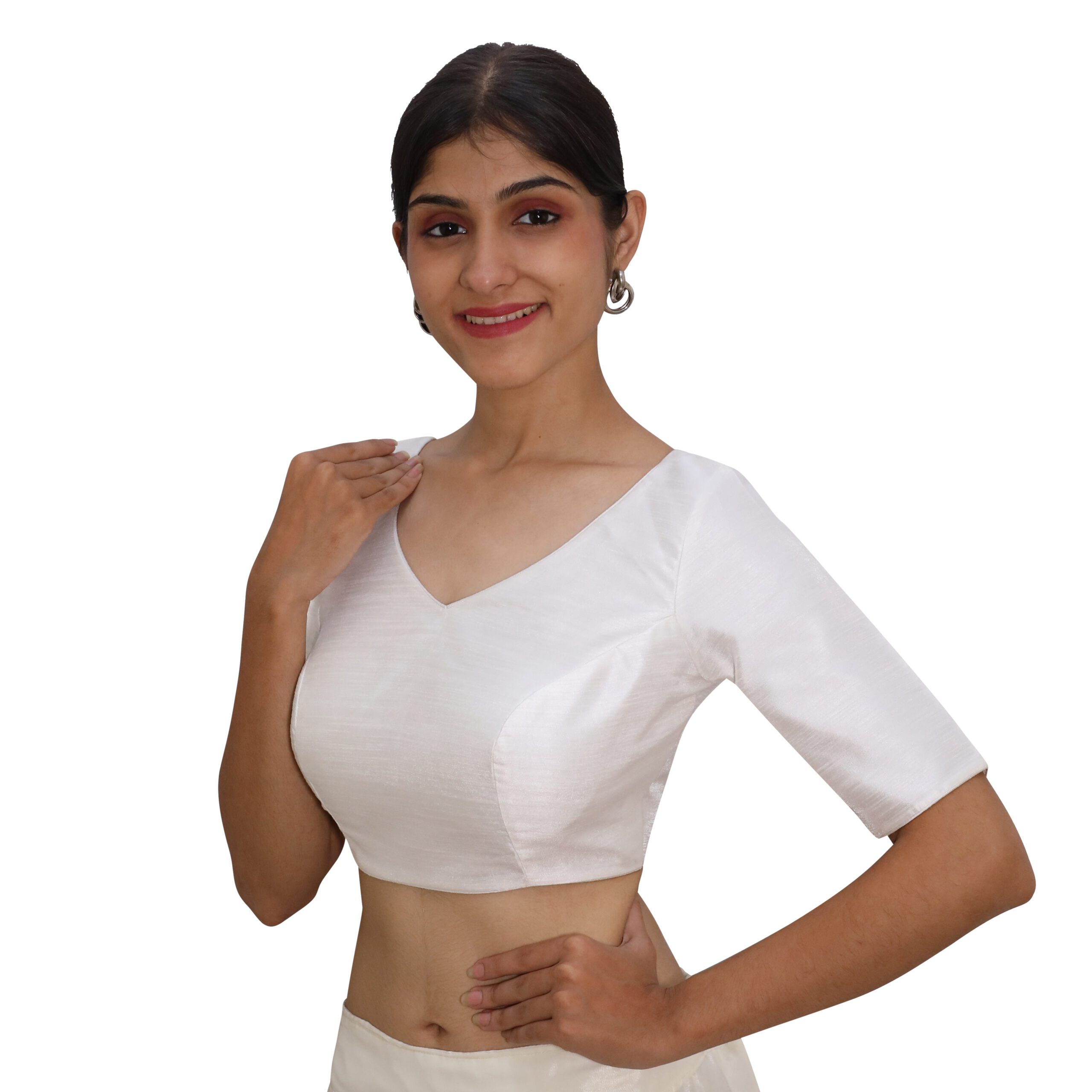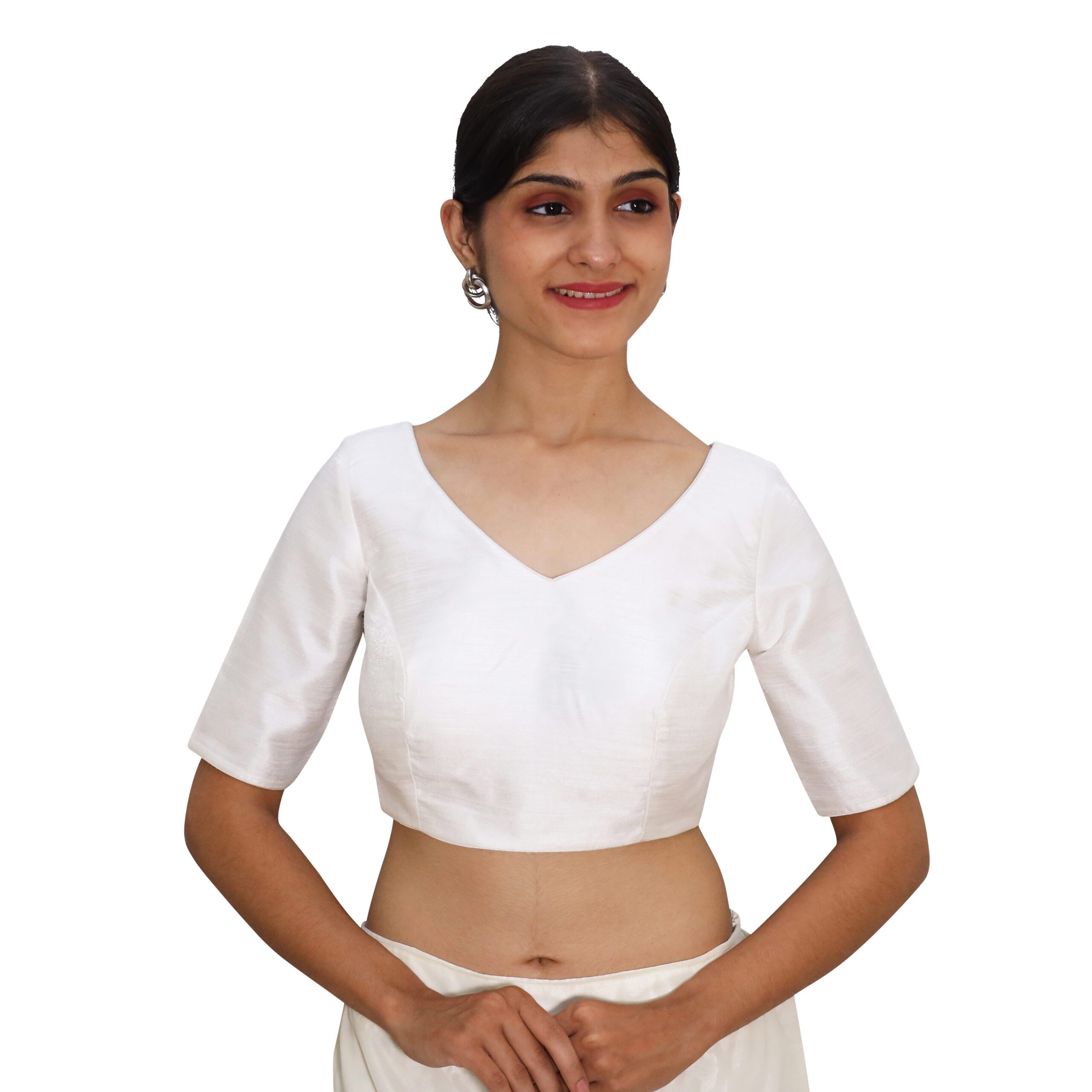 Elevate your wardrobe with this elegant Off-White Silk V Neck Blouse, expertly crafted from premium Bangalori silk with a soft cotton lining. Designed with short sleeves and a classic V-neckline, it features a stylish back hook-and-eye closure for a refined finish. This padded blouse is not only versatile but also an ideal complement to sarees, making it a timeless choice for weddings, festive occasions, and party outfits.