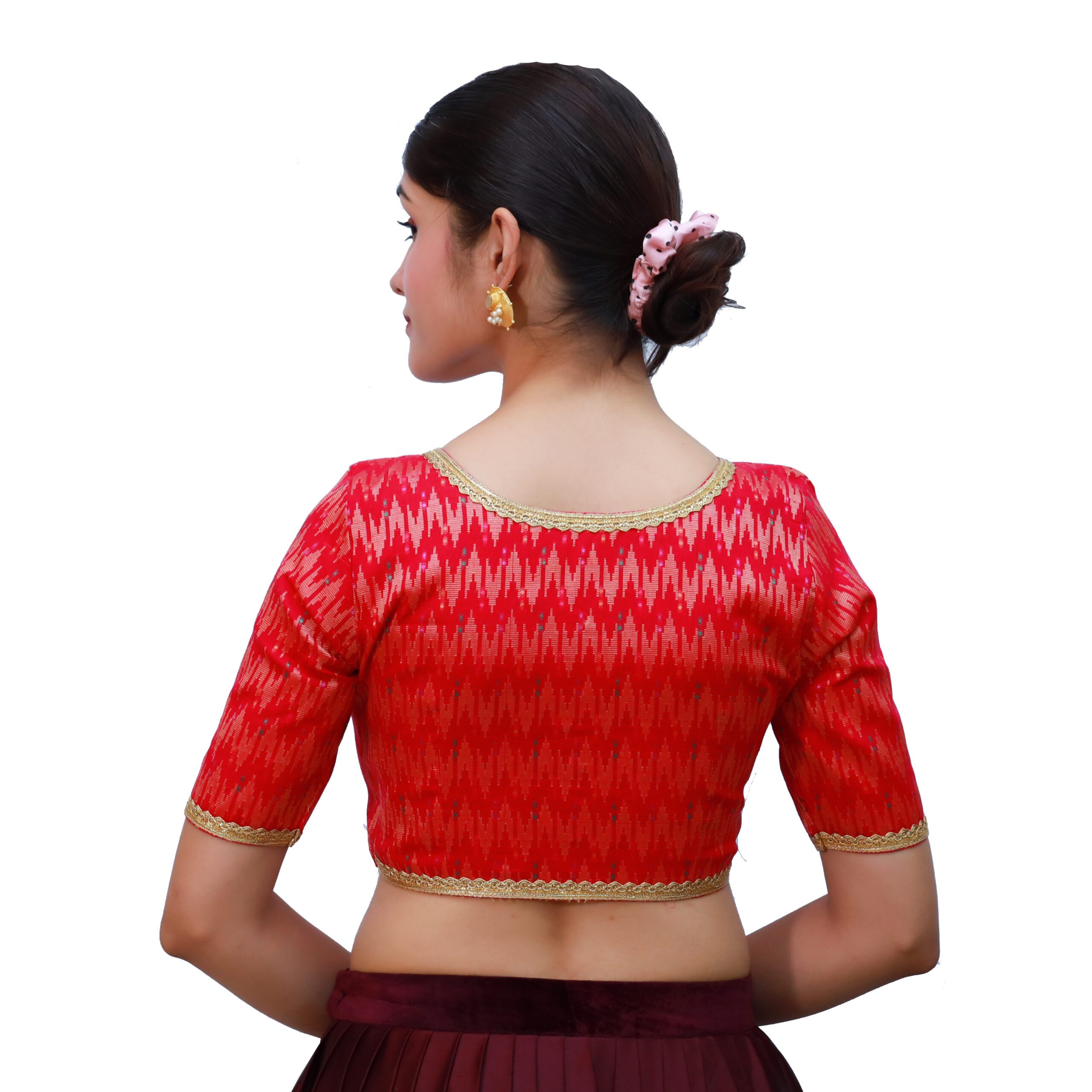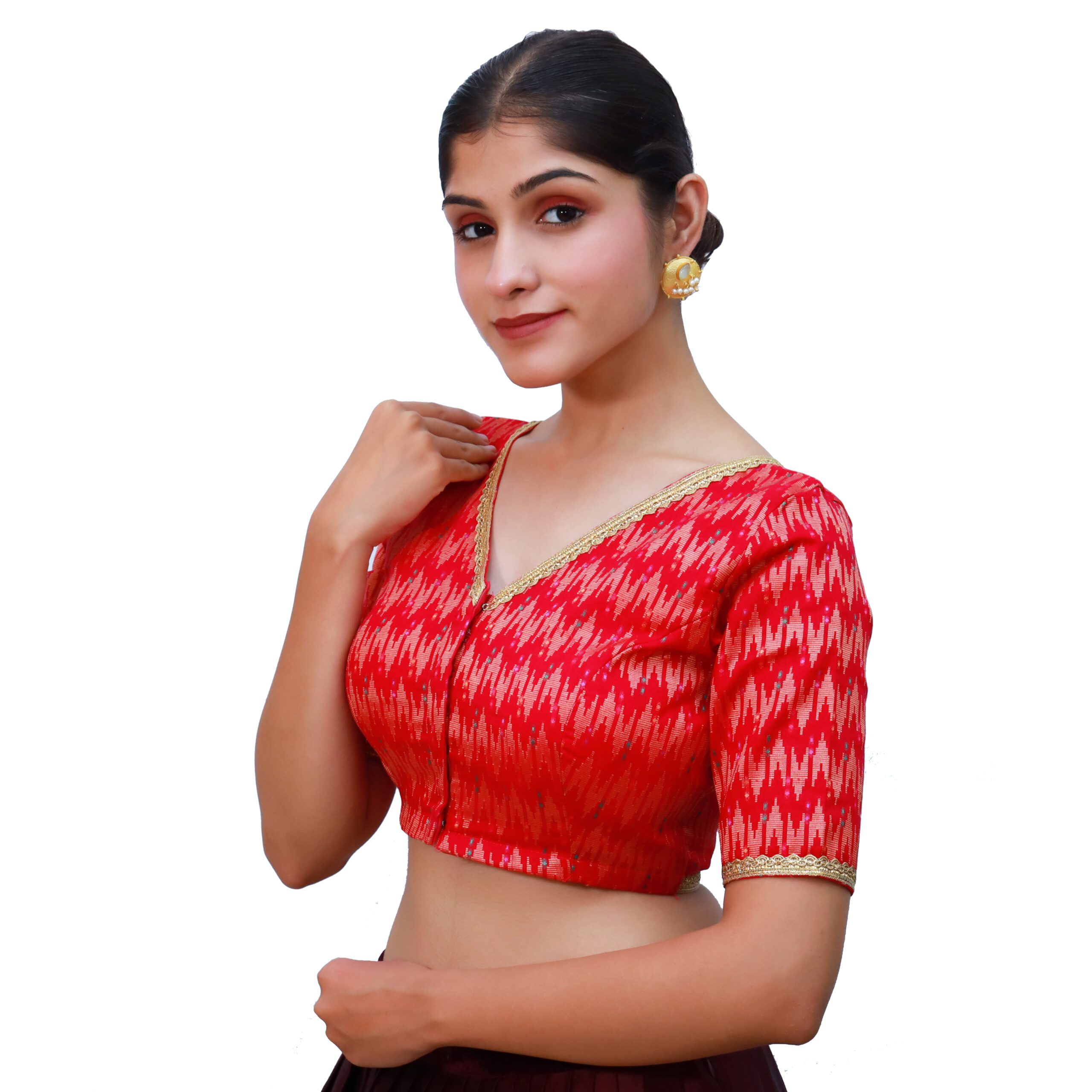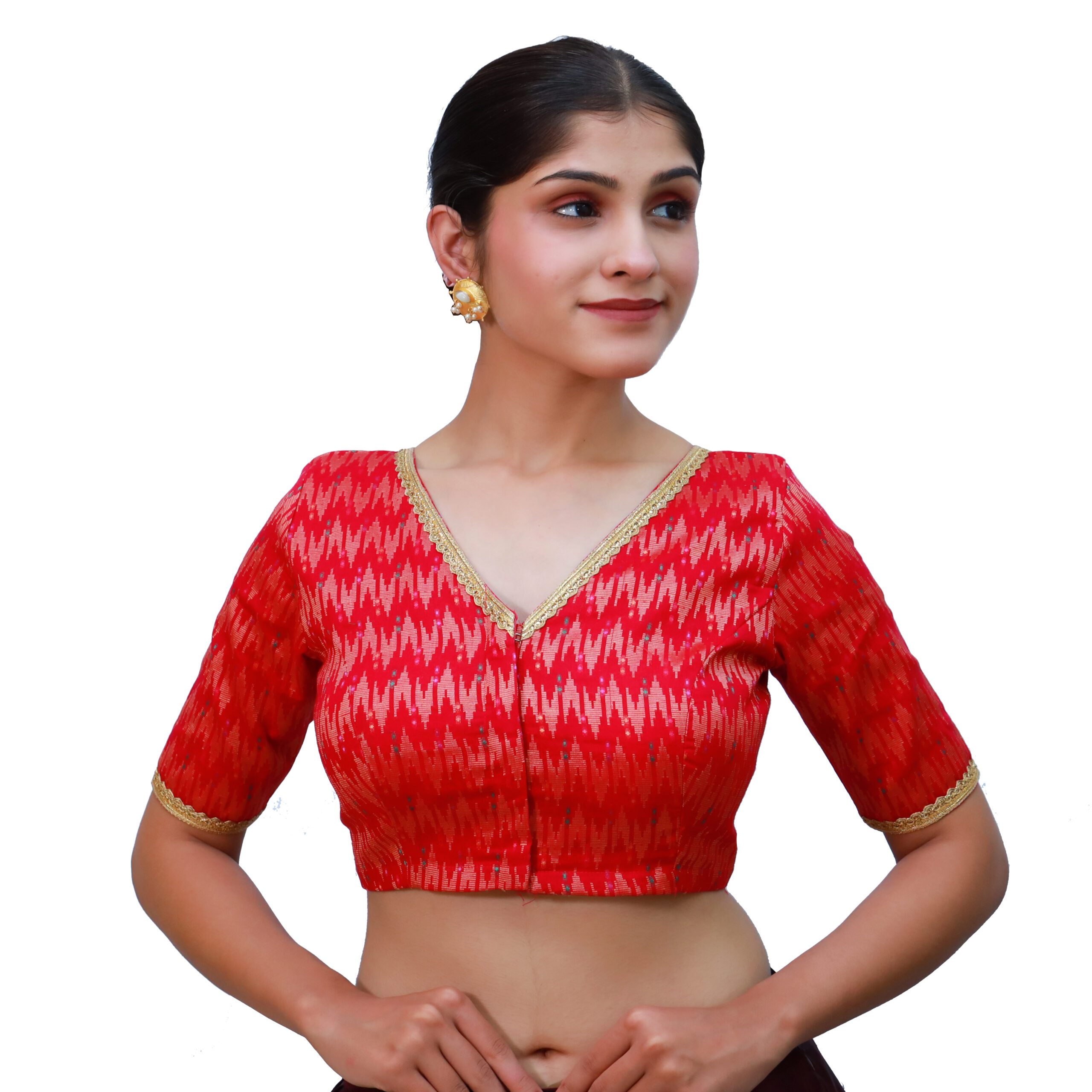 Add elegance to your saree ensemble with this Red V-neck cotton blouse with Short sleeves. ThisĀ padded saree blouse is crafted from a cotton weaving texture. FeaturingĀ short sleeves, lace embellishments, and a front hook-and-eye closure, it’s ideal for weddings, festive occasions, and party wear.