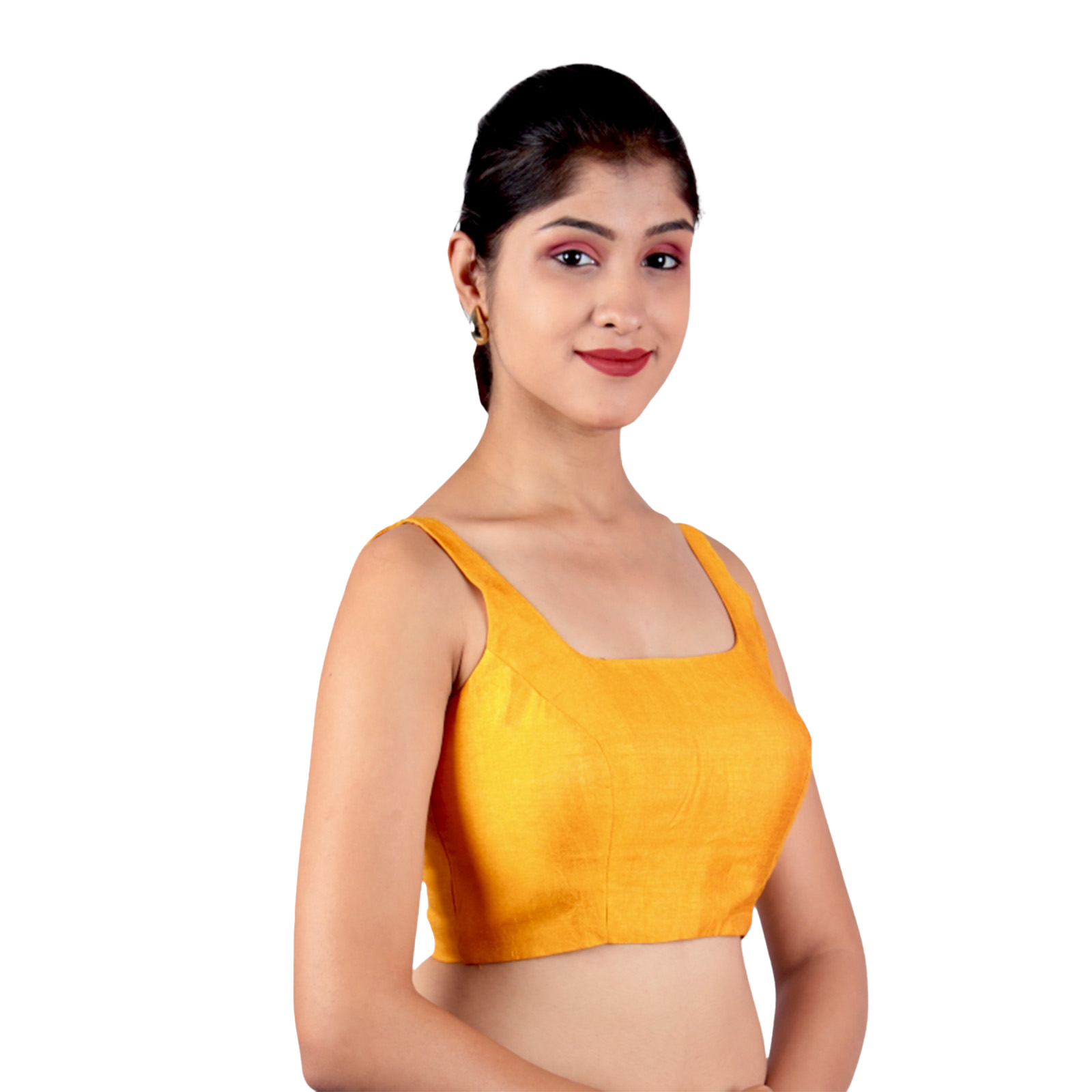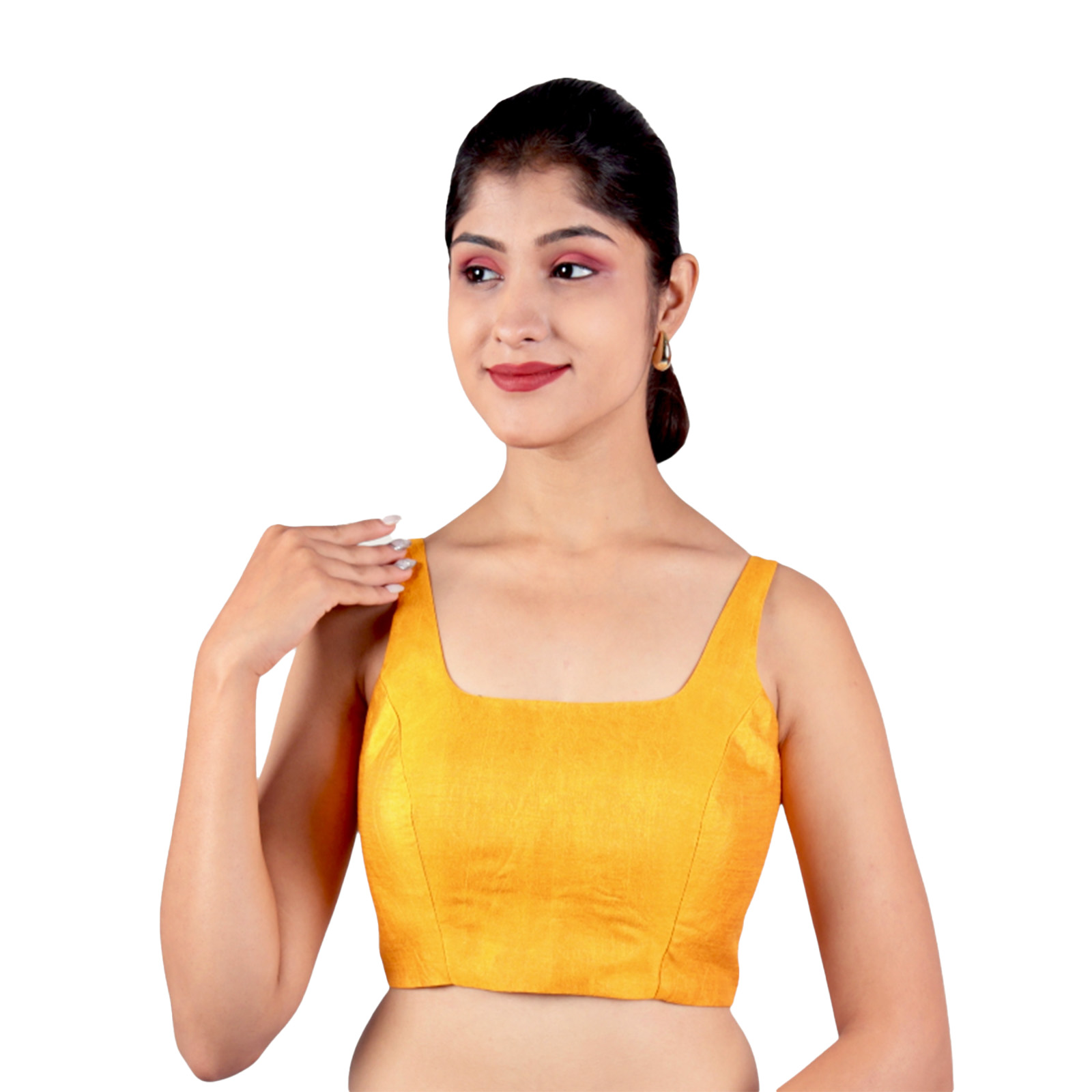Bright and stylish, the Mustard Silk Sleeveless Padded Blouse by India Blouse is designed to bring elegance and comfort together. Crafted from premium Bangalori silk with cotton lining, this mustard silk sleeveless padded blouse ensures a rich finish and breathable comfort. The padded fit gives structure, while the sleeveless style offers a modern, chic appeal. Its classic U-neck design flatters all saree drapes, and the back hook-and-eye closure ensures a secure and easy fit. The versatile mustard yellow shade pairs beautifully with contrasting sarees in maroon, black, green, or cream, making it perfect for weddings, festive occasions, receptions, and parties.