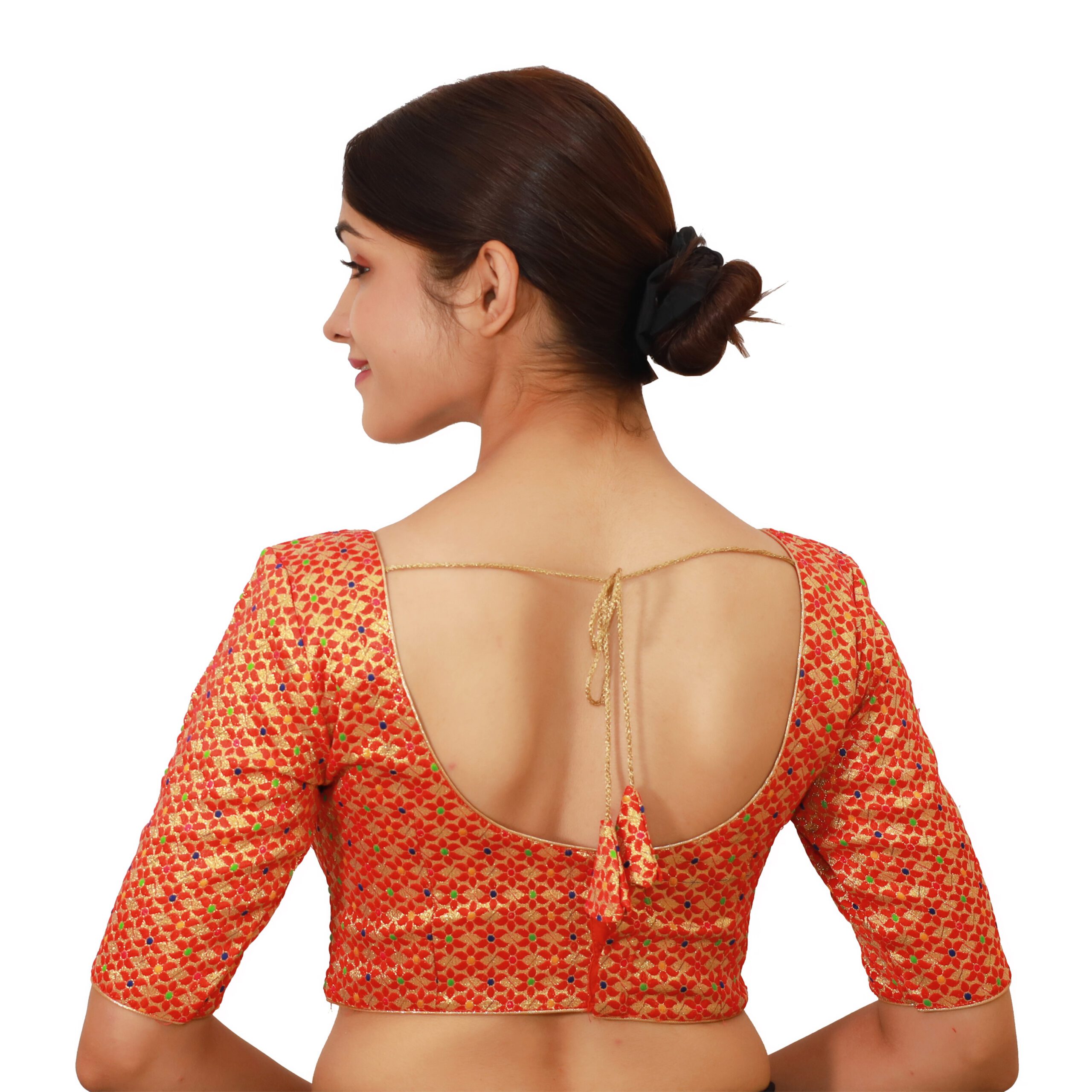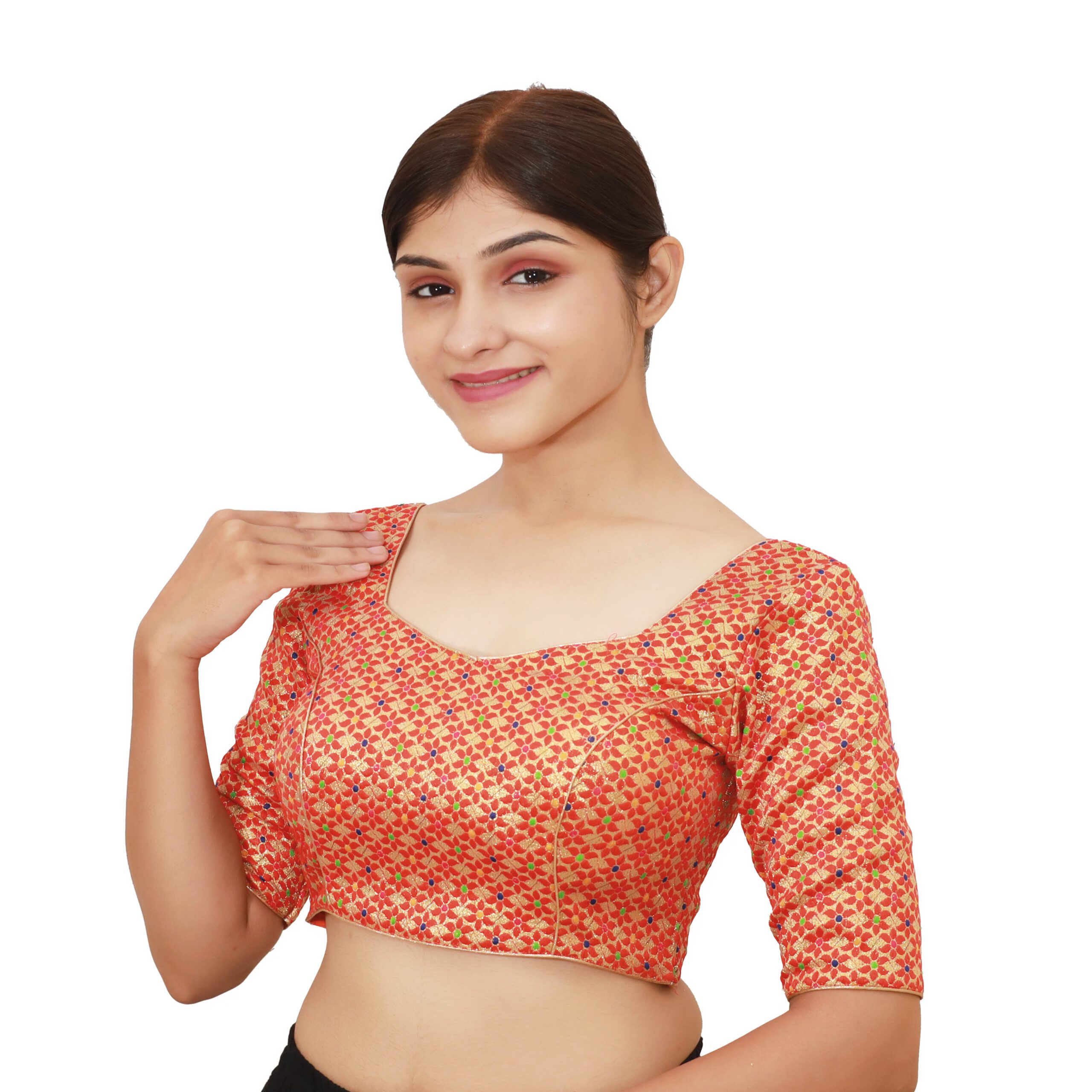 Turn heads with the red sweetheart neck blouse for women from India Blouse. Crafted from premium brocade fabric and lined with soft cotton, this designer blouse for women combines comfort, elegance, and a luxurious finish. The graceful sweetheart neckline beautifully frames your look, while the short sleeves add a touch of timeless traditional charm.