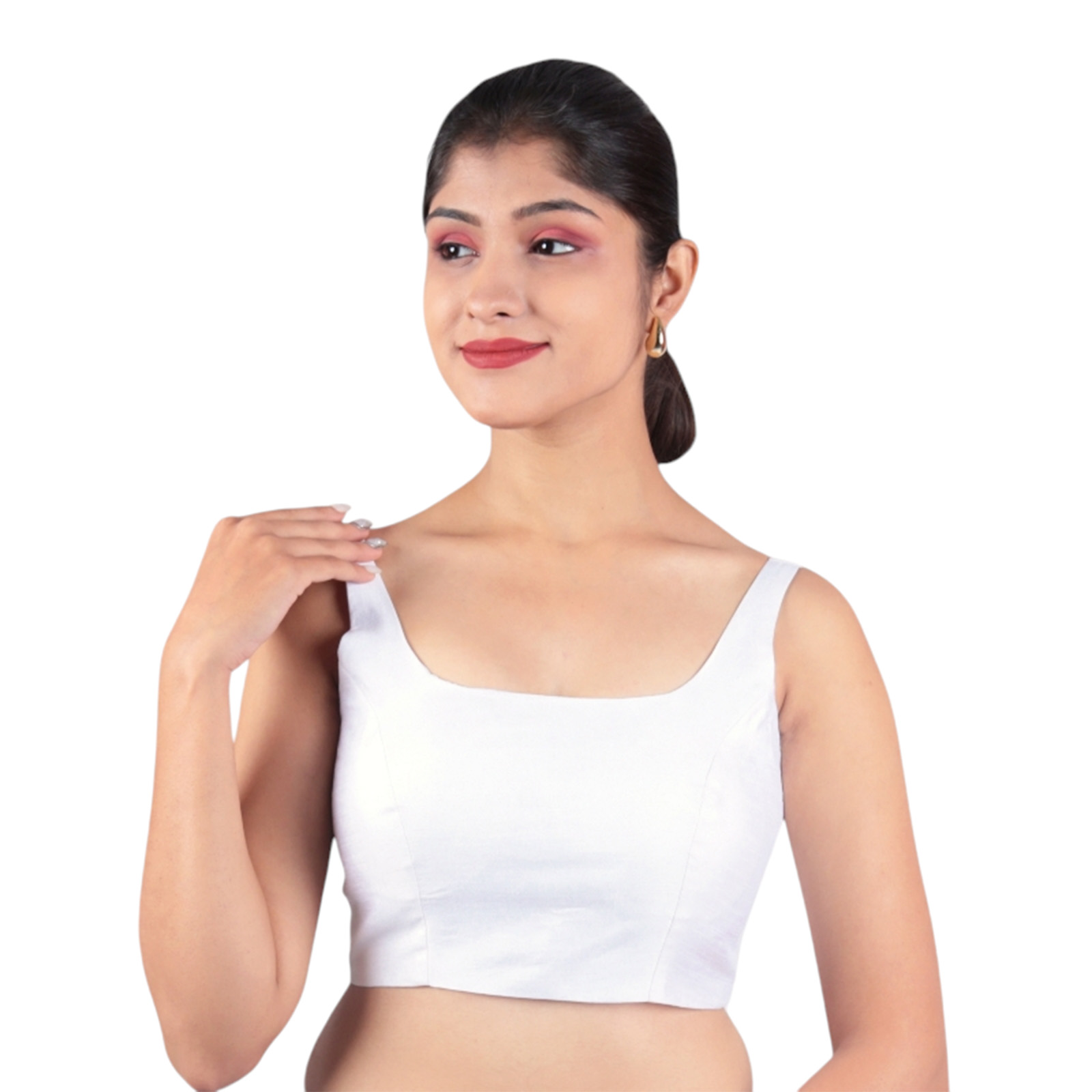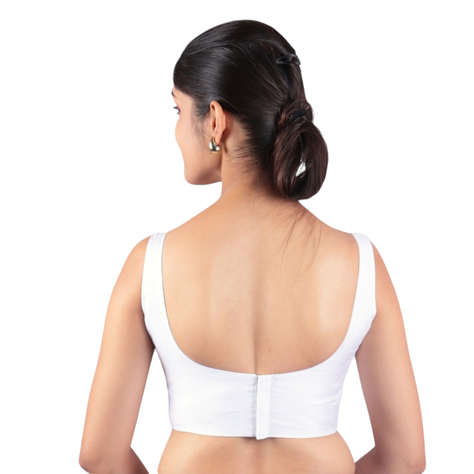 The white silk sleeveless padded blouseĀ by India Blouse is a must-have for every saree lover. Crafted from luxurious Bangalori silk with a soft cotton lining, this white silk sleeveless padded blouse delivers both comfort and style. Its padded design ensures a smooth, tailored fit, while the sleeveless cut and U-neckline bring in a modern, versatile charm. The classic white color makes it easy to pair with vibrant silks, subtle pastels, and rich embroidered sarees, giving you endless styling possibilities. Whether itās a wedding, festive celebration, evening party, or reception, this blouse is designed to make you look effortlessly graceful.