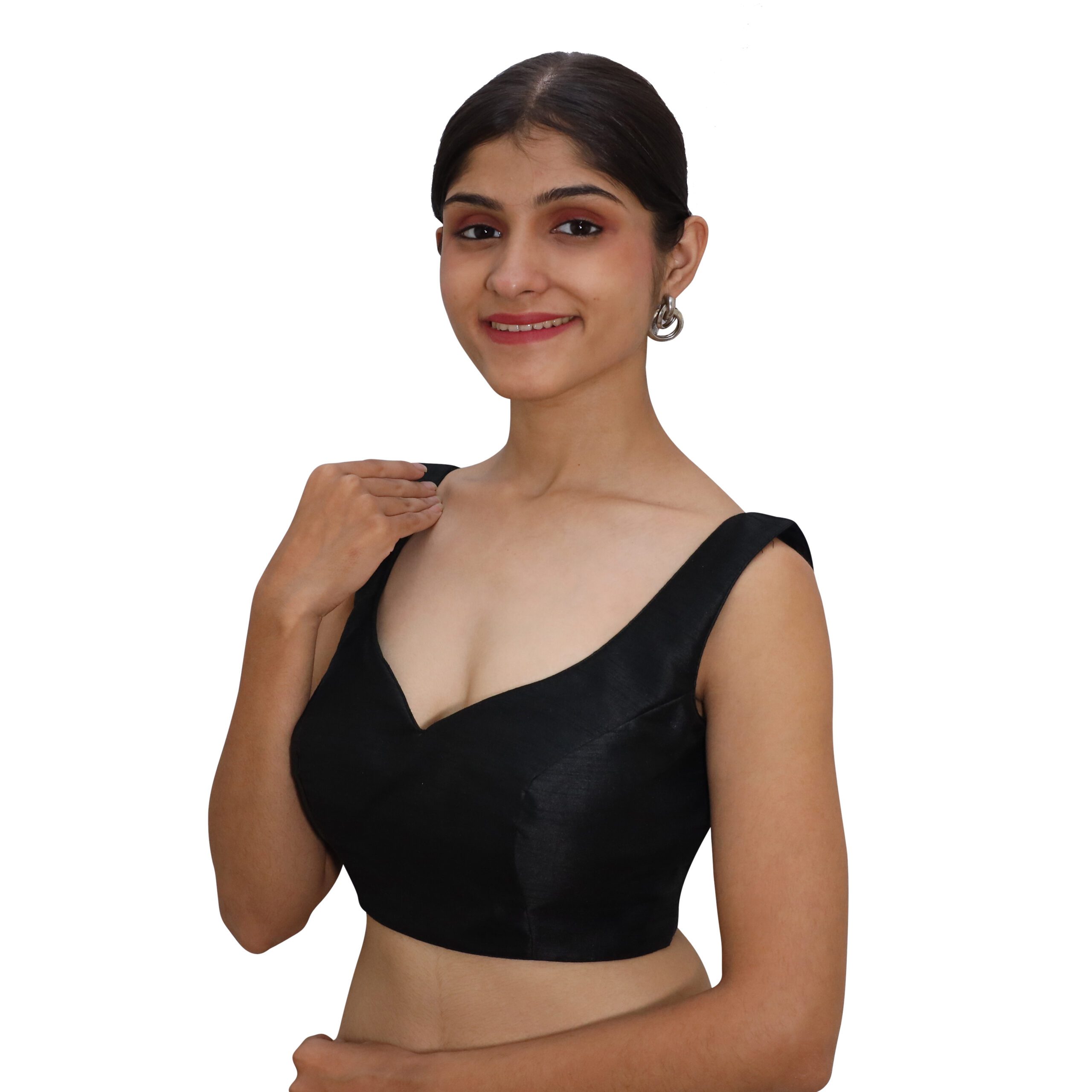 Elevate your wardrobe with this Art Silk Black Sleeveless Sweetheart Blouse. Perfect for women, this padded saree blouse in Bangalori silk with crepe lining is ideal for festive occasions, bridal events, or chic party wear. Its elegant design also makes it a great choice for office wear. Pair it with a golden saree for a luxurious touch. A must-have trending blouse that combines comfort and style! Classic and versatile Black Sleeveless Sweetheart Neck Padded Saree Blouse in Bangalori silk with crepe lining, designed for festive, bridal, and party wear looks.