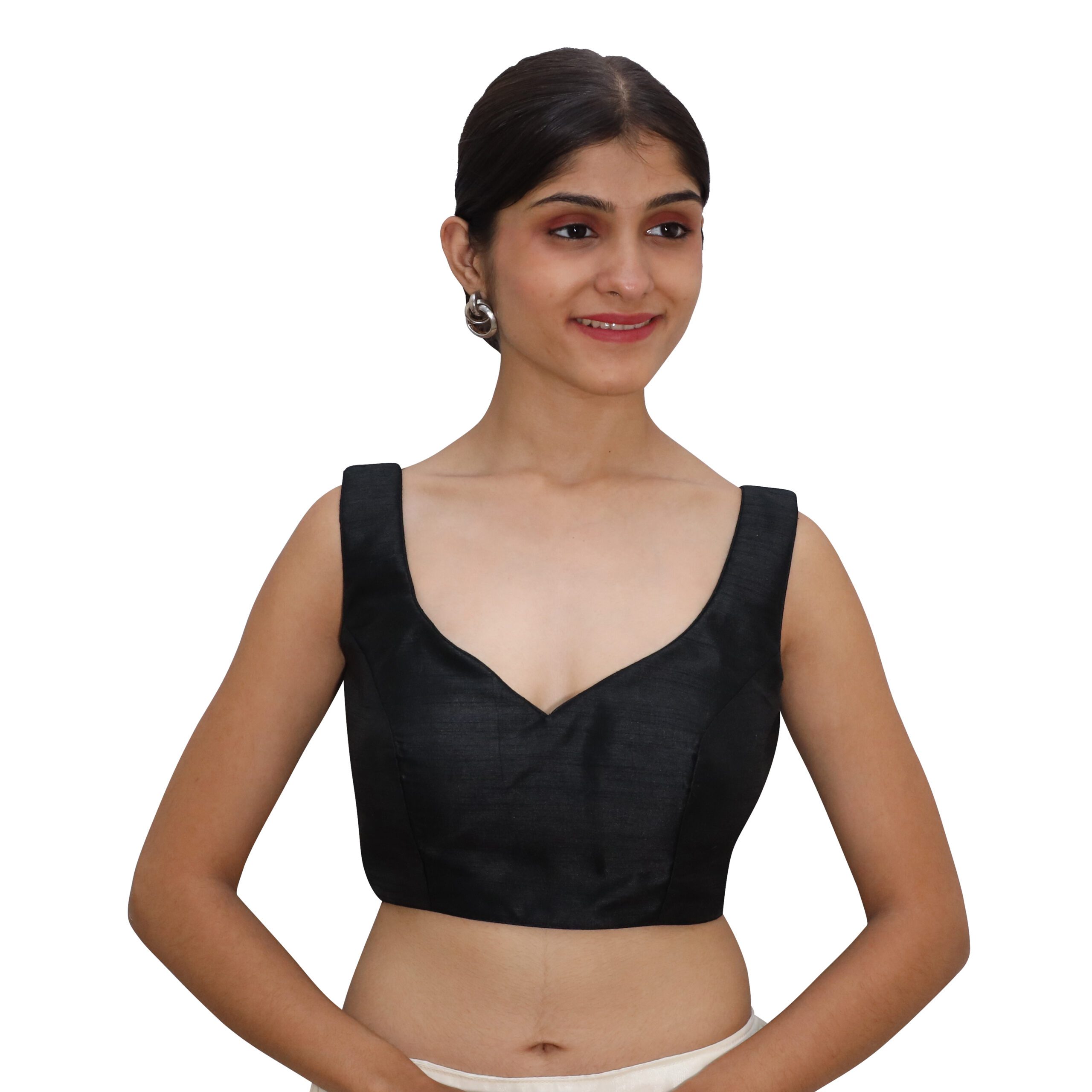 Upgrade your ethnic wardrobe with the timeless black sleeveless sweetheart blouse for women from India Blouse. Designed for women who love elegance and versatility, this blouse features a premium Bangalori art silk black sleeveless sweetheart blouse paired with a soft crepe lining for exceptional comfort and a luxe feel.