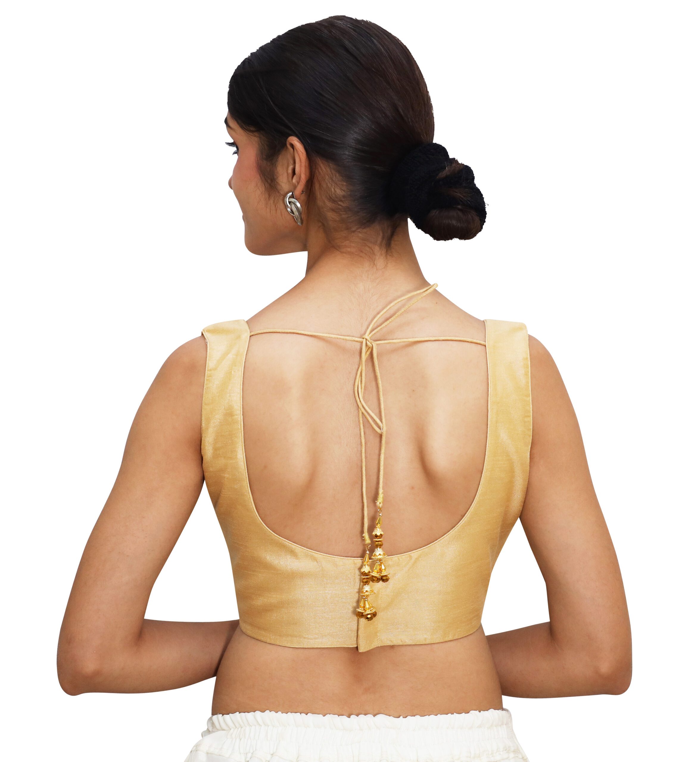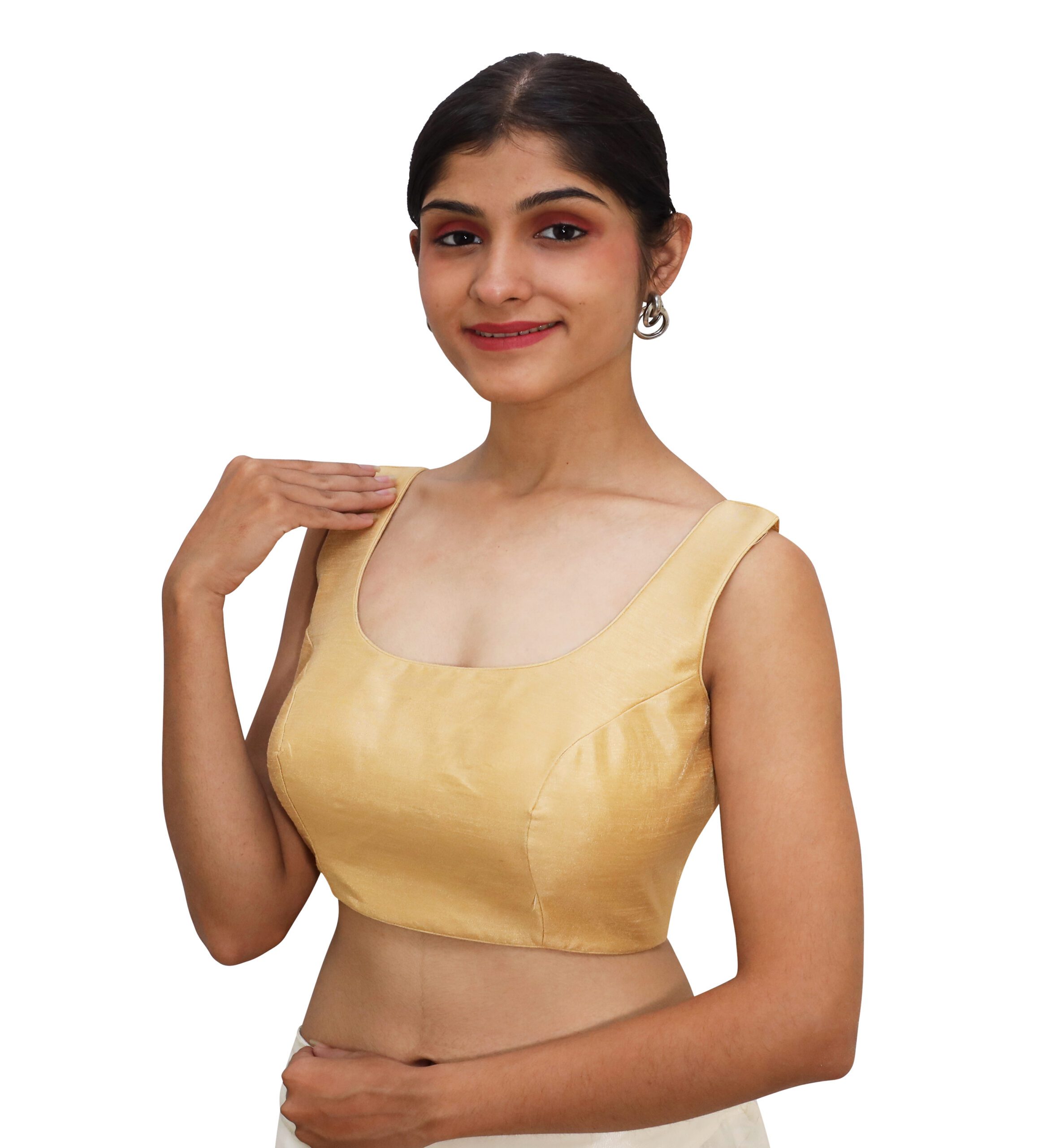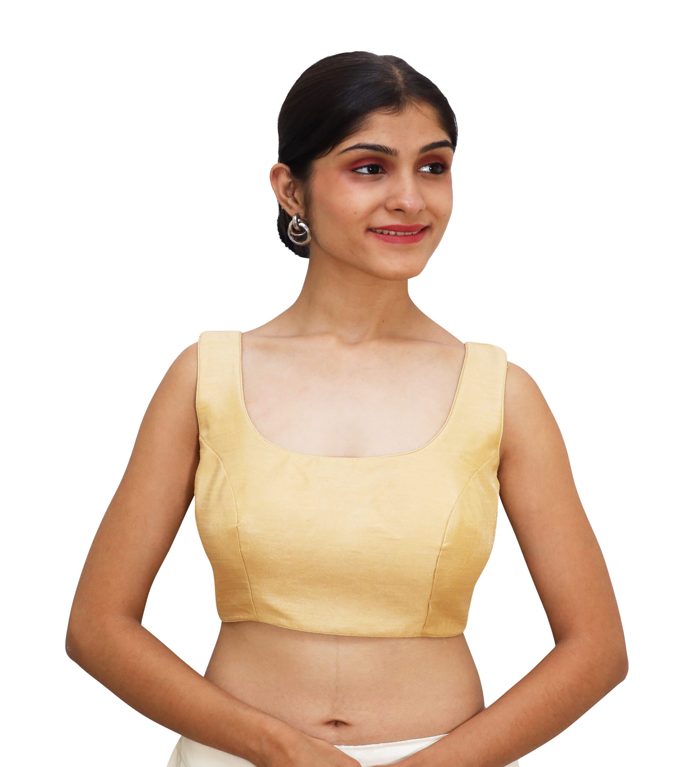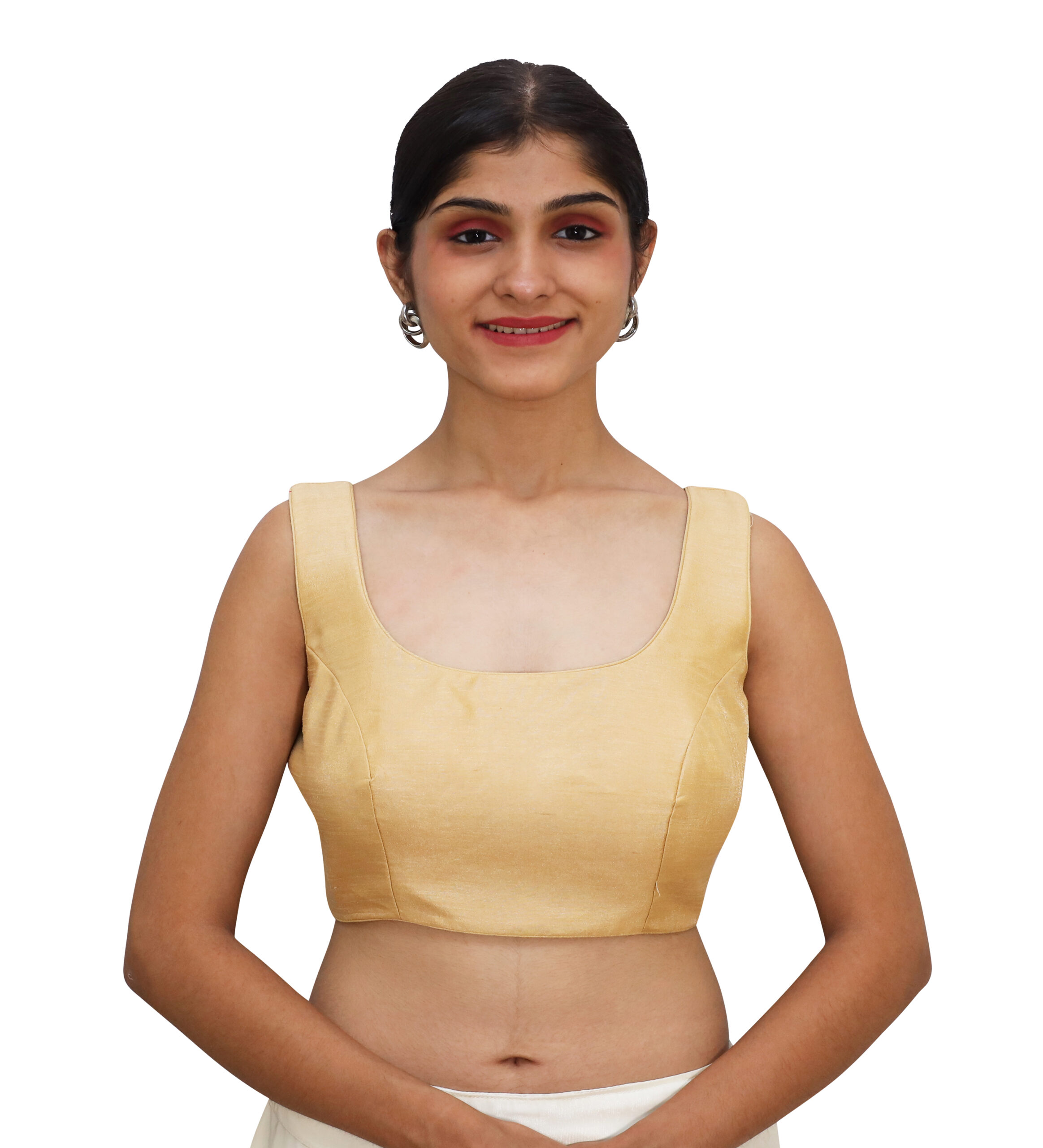 Add a touch of timeless elegance to your saree look with the gold sleeveless silk round neck blouse from India Blouse. Crafted from luxurious Bangalori silk, this gold sleeveless silk round neck blouse offers a smooth and lustrous finish. The round neckline and sleeveless cut create a classic yet contemporary design, making it versatile for styling with both traditional and designer sarees. Its padded structure ensures comfort and a perfect fit, while the back hook-and-eye closure adds convenience. Ideal for weddings, parties, festive occasions, and receptions, this golden blouse pairs beautifully with contrasting or matching sarees in vibrant shades, making it a must-have wardrobe staple.
