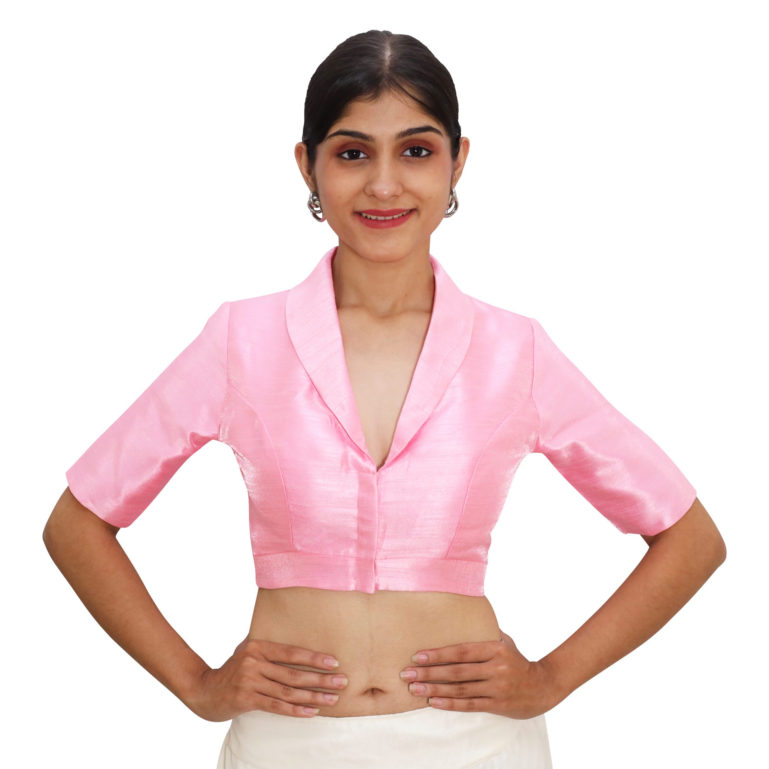 Bring timeless charm to your saree looks with this Pink Collar Neck Blouse from India Blouse. Expertly crafted from luxurious Bangalori silk with a soft crepe lining, this designer blouse for women ensures both comfort and long-lasting durability. The chic collar neckline adds a modern edge to the classic blouse silhouette, while the half sleeves provide versatile styling for festive or casual occasions.