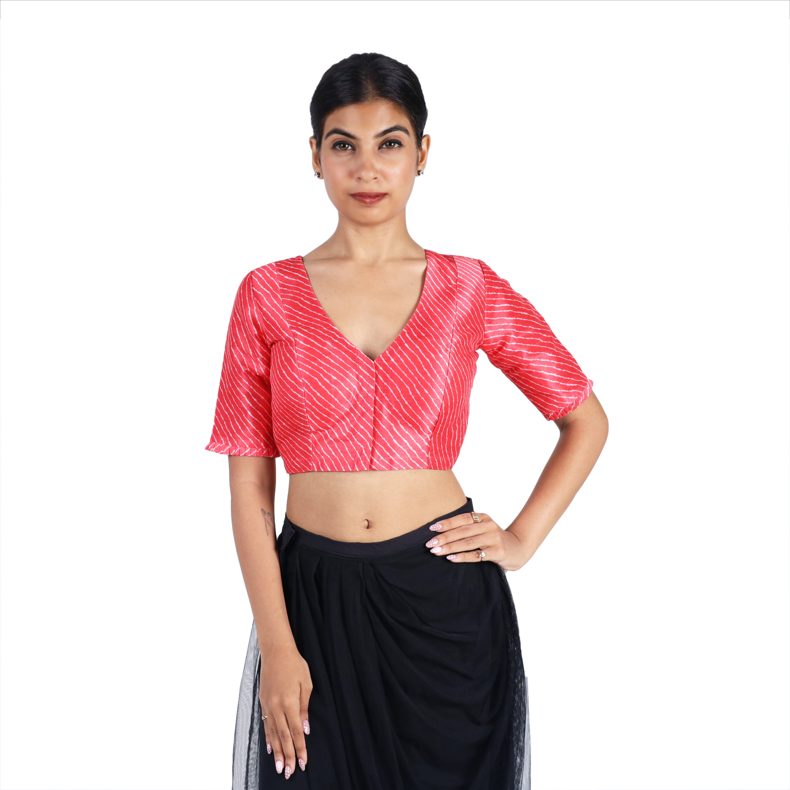 Turn heads with the Tussar Silk Red Striped V-Neck Saree Blouse for Women, crafted in rich tussar silk with cotton lining. Designed with frilled short sleeves, a modern V-neckline, and a secure front hook closure, this non-padded blouse by India Blouse is perfect for sarees, lehengas, and festive occasions.